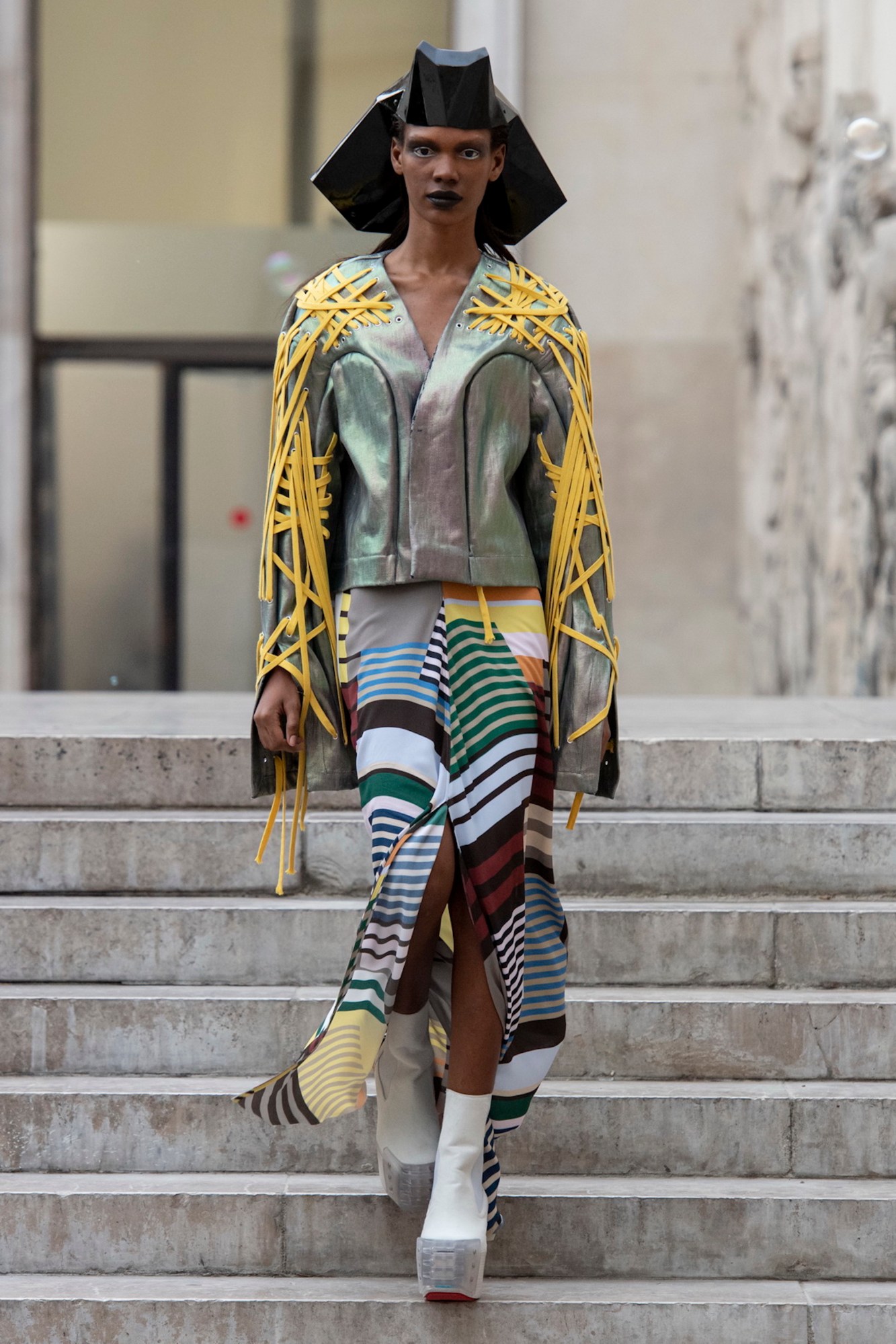 Pooling together those references and transforming it into an energetic collection was what made the show so prescient. There wasn’t a raging anger about what’s going on politically — rather, it was simply present as a backdrop to a deeply heartfelt expression of beauty. Borders are being closed, walls are being built, stereotypes about cultures and races are being perpetuated — but the point is that this was a celebration of the rich tapestry of cross-cultural exchange, underscored by the “bucolic lightheartedness” of the bubbles. Rick may have mentioned Fantasia, and those bubbles certainly brought out the child in every member of the audience. There were even opulent mega-pleated Watteau-back gowns, sweeping fairytale princess dresses. But this was a Rick Owens show, where nothing comes without a razor-sharp edge of intellect. The bubbles pop, after all, and those dresses are a reminder that we’re living in a dark tale that may not have a happy ending.