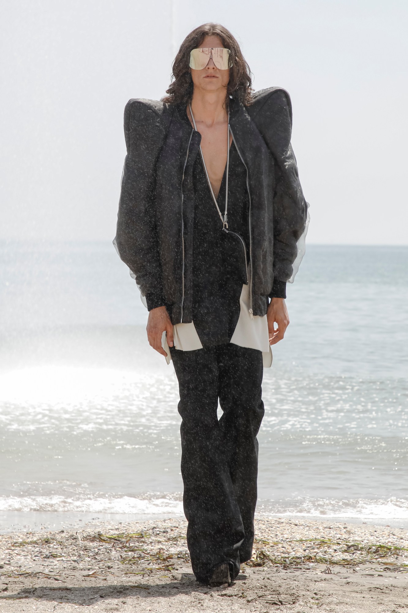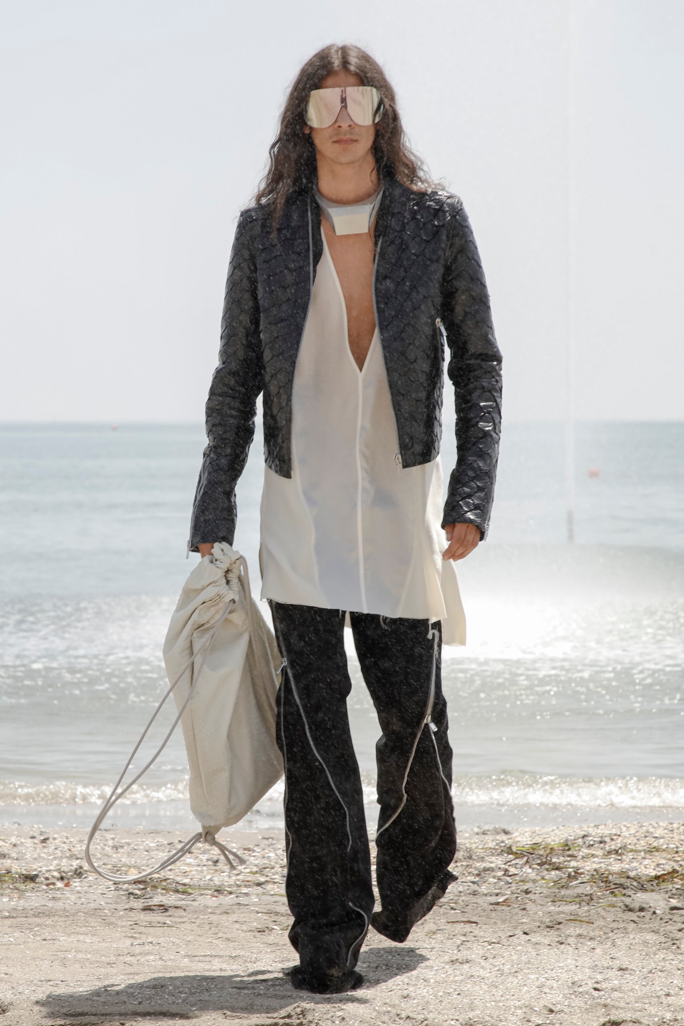 Don’t get us wrong, the cocksure glam-rock sex that Rick has long since made the currency he trades in was there in abundance, too. Webbed white vests clung to the torso, skirting the nipples and swooping below the navel; the linebacker-shouldered tailoring that’s recurred across the past few seasons returned as sleeveless blazers with yawning armholes; and this season’s cropped leather jackets were crafted in a pirarucu dragon scale leather, a food byproduct produced by Indigenous communities in Brazil.