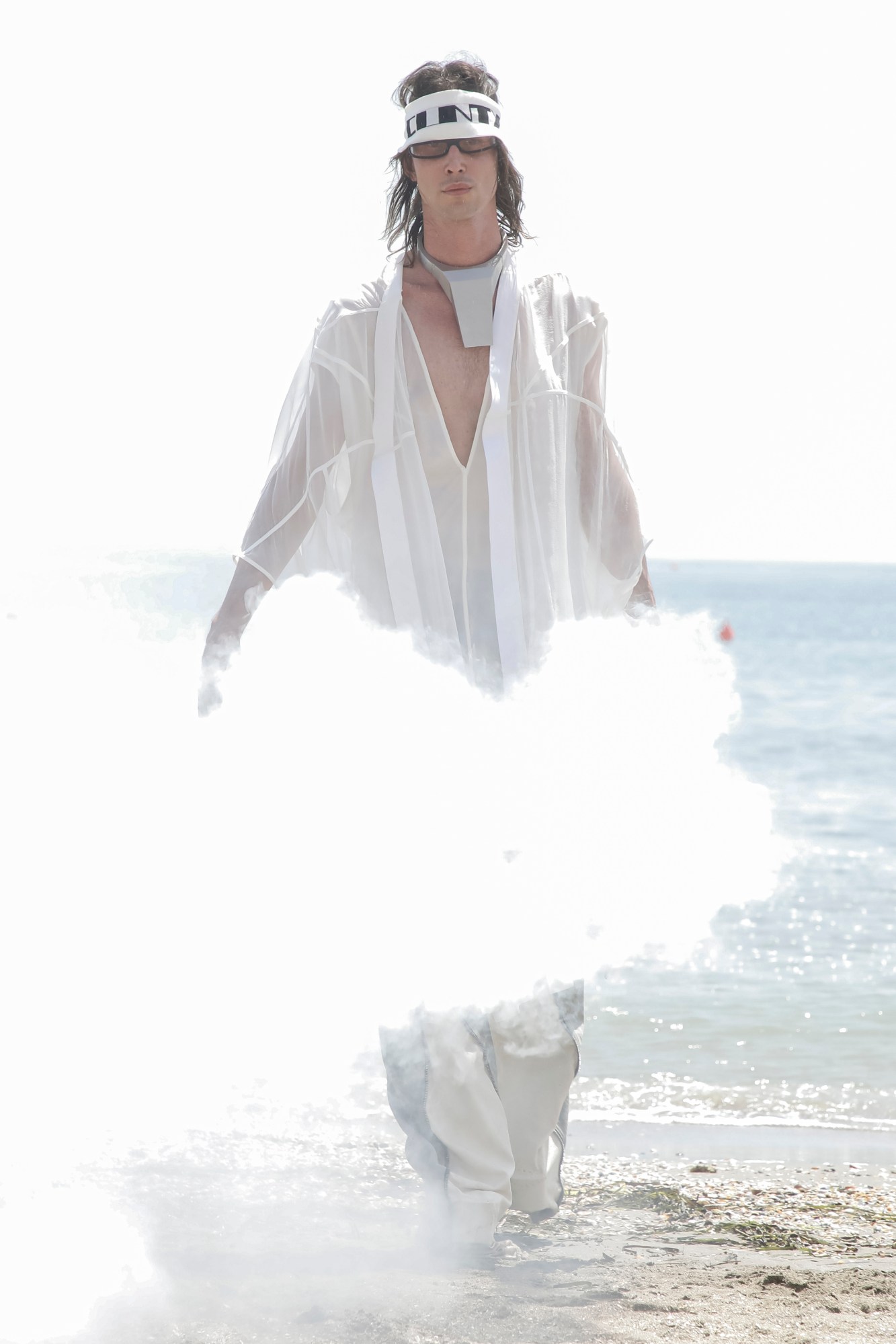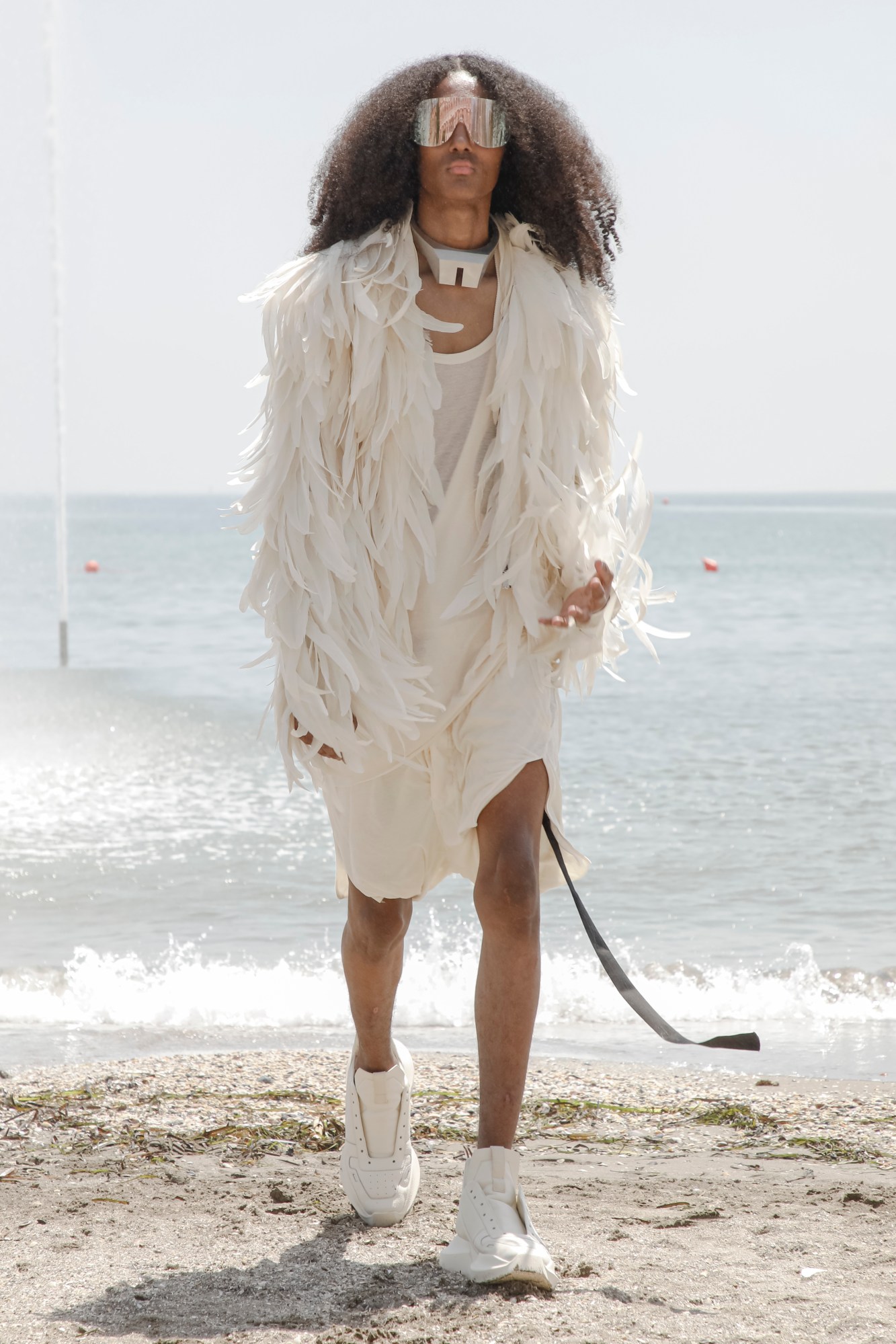 This expectedly hedonistic spirit, though, was tempered by an almost floral sensibility. “White-magic-houses-of-the-holy-stairway-to-heaven hippies wear baggy, dragging flares over platforms,” as Rick himself wrote in the show notes, their hems soaking saltwater and sand as the models strode along the shore. This insouciance was mirrored in shirting and jackets in wispy chiffons and organdies, and even a hand-knotted coq feather jacket, created in collaboration with Maison Février, Josephine Baker’s former plumassier.
