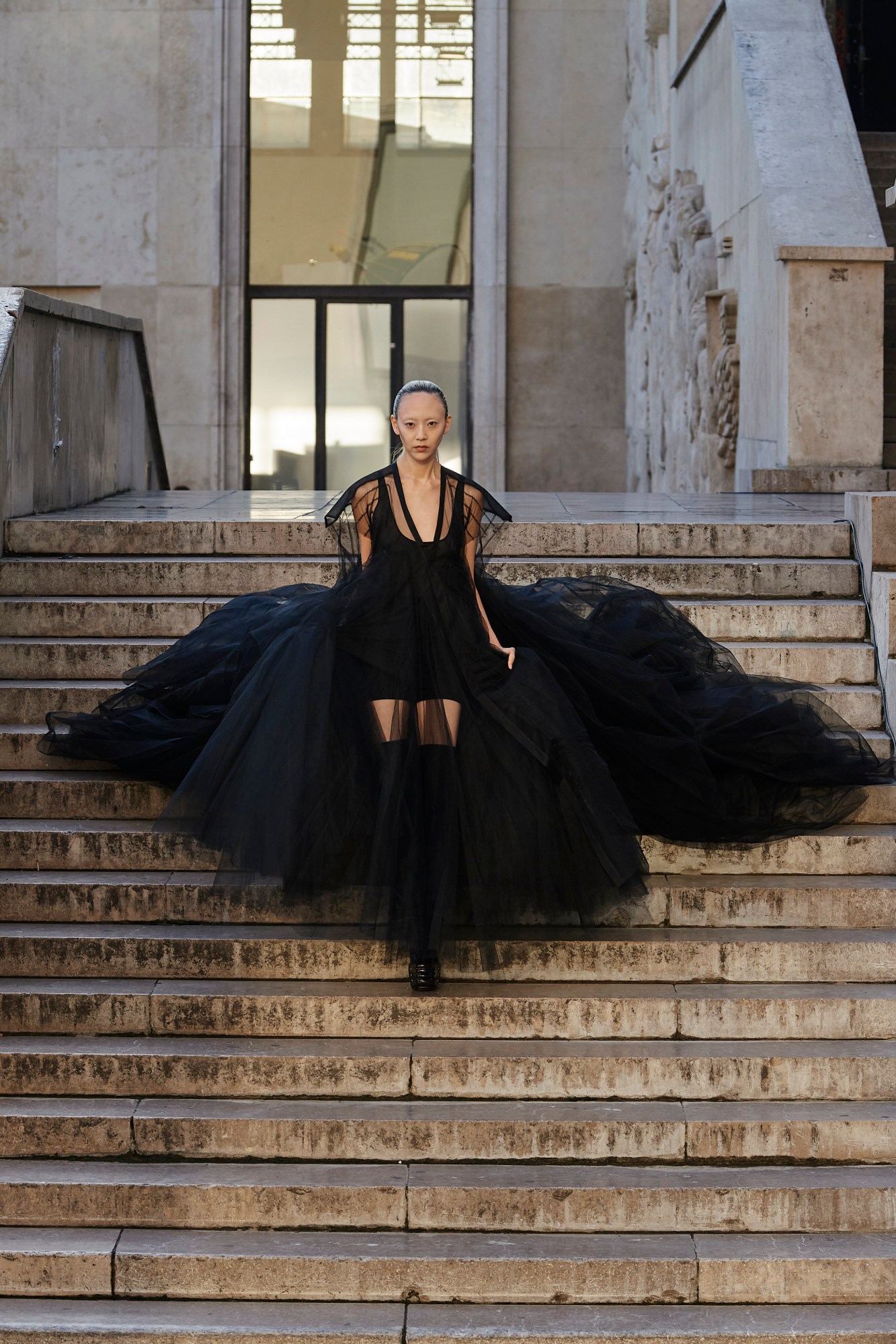 His last show took the same title, and was staged in the same courtyard of the Palais de Tokyo, where three giant globes were elevated to the heavens by machine-operated cranes, set alight, and then dropped in all their flaming glory into the vast courtyard fountain. But whereas that show conjured scenes of Armageddon, flaming suns crashing down to earth, and “the cycles of evil and useless destruction just repeating over and over since the beginning of time,” according to Rick — this show, by contrast, seemed to offer something optimistic, perhaps even hope. Divinely feminine, even.