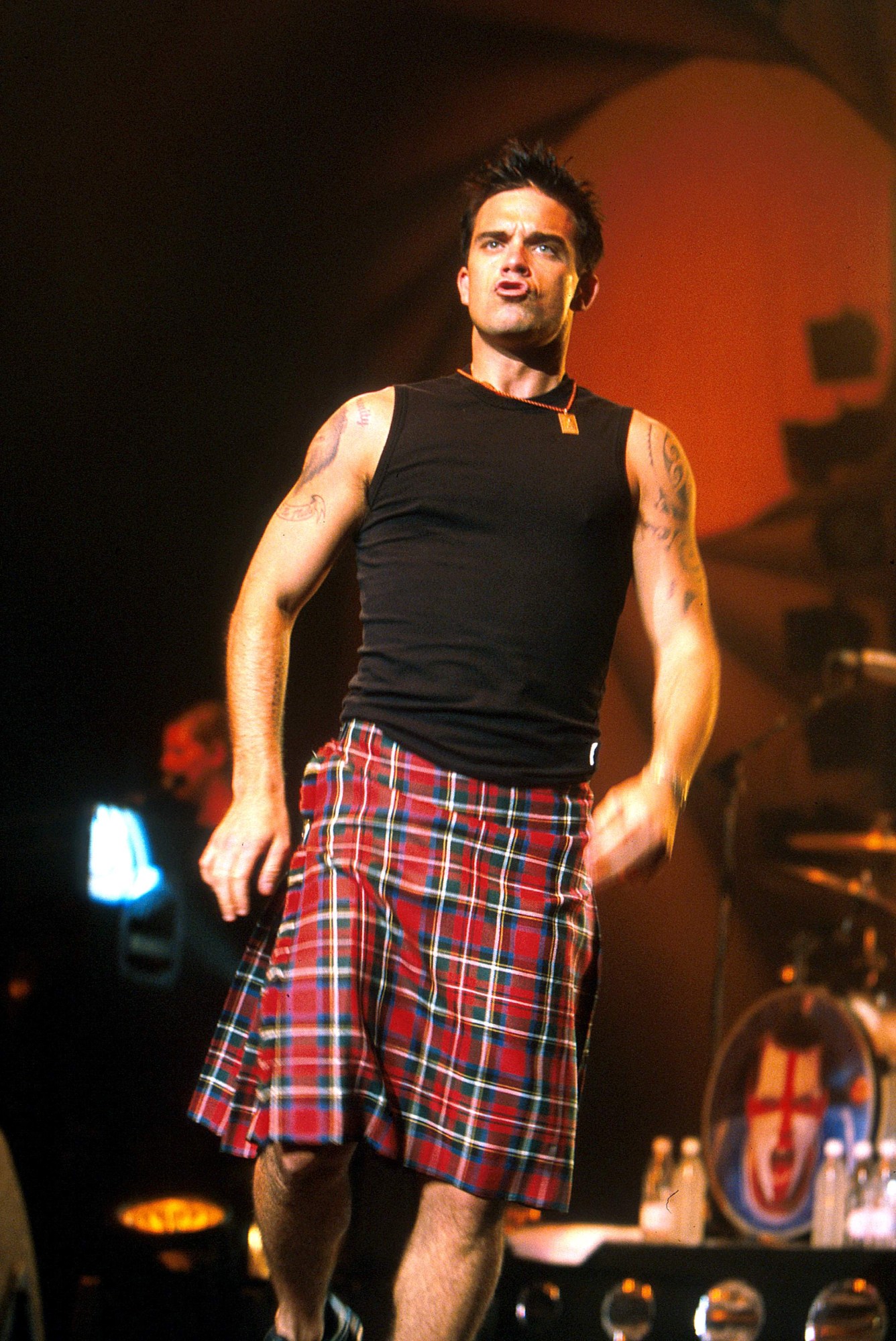 Never one to shy away from attention-seeking looks (he once wore a nude see-through dress on TOTP), Robbie rocked a kilt at an Australian concert in Melbourne. At the time of the performance, he had just released a chart-topping duet with Moulin Rouge-era Nicole Kidman (a cover of Frank and Nancy Sinatra’s “Somethin’ Stupid”) and signed an £80m record deal with EMI — reportedly the biggest music deal in British history. Not a bad moment for our Robbie.