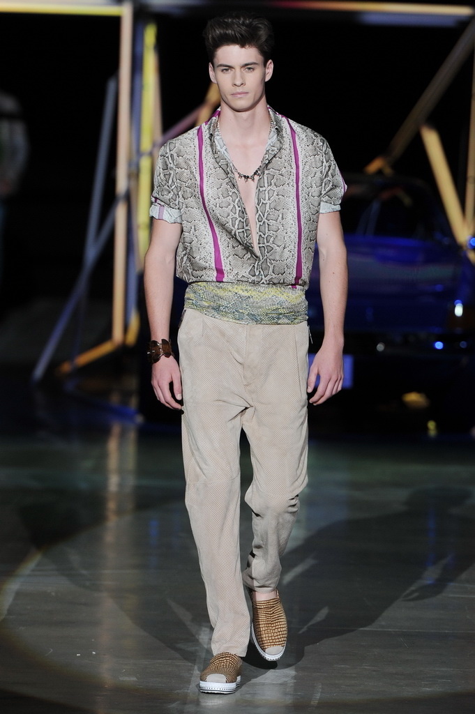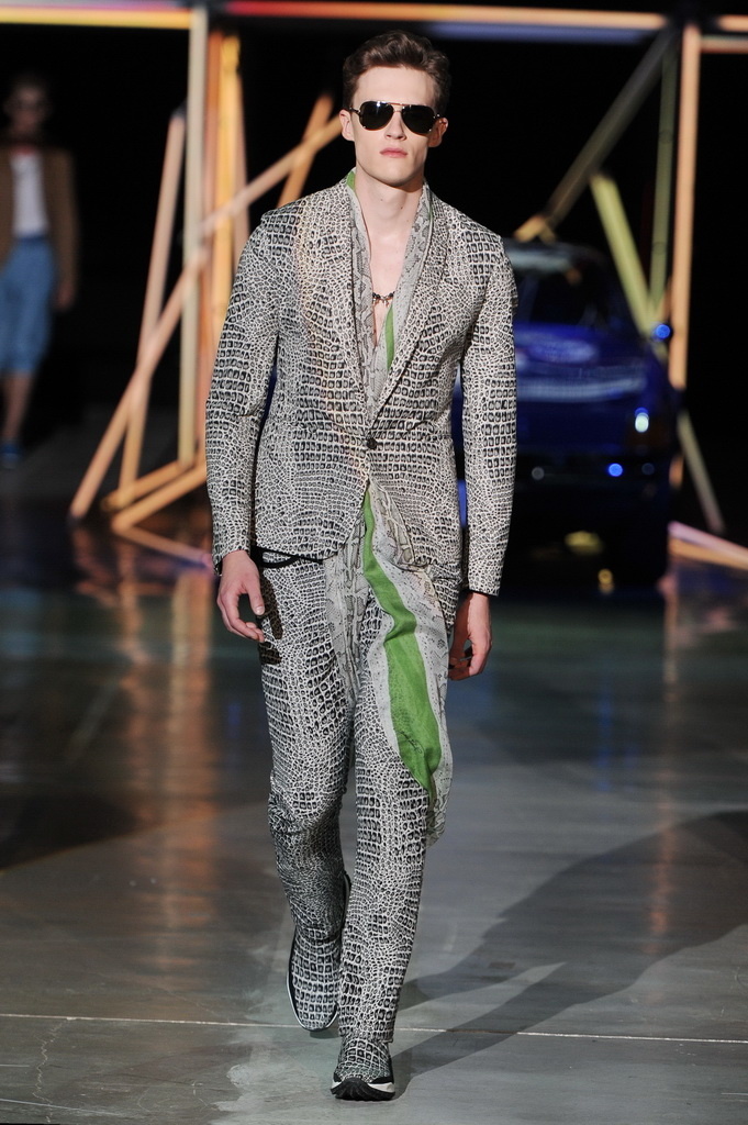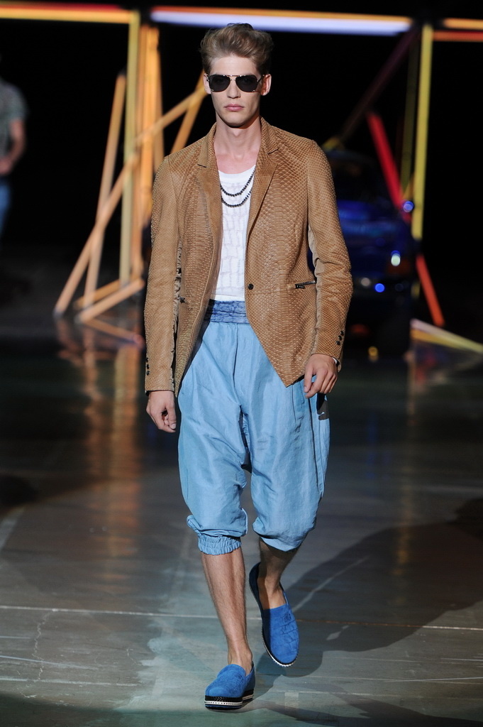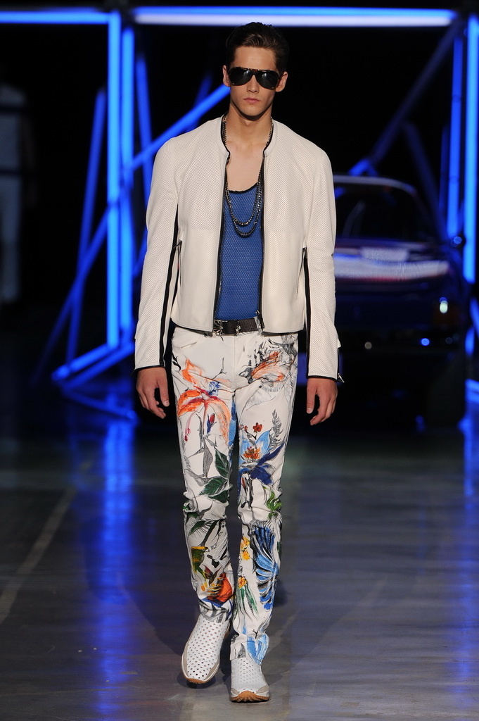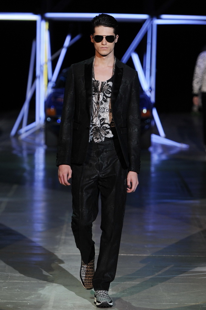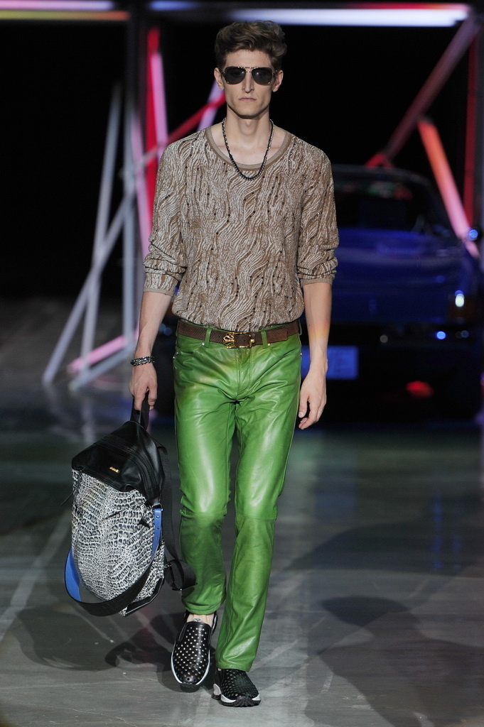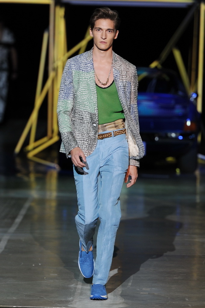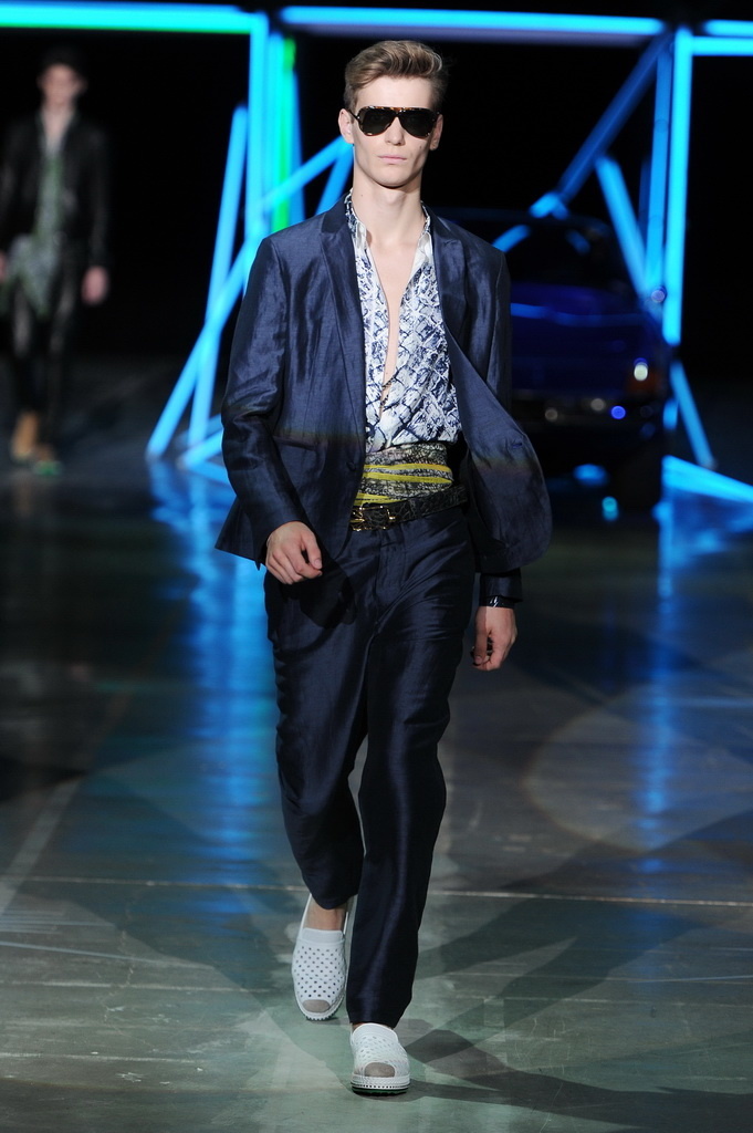 Parked at the root of the runway, Roberto Cavalli’s 1970 Ferrari Daytona left little doubt as to the personal nature of his spring/summer 15 collection. It’s the designer’s second season back on the Milan men’s show schedule, and the second season since he appointed Martyn Bal – formerly of Dior Homme, Versace, and Margiela – to oversee his menswear. Whatever it is, there seems to be a chemistry between the old Italian playboy and the young Dutch rock’n’roller, which shouldn’t really work on paper but completely works on the runway. At 73, Cavalli is feeling nostalgic and Bal is channelling his amazing legacy into a respectful modernisation of the aesthetic of the house he founded in 72.