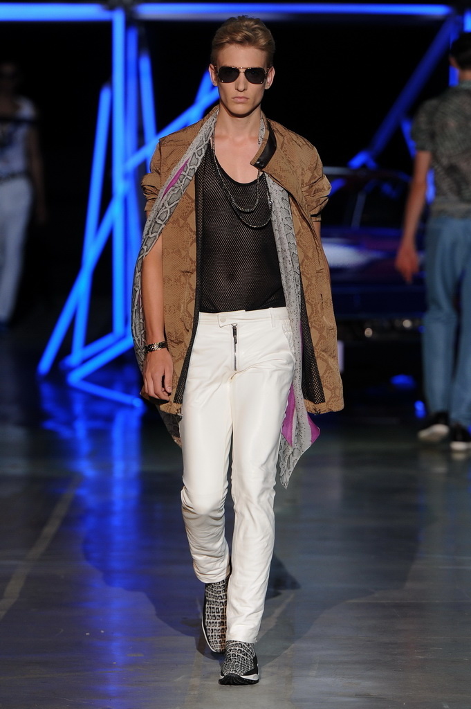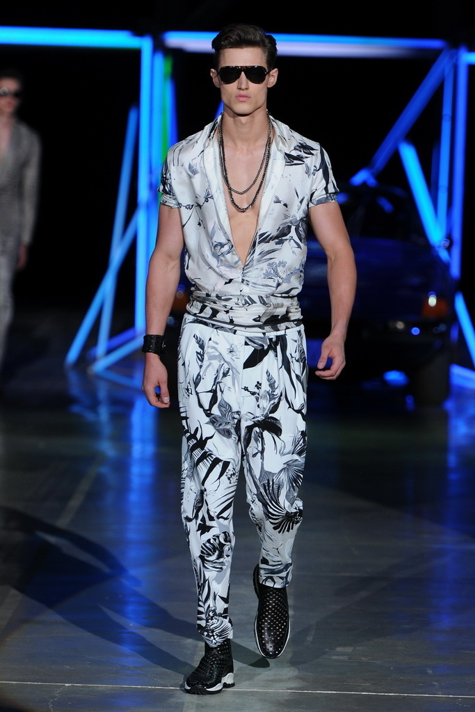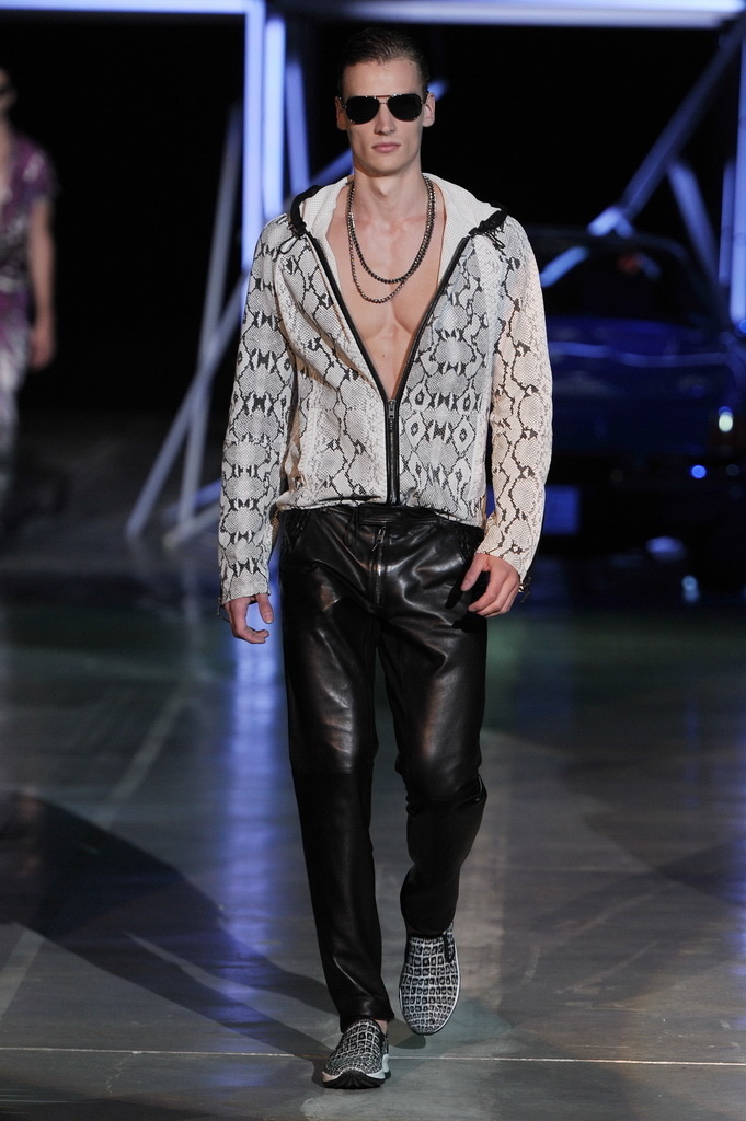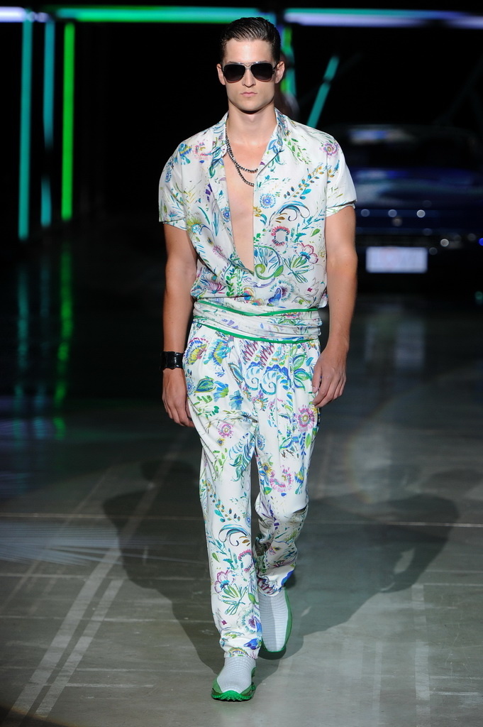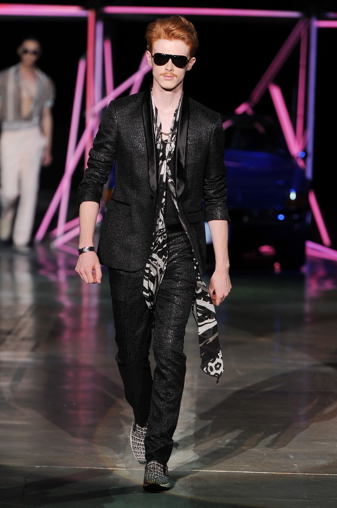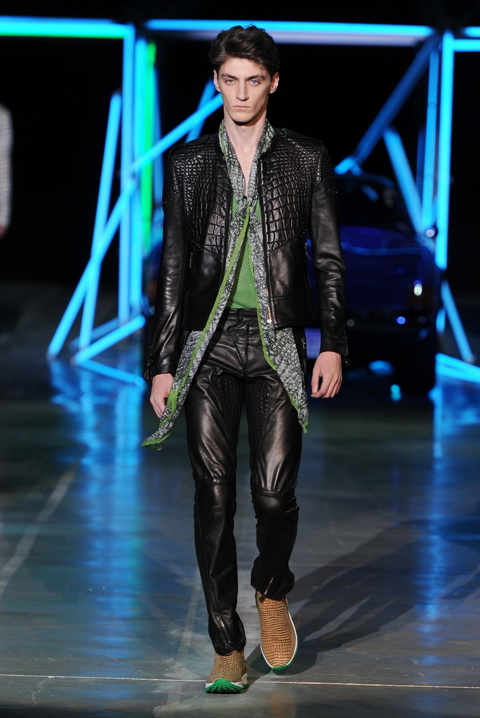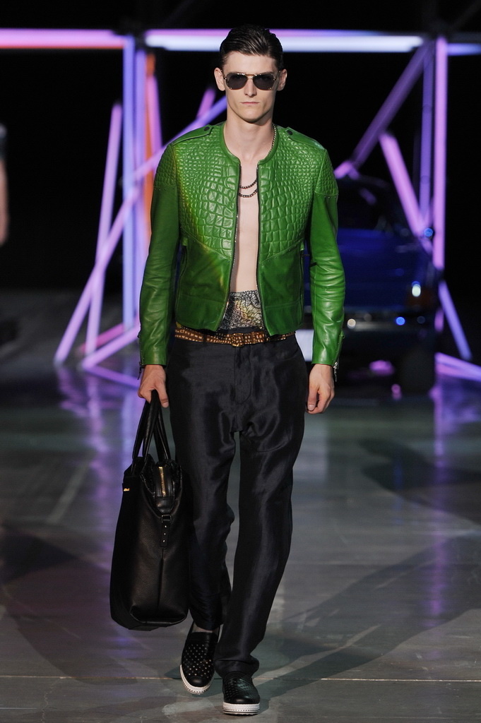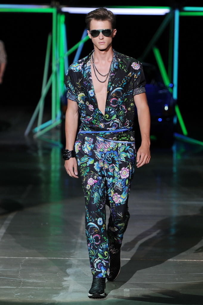 Parked at the root of the runway, Roberto Cavalli’s 1970 Ferrari Daytona left little doubt as to the personal nature of his spring/summer 15 collection. It’s the designer’s second season back on the Milan men’s show schedule, and the second season since he appointed Martyn Bal – formerly of Dior Homme, Versace, and Margiela – to oversee his menswear. Whatever it is, there seems to be a chemistry between the old Italian playboy and the young Dutch rock’n’roller, which shouldn’t really work on paper but completely works on the runway. At 73, Cavalli is feeling nostalgic and Bal is channelling his amazing legacy into a respectful modernisation of the aesthetic of the house he founded in 72.