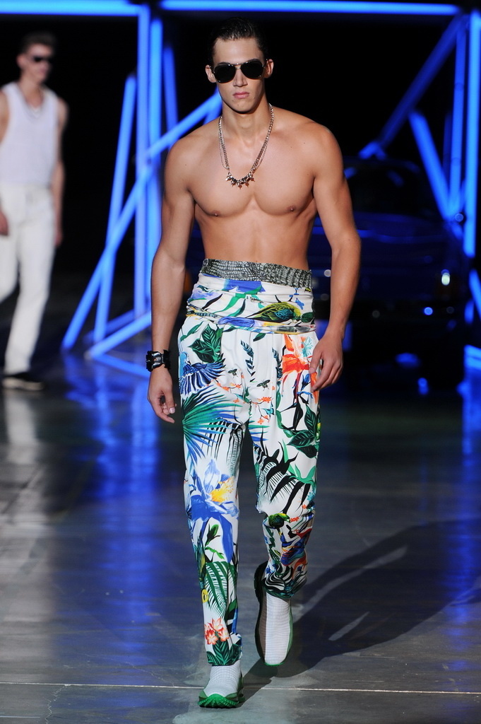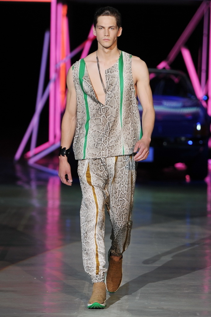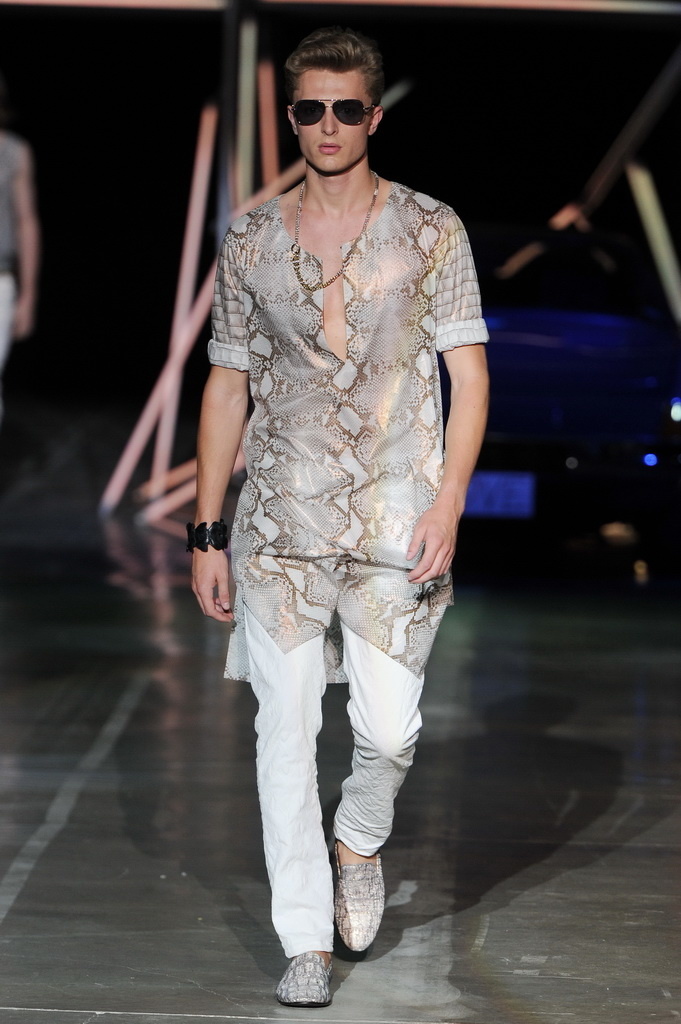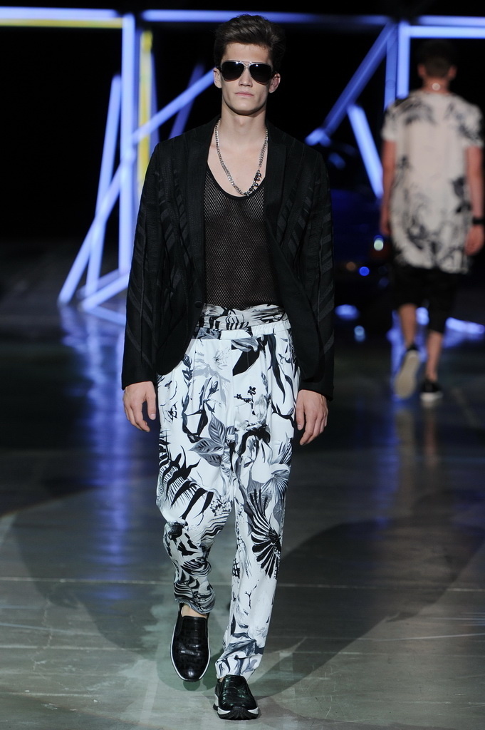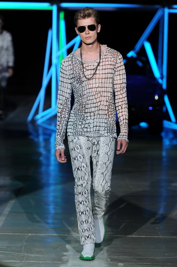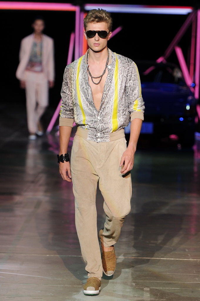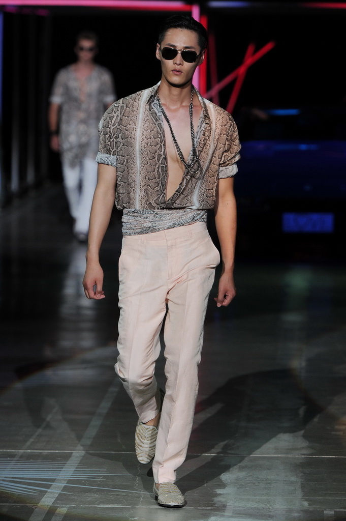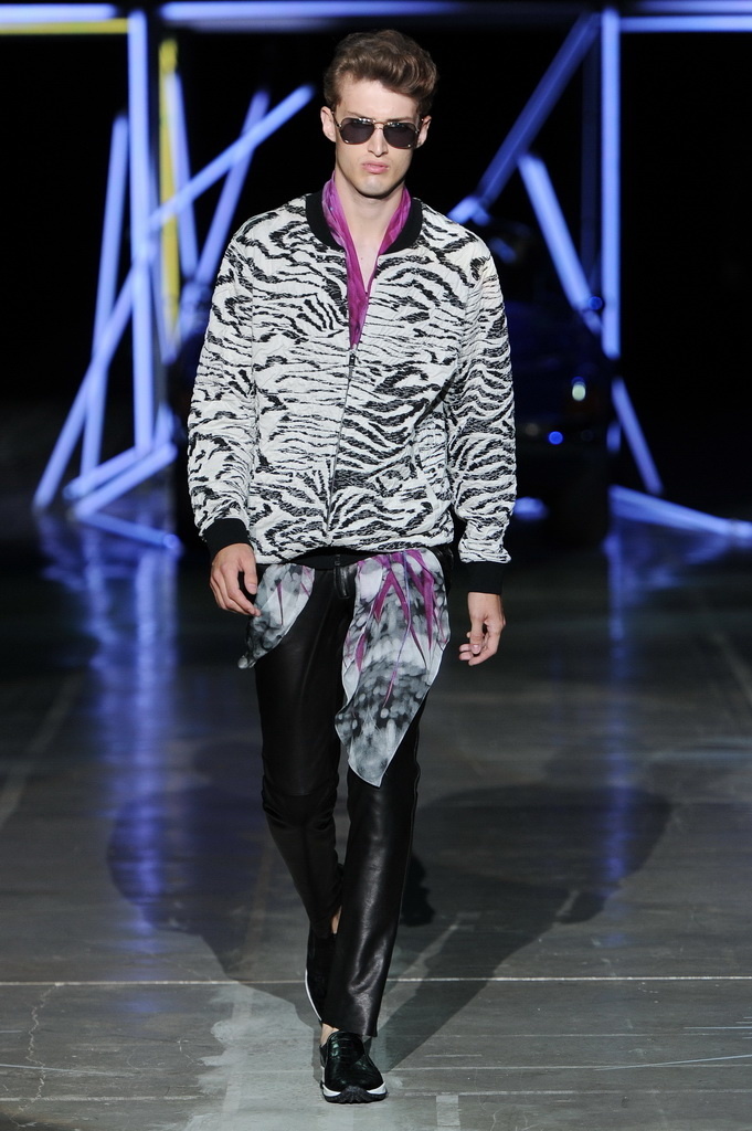 Parked at the root of the runway, Roberto Cavalli’s 1970 Ferrari Daytona left little doubt as to the personal nature of his spring/summer 15 collection. It’s the designer’s second season back on the Milan men’s show schedule, and the second season since he appointed Martyn Bal – formerly of Dior Homme, Versace, and Margiela – to oversee his menswear. Whatever it is, there seems to be a chemistry between the old Italian playboy and the young Dutch rock’n’roller, which shouldn’t really work on paper but completely works on the runway. At 73, Cavalli is feeling nostalgic and Bal is channelling his amazing legacy into a respectful modernisation of the aesthetic of the house he founded in 72.