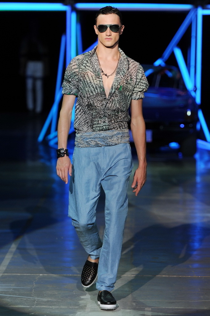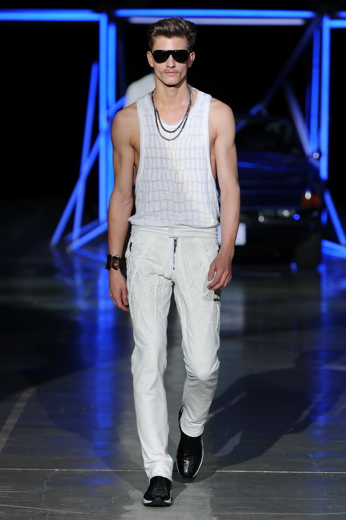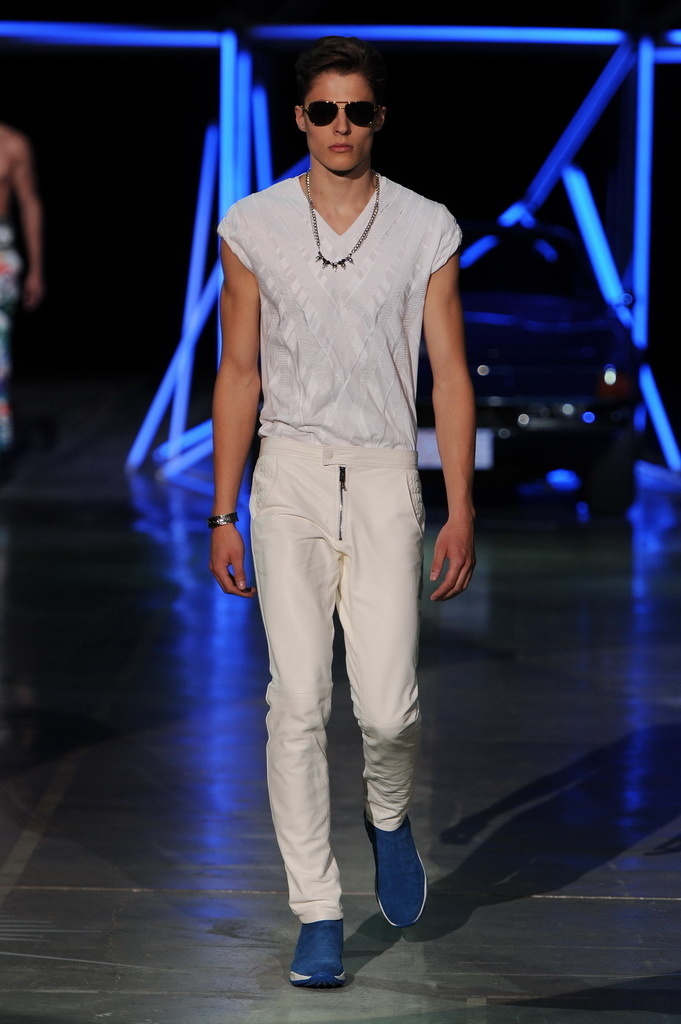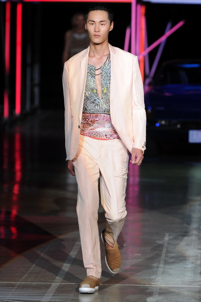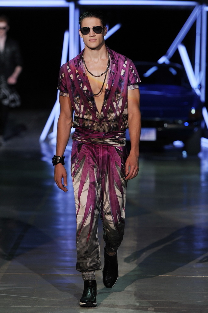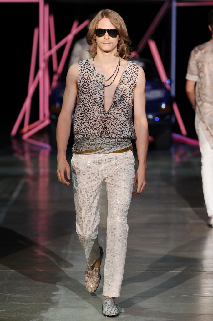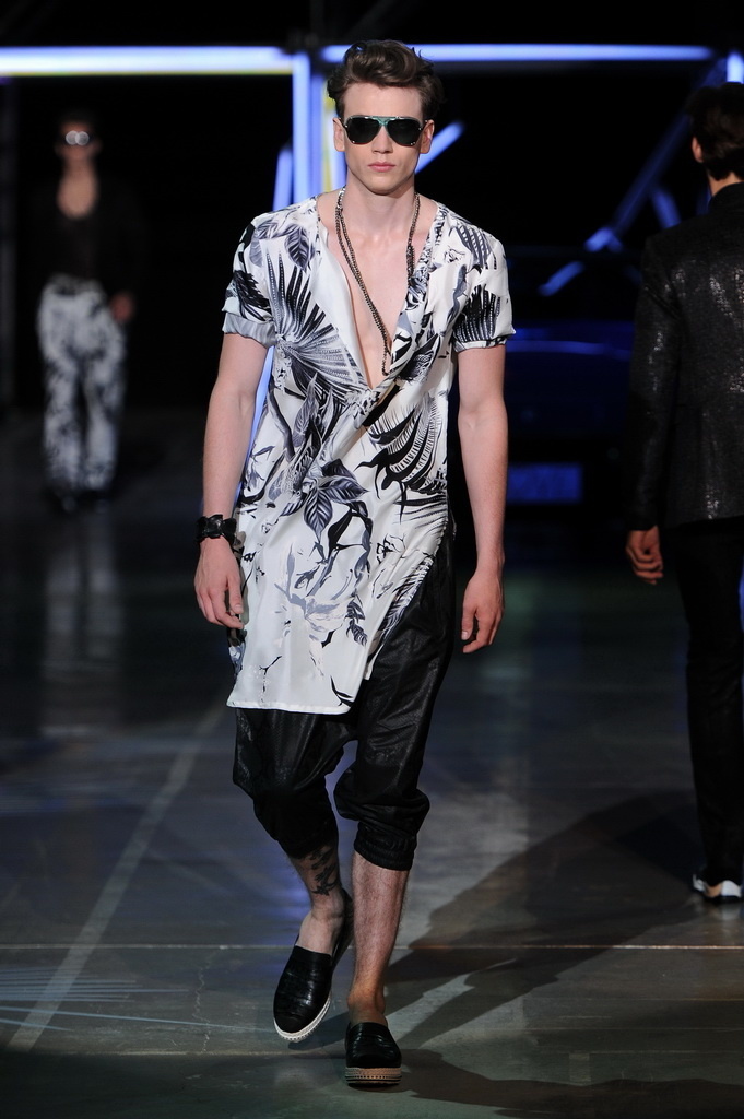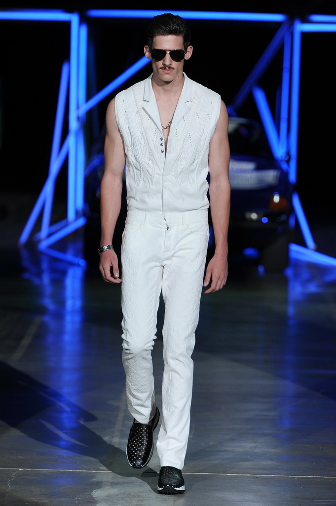 Parked at the root of the runway, Roberto Cavalli’s 1970 Ferrari Daytona left little doubt as to the personal nature of his spring/summer 15 collection. It’s the designer’s second season back on the Milan men’s show schedule, and the second season since he appointed Martyn Bal – formerly of Dior Homme, Versace, and Margiela – to oversee his menswear. Whatever it is, there seems to be a chemistry between the old Italian playboy and the young Dutch rock’n’roller, which shouldn’t really work on paper but completely works on the runway. At 73, Cavalli is feeling nostalgic and Bal is channelling his amazing legacy into a respectful modernisation of the aesthetic of the house he founded in 72.