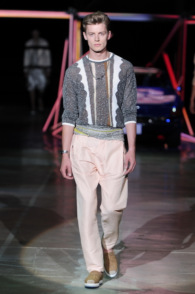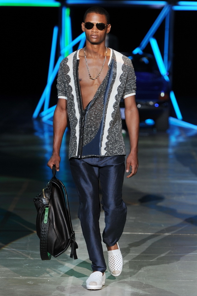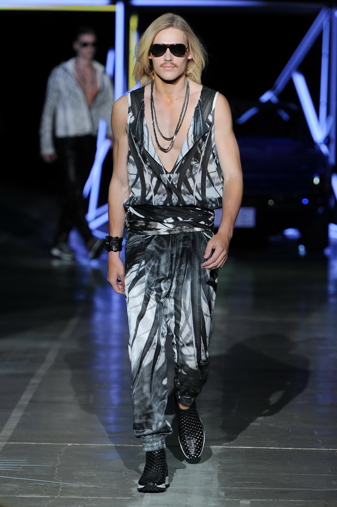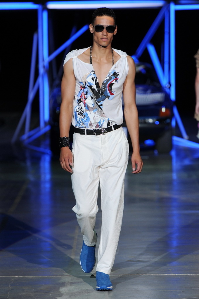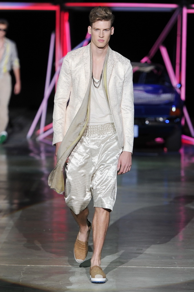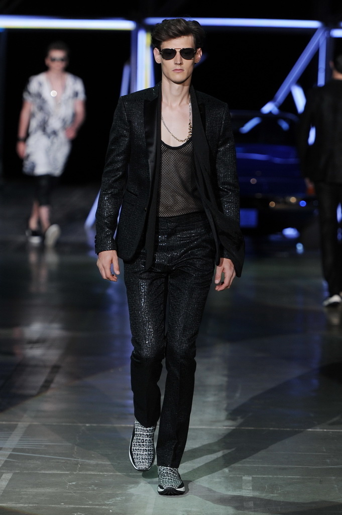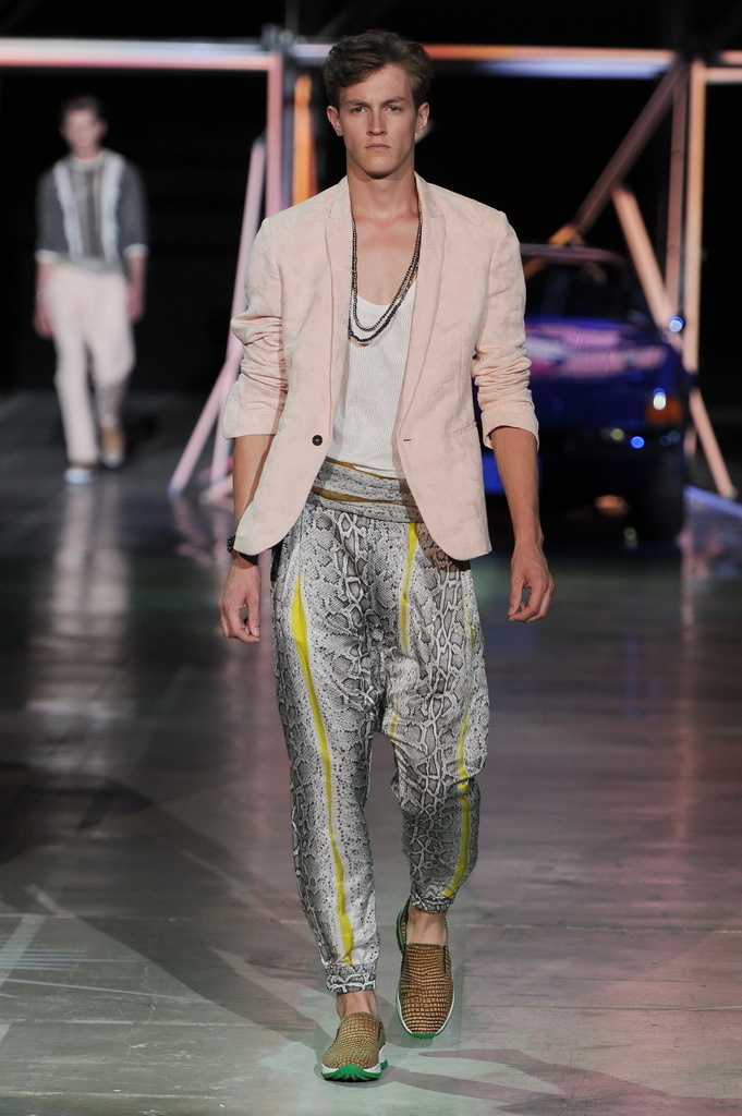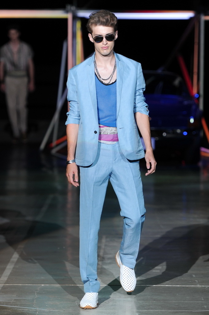 Parked at the root of the runway, Roberto Cavalli’s 1970 Ferrari Daytona left little doubt as to the personal nature of his spring/summer 15 collection. It’s the designer’s second season back on the Milan men’s show schedule, and the second season since he appointed Martyn Bal – formerly of Dior Homme, Versace, and Margiela – to oversee his menswear. Whatever it is, there seems to be a chemistry between the old Italian playboy and the young Dutch rock’n’roller, which shouldn’t really work on paper but completely works on the runway. At 73, Cavalli is feeling nostalgic and Bal is channelling his amazing legacy into a respectful modernisation of the aesthetic of the house he founded in 72.