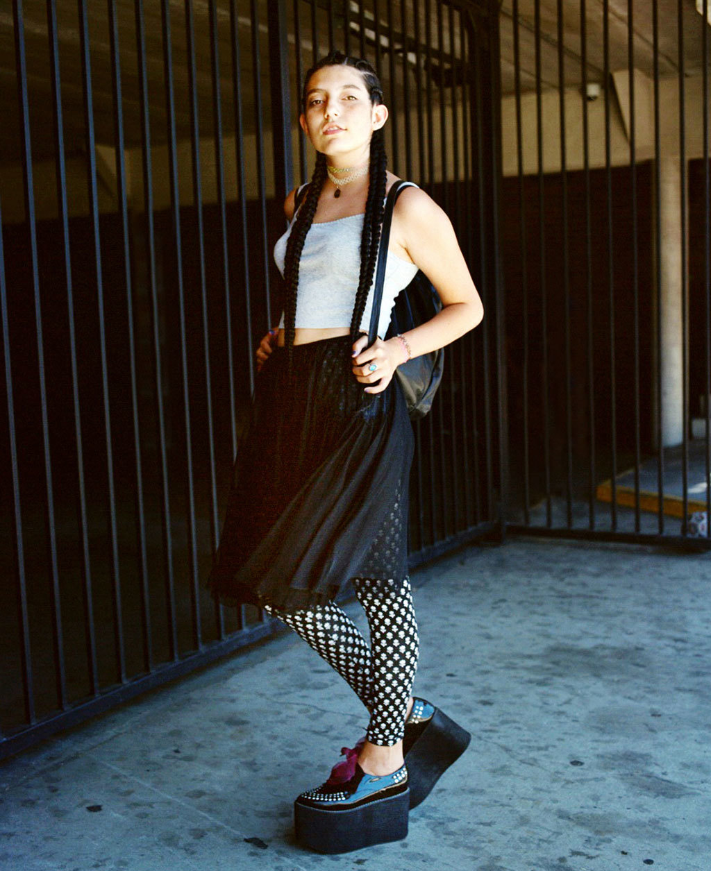 Well right now I’m wearing suede creepers, a long black crushed velvet circle skirt, a bunch of old necklaces from numerous places, and a black Dolce & Gabbana backpack my mum’s friend gave me.