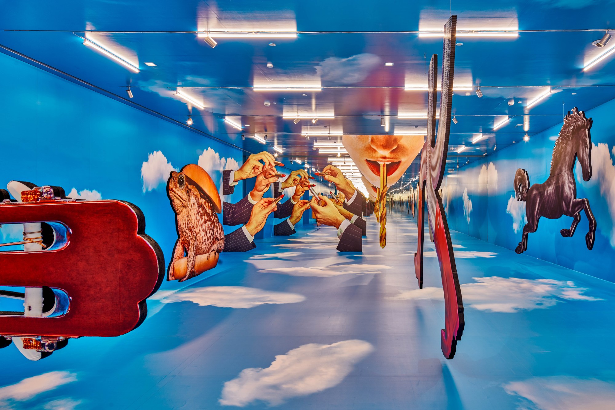 “Is There Room in the Sky?”, the cloud-patterned space on the second floor, features a series of similar images cut-out and suspended from the ceiling: a floating black stallion; a giant frog sandwiched between (you guessed it) two burger buns; metal cylinders as legs in a pair of red wellington boots; sliced, pink brains accompanied by round bandsaw blades.