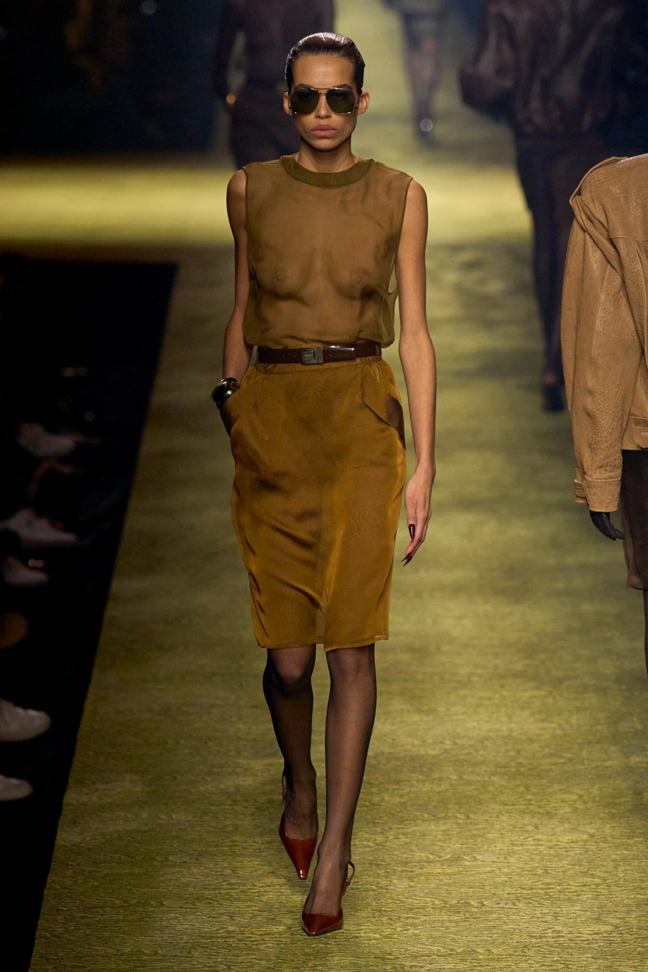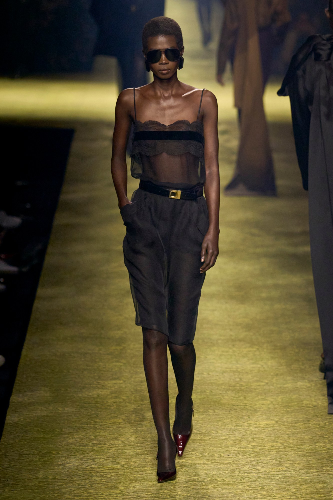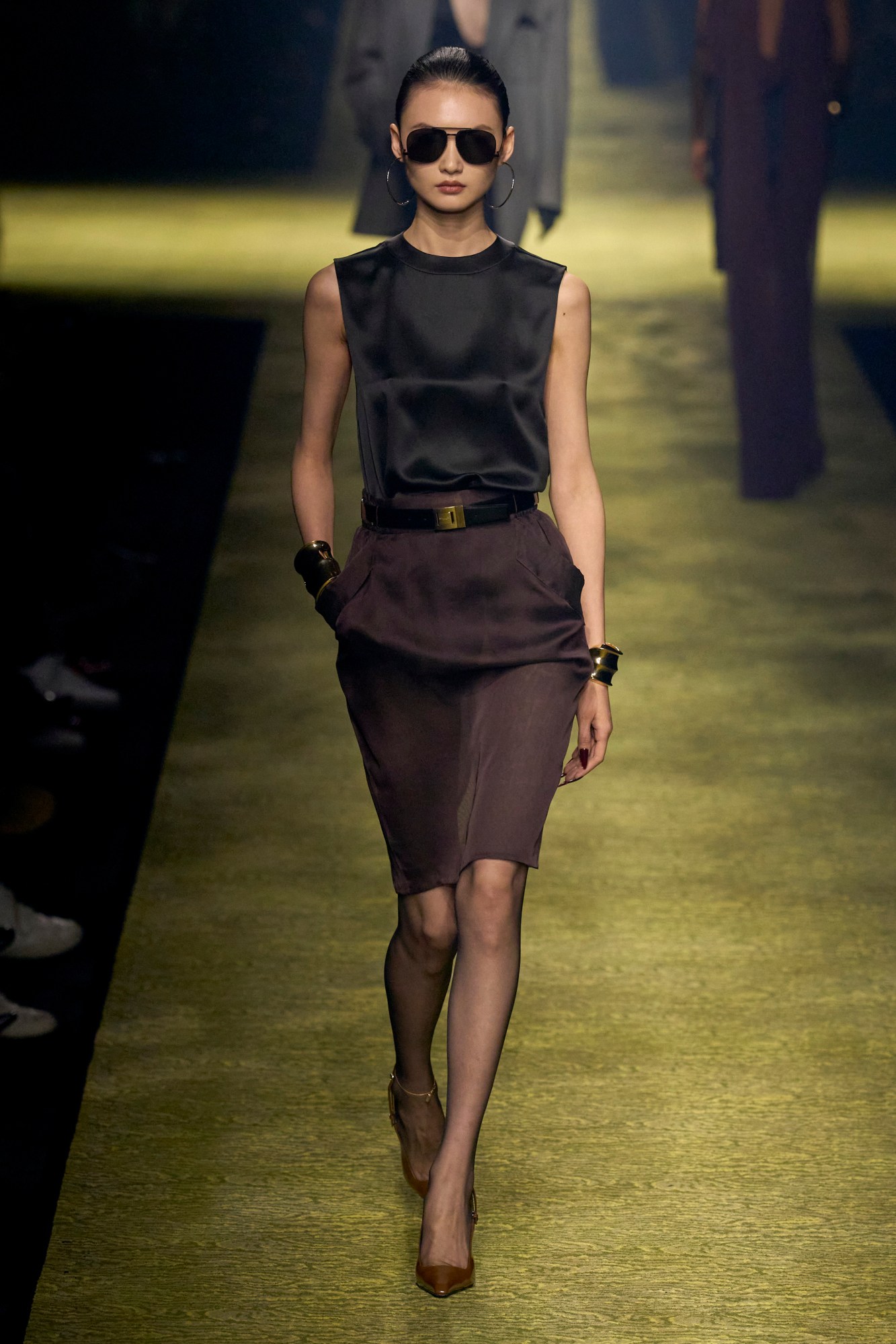Upon arrival at Saint Laurent’s monumental show, a staircase ascending the purpose-built venue in the shadow of the Eiffel Tower ostensibly had plumes of volcanic mist creeping out from each step. Inside, the heady scent of tuberose and jasmine filled the air — reminiscent of the lobby at La Mamounia — and the warm glow of gilt chandeliers lit a long moiré-carpeted catwalk. This was a recreation of the Intercontinental Hotel, where Yves Saint Laurent showed his collections on elevated catwalks from 1976 to 2001, the year he retired. But the goosebumps really pricked up as the show began. The first look set the tone for Anthony Vaccarello’s auteur-like vision for the Saint Laurent woman come autumn: dramatically wide shoulders, slim skirts ending just above the knee, plunging décolleté t-shirt, patent slingback stilettos, aviators obscuring her eyes, chunky metal cuffs on her wrists and doorknocker hoops dangling from her ears.