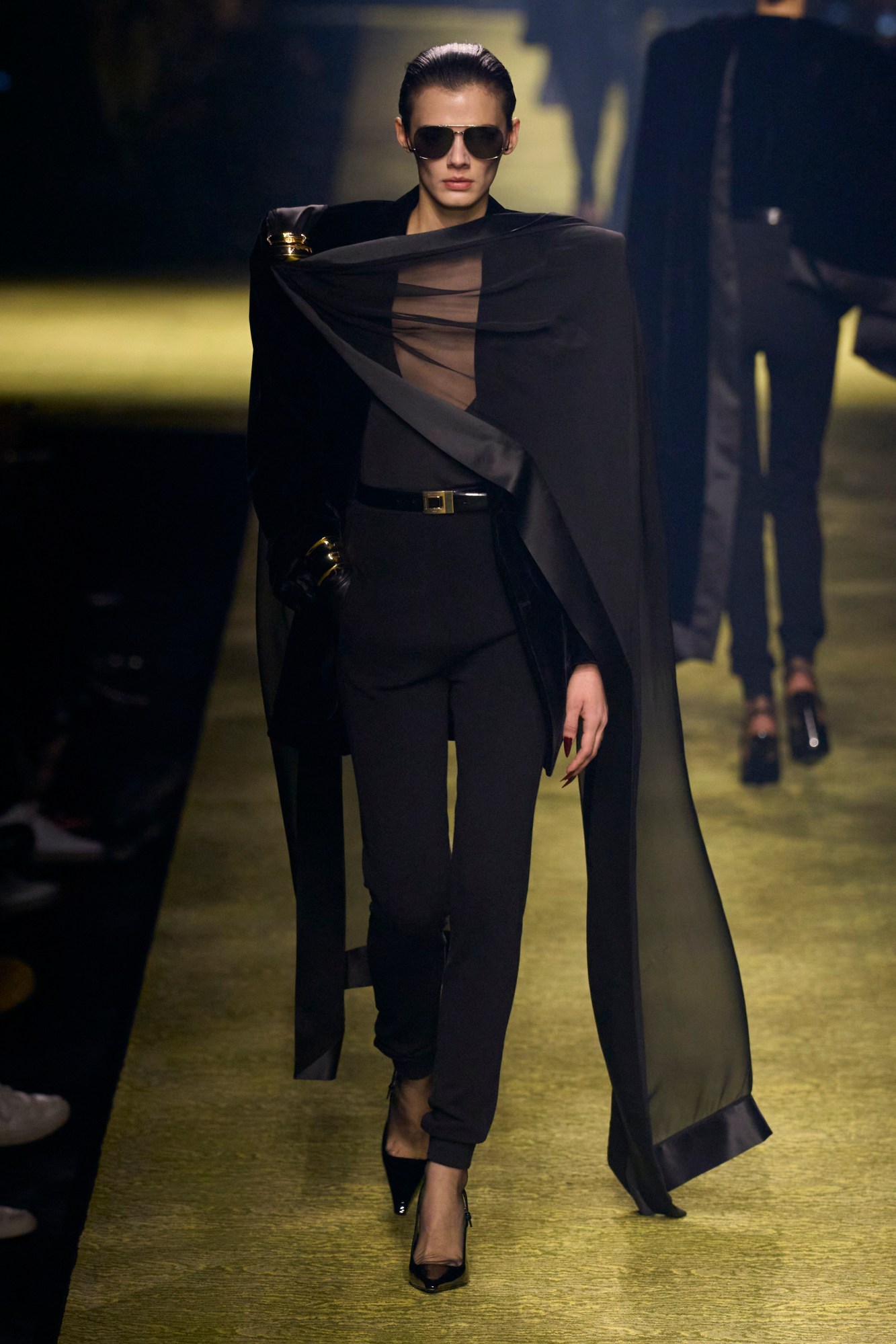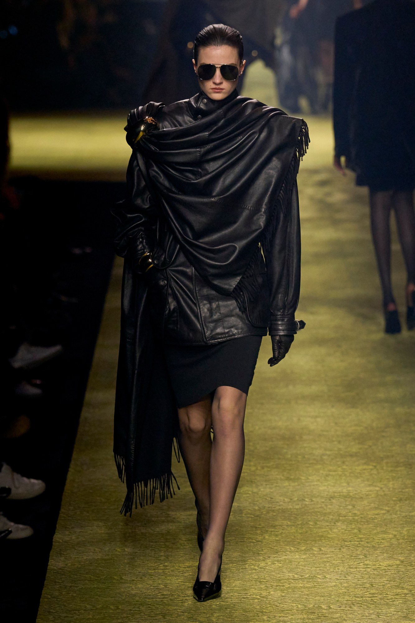 One of the biggest themes emerging in his collections is not the laser-sharp tailoring or incendiary dresses that Saint Laurent is known for by now, but the delicate balance between severity and something altogether more fluid. Masterful drapery lent a softness to the otherwise perpendicular silhouettes. Giant shawls were worn as capes over blazers, in wool and tartan and even leather and organza, clasped by Peretti-like hardware, striking a balance between cosy and imperiously regal. Unlike previous seasons, the main focus was on daywear, and as with Anthony’s menswear show last month, pussybows on chiffon blouses came extended into floor-sweeping trains, transformed from an 80s secreterial staple — think Margaret Thatcher and Sigourney Weaver in Working Girl — into dramatic eveningwear. Ruffles were kept clean, as precise as the shoulder-to-sleeve ratio on blazers, often oversized and purposefully placed. And throughout, there were the cigarette trousers and the slick accessories the house has become known for, with the noticeable exception of handbags; instead hands were placed insouciantly in pockets.