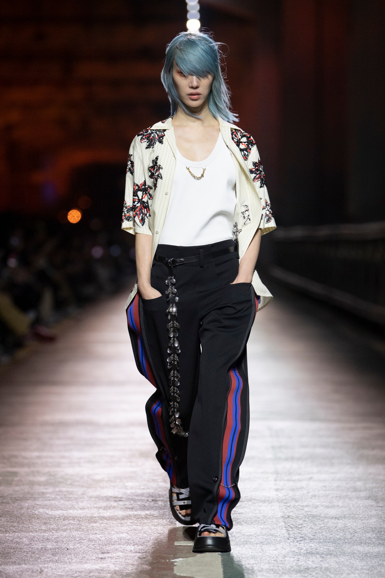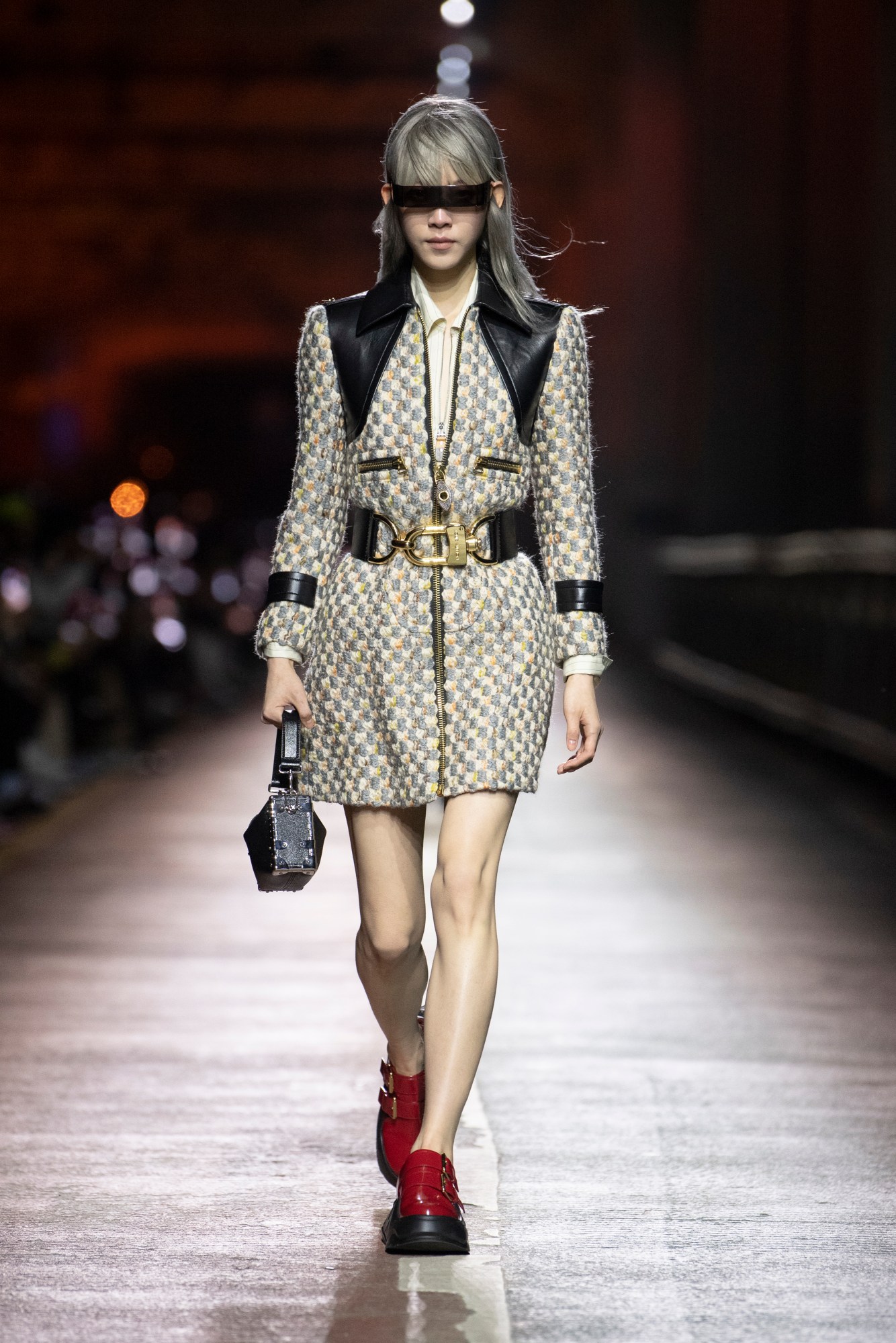 Last weekend, Louis Vuitton headed out to Seoul to showcase its pre-fall 2023 collection, staging a blockbuster show on the Jamsu Bridge — an iconic landmark at the heart of the Korean capital. Opened by none other than former i-D cover star and Squid Game actress Hoyeon — who sported a mod-ish studded leather and glossy block-hued moto jacket — it was a collection that conveyed exactly the sort of adventurous spirit we’ve come to expect of Nicolas Ghesquière’s tenure at the house. A synergy of unexpected motifs, intricate embroideries figured on casual poplin shirting, while prim jacquard dresses were elevated by leather panelling and chunky hardware details. In its ensemble — and given the fact that the brand had travelled so far to show the collection — it embodied the importance of travel in Louis Vuitton’s brand philosophy, with that dynamism conveyed through the abundance of sporty references seen across the board.