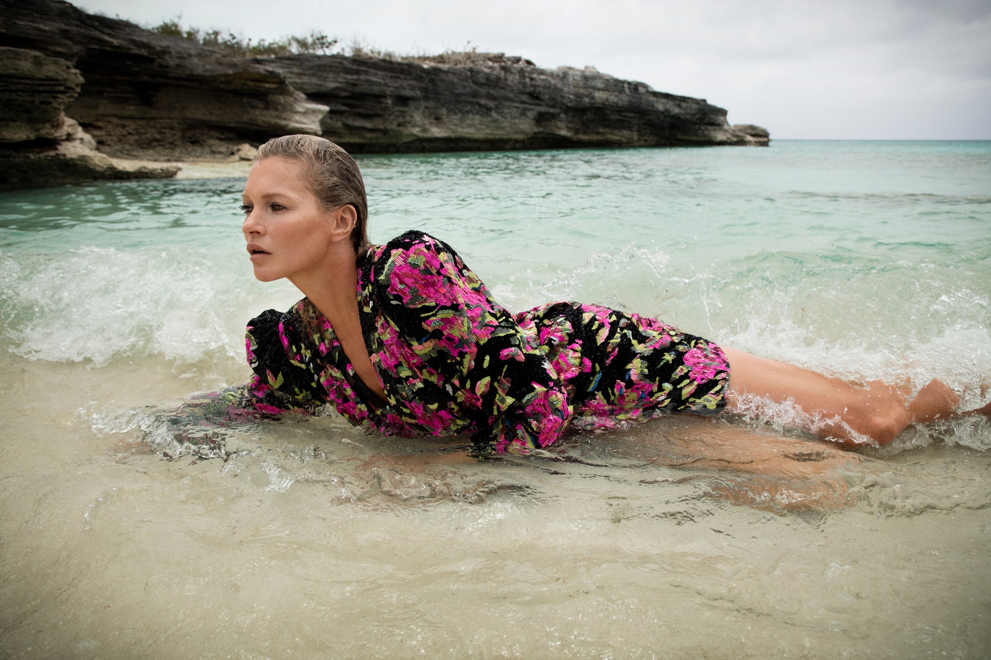 One of the highlights of Anthony Vaccarello’s autumn/winter 18 collection for Saint Laurent — following a sexy ensemble of black, sparkly eveningwear — was its floral finale of evening dresses with gravity defying shoulders. It was pure rock’n’roll 80s glamour, and a perfect modern take on a classic Saint Laurent staple. Now, you can now check out the inimitable Kate Moss donning said items, soaking wet, strewn across a tropical beach, in a new campaign video and imagery shot by Inez and Vindooh.