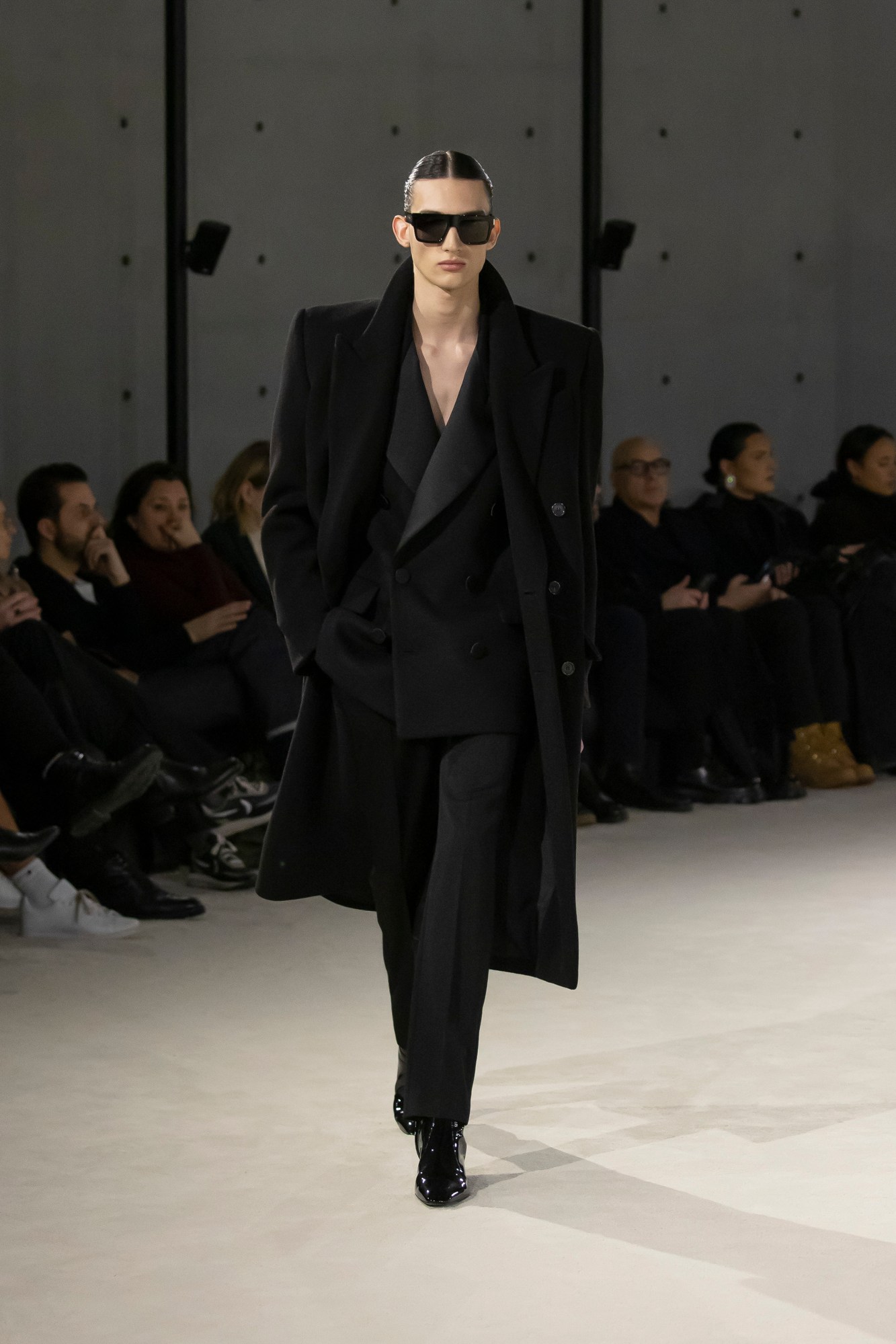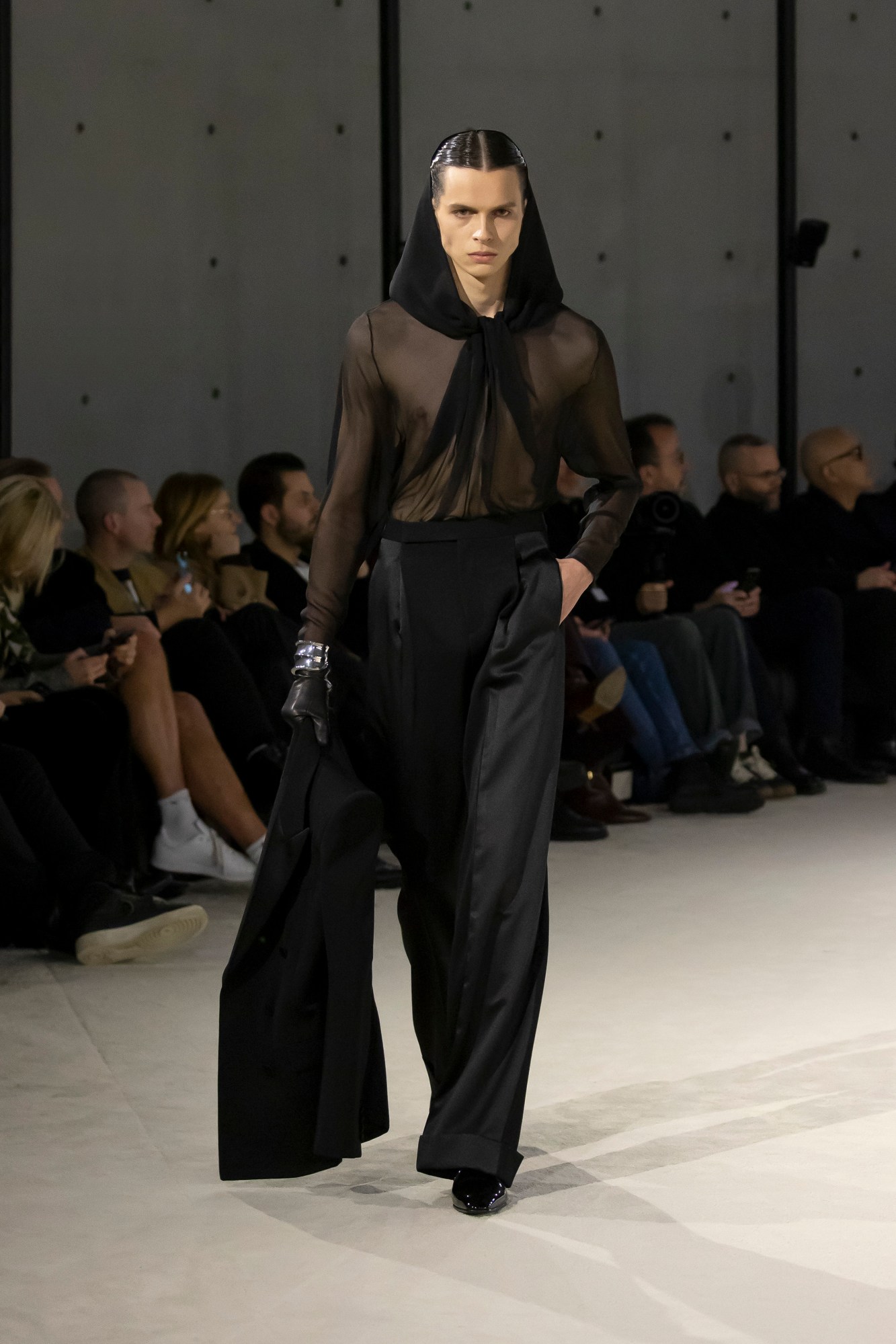 The show opened with a model in a paper-crisp white cotton blouson with an origami-like bowed cravat, tucked into languid wide-leg velvet trousers, hair slicked back, hands in pockets. What followed was a continuation of the long, lean silhouettes that Anthony has made the defining feature of his menswear, uncompromising in their singularity. This time, they came in knitted turtle-necks elongated all the way from the eyes to below the knee, floor-sweeping coats with dramatically wide shoulders, draped silk blouses and ultra-long black trousers, and several twisted jersey hoods that he first showed on women in September, initially borrowing from Yves’ hooded ‘capuches’ from the mid-80s. Those silhouettes are repeated and perfected to leave an indelible impression, unwavering in their directness. It’s the kind of fine-tuned precision that requires enormous confidence and technical prowess to achieve. No gimmicks, no trends — everything is in plain view, measured to the millimetre.