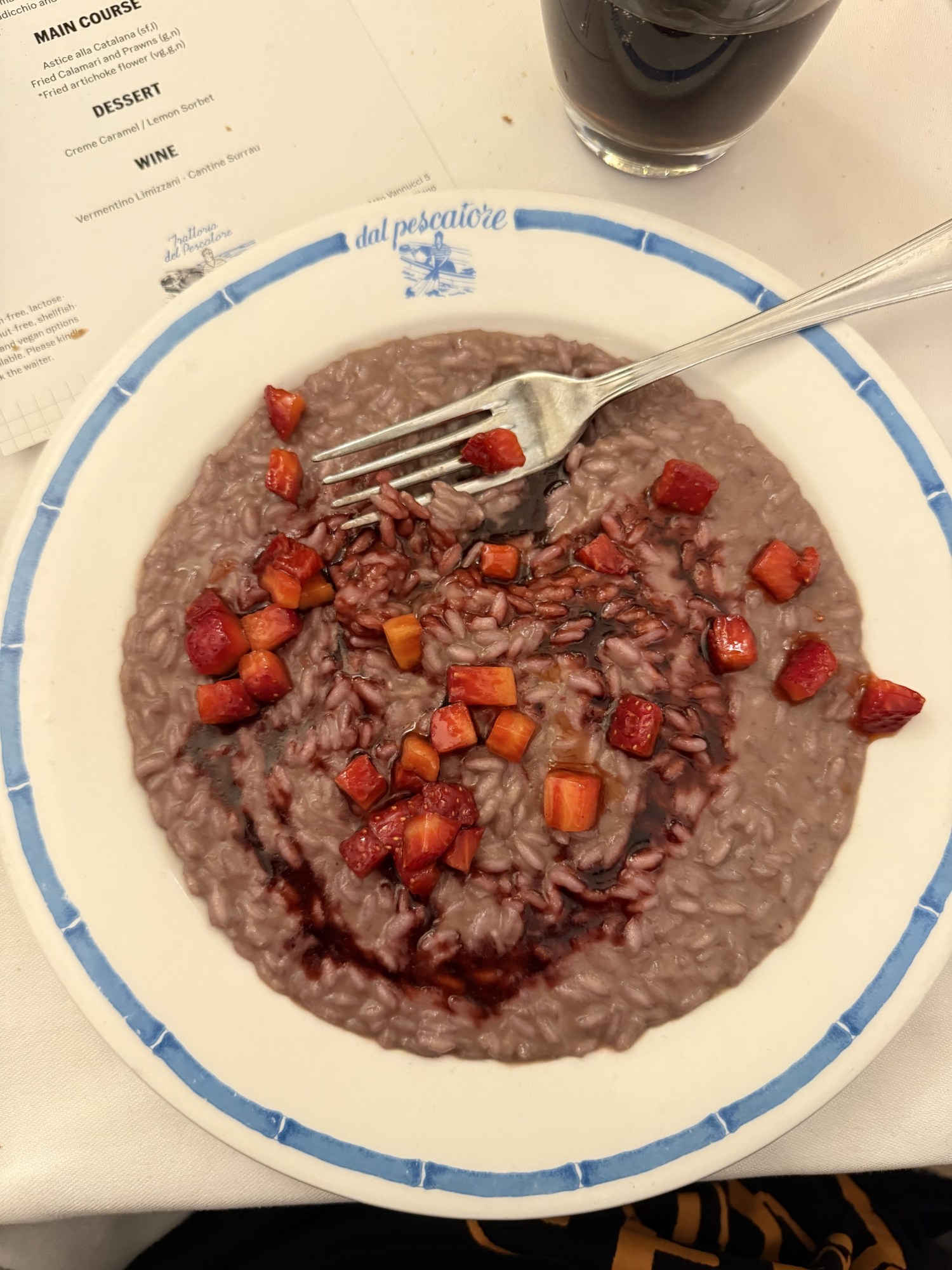 Douglas: Love that for you. I had an asparagus flan that was weirdly delicious and a radicchio risotto with balsamic and strawberries that looked cursed but tasted incredible. And then… there was the tiramisu. I ordered it from room service and it came inside a giant fake coffee bean. Just cream inside. No sponge. No joy. 65 euros. Crimes were committed.