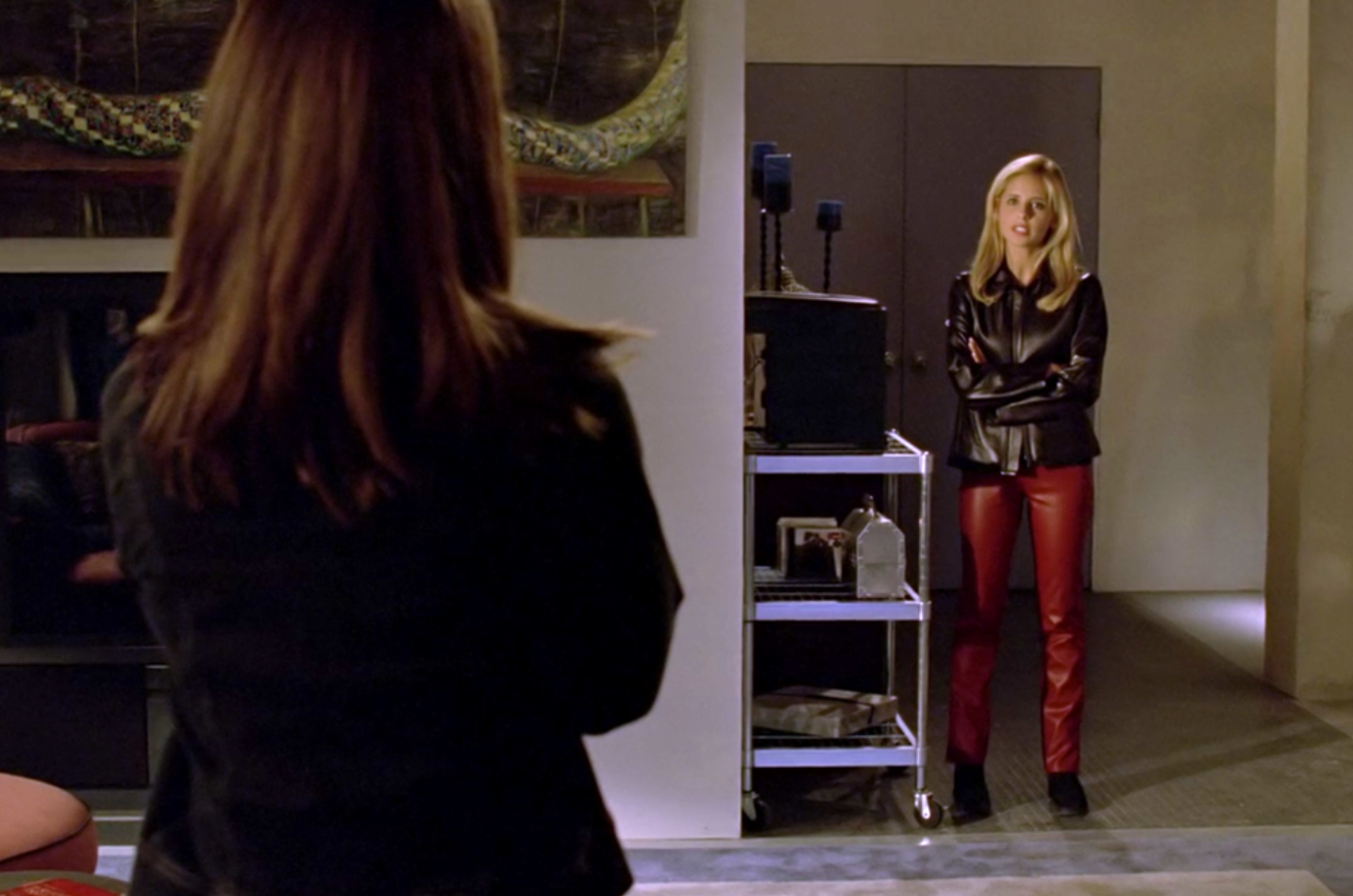 If there is one garment Buffy the Vampire Slayer will be remembered for (along with being the Sunnydale Class Protector of 1999), it’s leather trousers. The show itself was a bit obsessed with the humble leather pants, which were seen upon the likes of Faith, Spike, Angel and, of course, Buffy herself. In turn, as TikTok introduces a new audience to the beloved 90s show, the garment is also having a bit of a renaissance in our street style, as well as in the biker style trend of the AW22 runways. While there are many great leather trouser moments in the show’s history, the most renowned will have to be this sleek blood red pair worn by Buffy along with a black halter vest and black shiny leather jacket as she goes to fight the chaotic evil icon Faith. Is it the most suitable of materials to go into battle in? No. But hey, at least she looks stunning whilst saving the world.