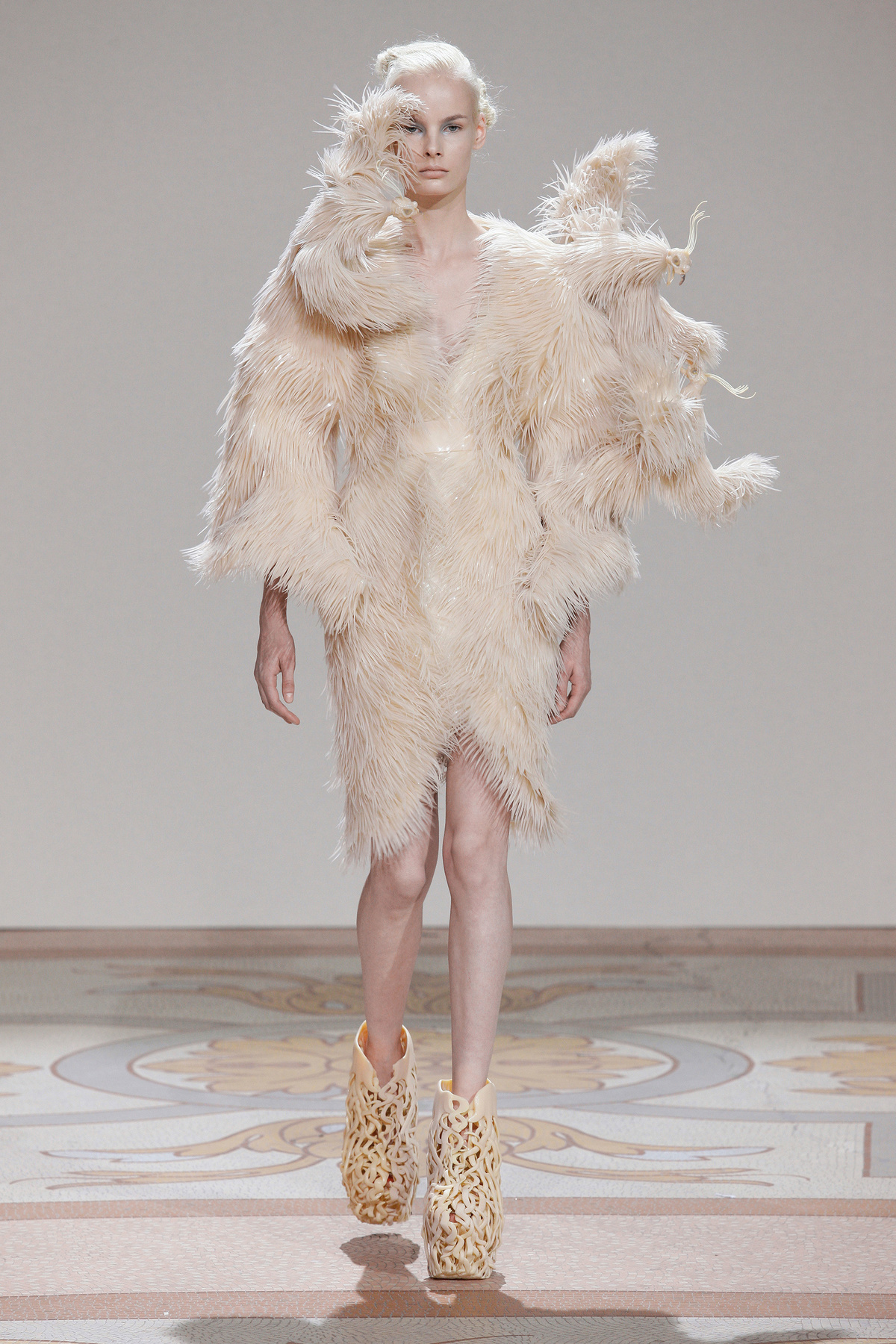 „Ich glaube nicht, dass 3D-Druck, wie wir ihn heute kennen, die Zukunft der Mode ist, aber ich glaube definitiv, dass die alten Verfahren zum Bau jeder Kreation – sei es in der Architektur, im Design, der Kunst, der Mode – wo wir in der Regel zweidimensional beginnen, um etwas dann in die dritte Dimension zu modulieren, Geschichte sein werden. Die Entwicklung geht so schnell, Forschung und Musterentwicklung in 4D haben bereits begonnen. Also glaube ich zwar, dass 3D-Druck, wie wir es heute kennen in Zukunft nicht unser Weg sein wird, Kleidung herzustellen, aber die Essenz des 3D-Druckes – gleich mit 3D anzufangen und 2D zu überspringen – wird es sein, ja”, erklärt Iris. Es mag noch in einem frühen Stadium befinden, aber 3D-Druck wird bereits dazu verwendet, um so ziemlich alles zu machen, von Waffen bis Pizza (der Foodini-3D-Drucker wird für doch sehr überschaubare 1.050 Euro zu haben sein — auch wenn er nur Essen mit breiiger Konsistenz drucken kann) und wenn du bedenkst, dass du jetzt deinen eigenen 3D-Drucker von Maplin kaufen kannst (der UP! Plus 2 3D-Drucker kostet nur 2.025! Euro und kann benutzt werden, um von der iPhone-Hülle bis zum Eierbecher fast alles herzustellen), wird es mit Sicherheit nicht lange dauern, bis wir auf 3D-Drucker kucken, wie wir heute auf Computer schauen, sprich, dass wir ohne nicht mehr sein können.