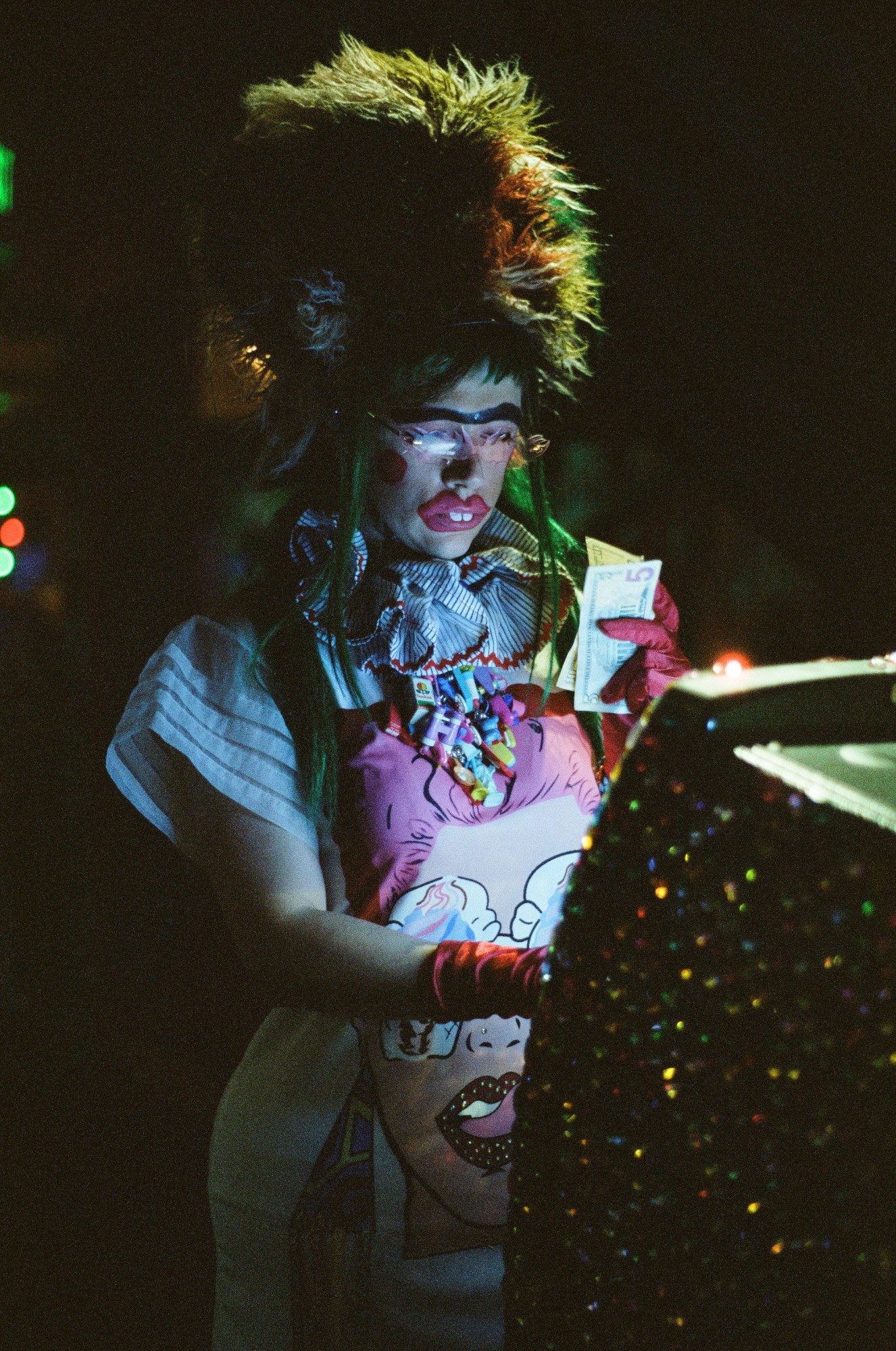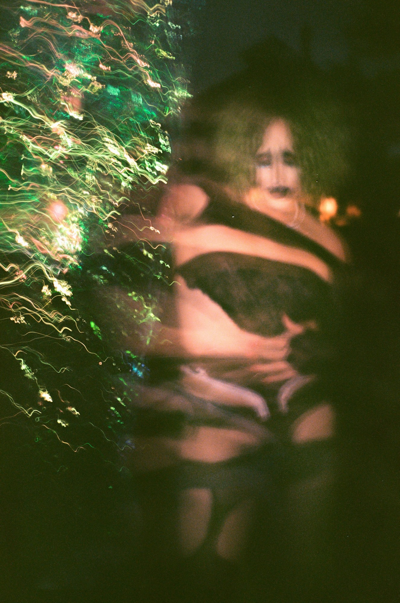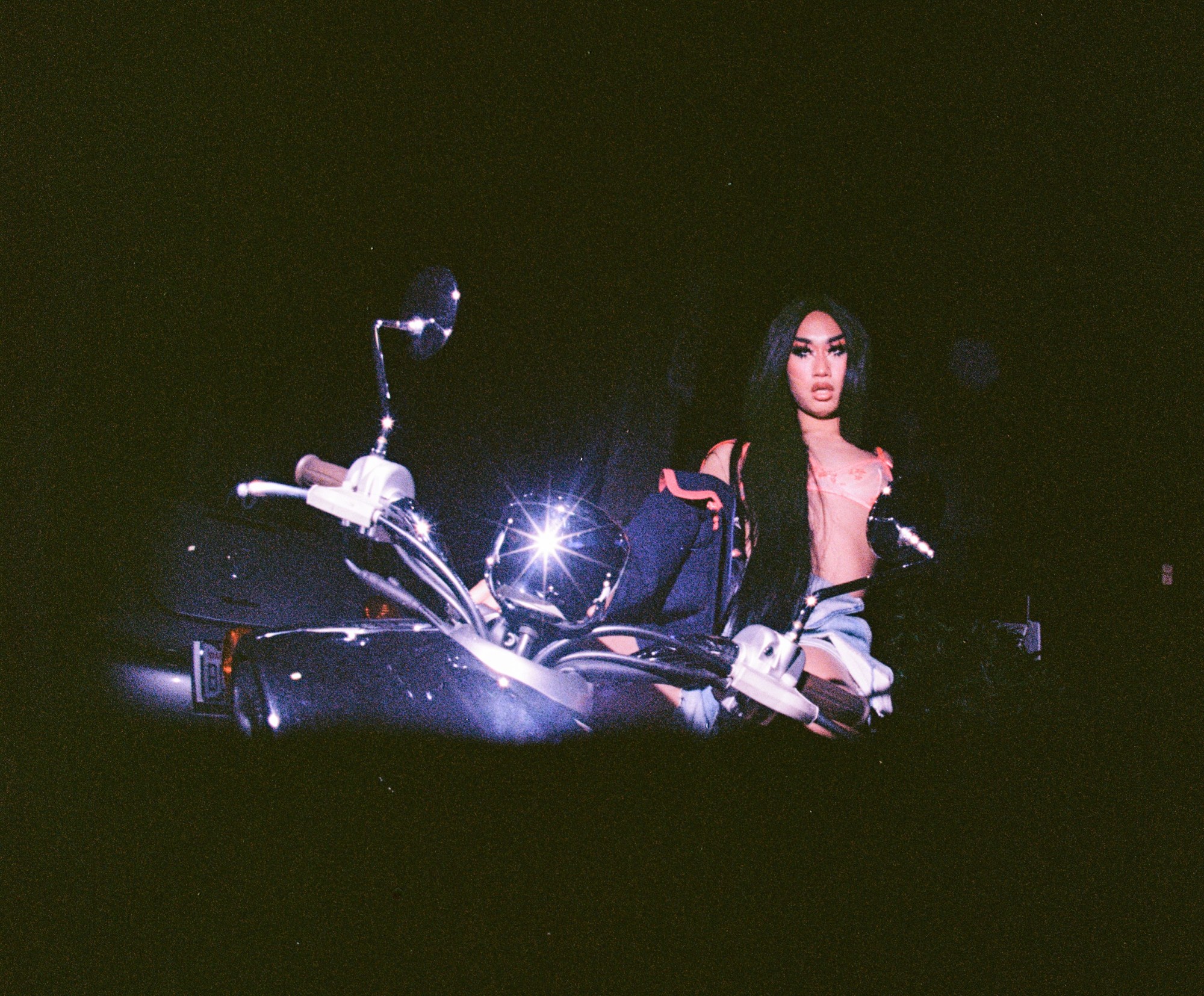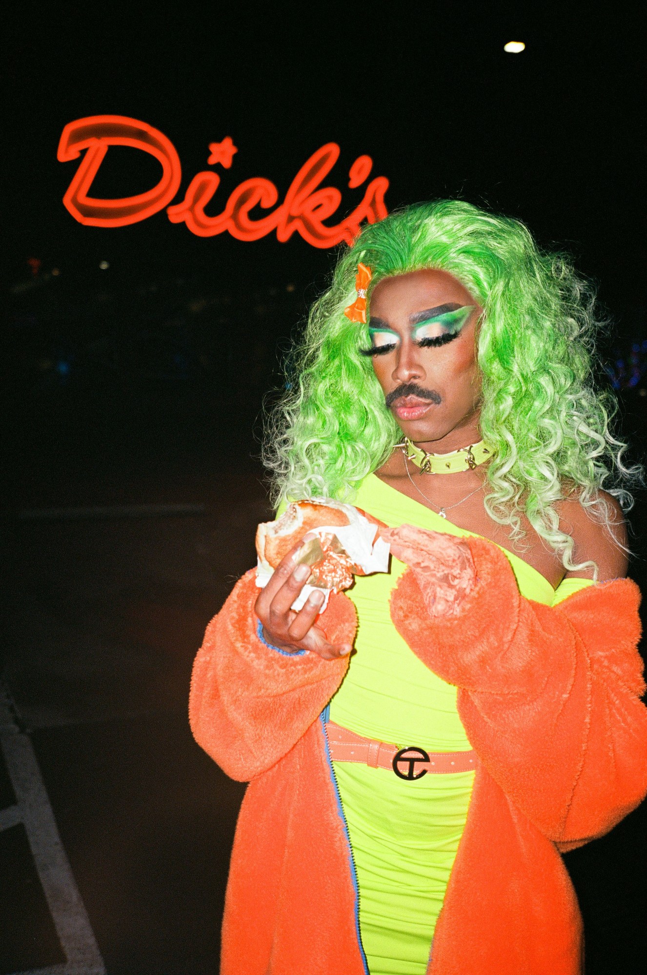 The resulting photos are dynamic and dreamy. Some capture the personality, the essence of the queens themselves. The glamorously Monday Mourning, balancing an unlit cig in her mouth as she fills up her gas tank. Kylie Mooncakes sitting astride a motorbike, perfectly perched in the chromatic light. The frenetic energy of being at a drag show; queens caught mid-performance with their arms outstretched almost beckoning you to them.