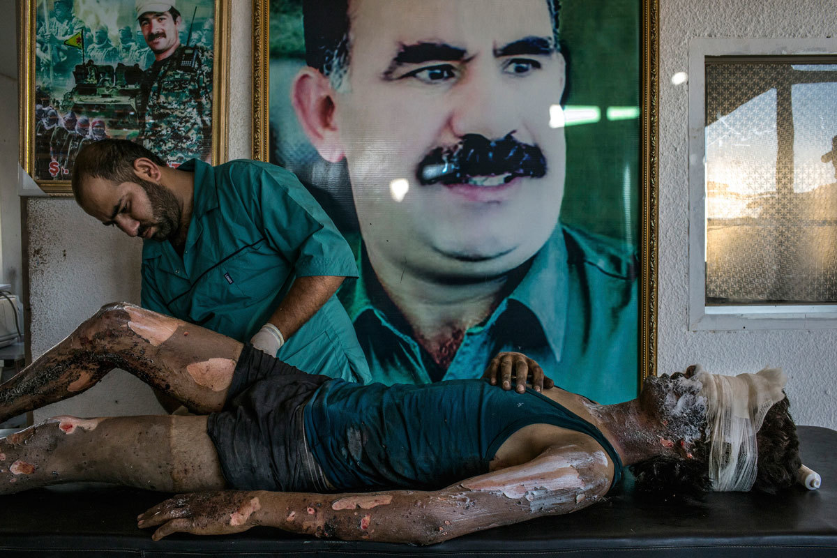 Mauricio Lima for The New York Times.A doctor rubs ointment on the burns of a 16-year-old Islamic State fighter named Jacob in front of a poster of Abdullah Ocalan, the jailed leader of the Kurdistan Workers' Party, at a Y.P.G. hospital compound on the outskirts of Hasaka, Syria on 01 August 2015.