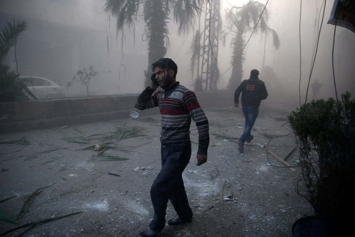 Sakeer Al Doumy forAgence France-Presse.A wounded man walks out of a dust cloud following reported airstrikes in the town of Hamouria, Syria, 09 December 2015.