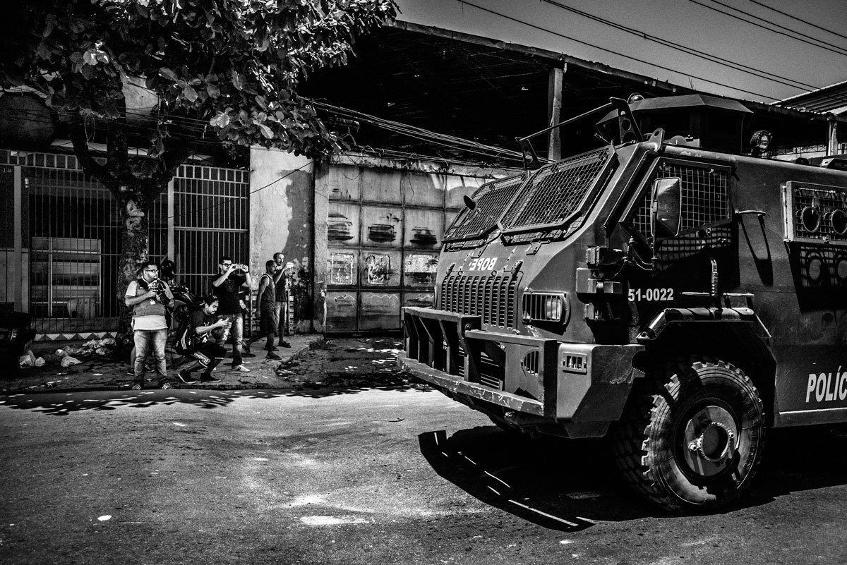 Sebastian Liste for Noor.Papo Reto collective members taking pictures and videos of the Special Police Forces tank car patrolling in the streets of Vila Alianca after a taxi driver was shot by police; Rio de Janeiro, Brazil, 08 February 2015.