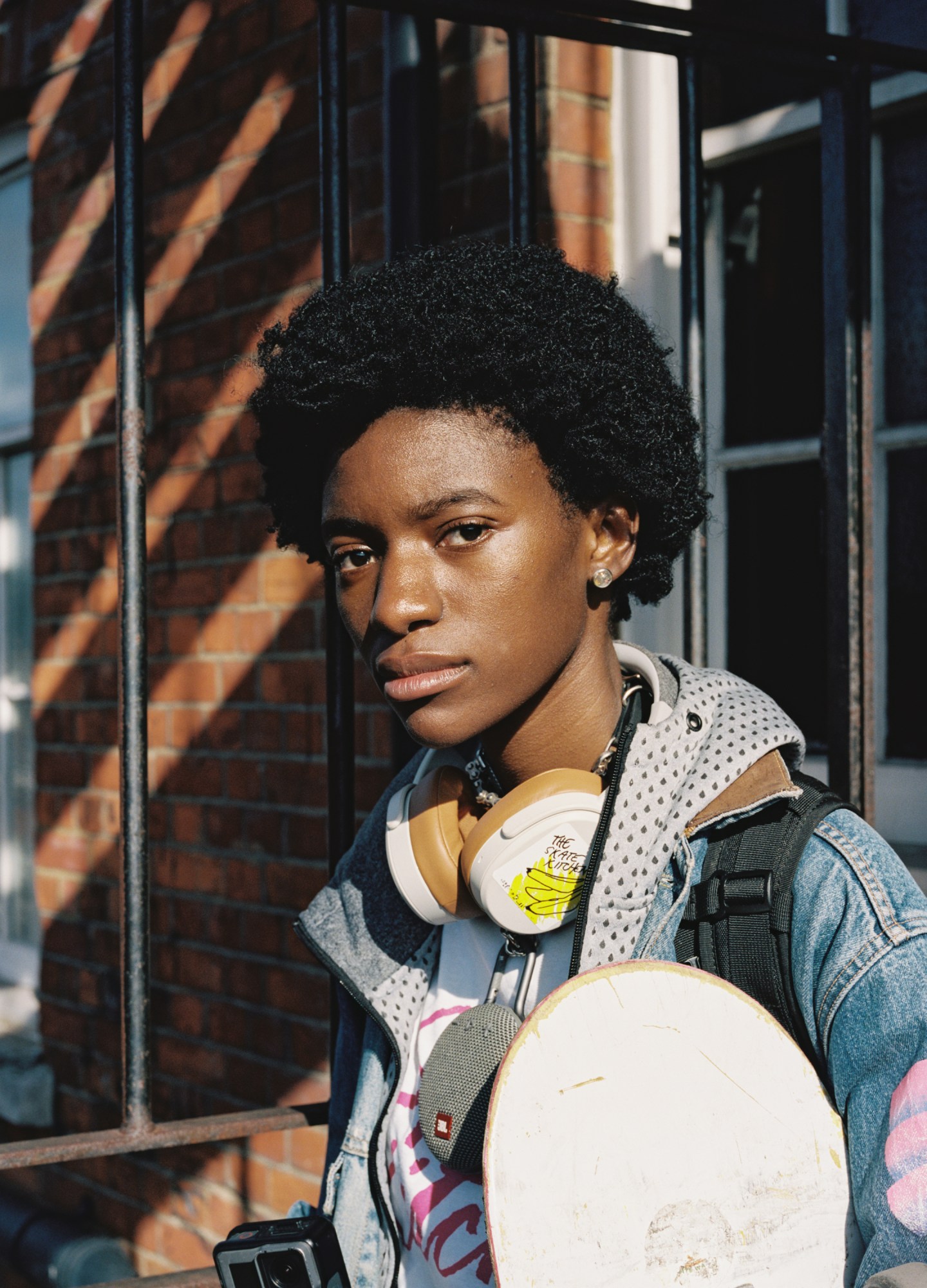Dede is “a lot funnier and a lot sillier than her character Janay,” says Crystal, while Kabrina often gets recognised on the streets for being ‘the girl that films everything’ — spending as much time documenting her friends with a camera in real life as she does in the film. “They’re like, I recognise your camera, you were in that movie Skate Kitchen,” Kabrina says.