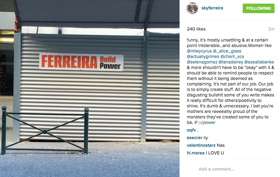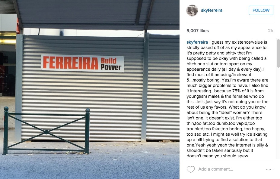Sky Ferreira has taken to Instagram to vocalize her disgust at the trolls who deem it appropriate to comment publicly about her and express their negative, unfounded opinions online. Typically these sentiments focus on appearance and within the context, perpetuate an unhealthy body-image culture. Often they’re just downright mean. Tired of her value being judged on appearance, Sky writes, “It’s pretty petty and shitty that I’m supposed to be okay with being called a bitch or a slut or torn apart on my appearance daily (all day & every day)”.