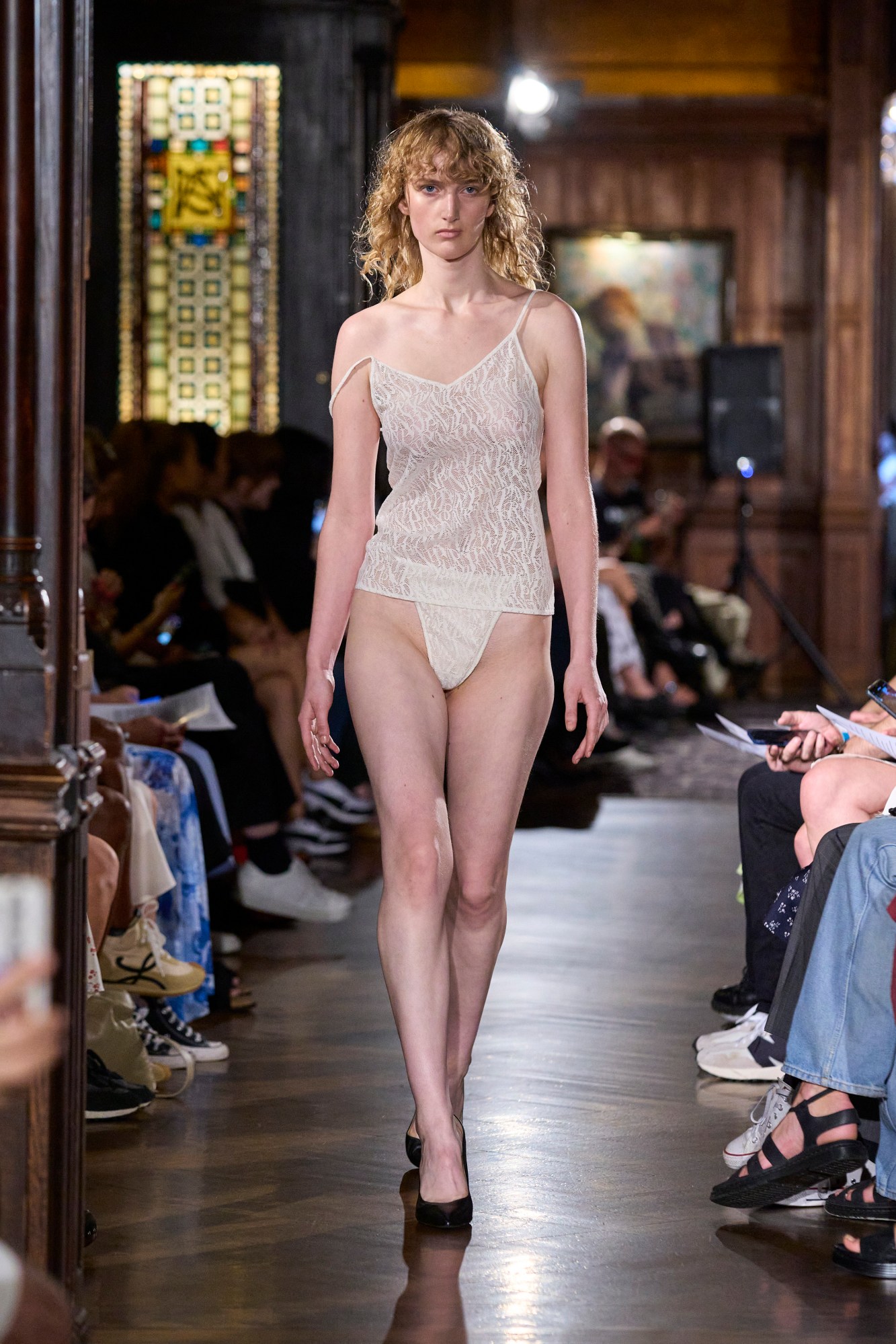 Kubrick also made an appearance at New York Fashion Week too. Amongst the chaotic mix of Y2K butterflies and Dante’s Inferno-inspired prints, Puppets and Puppets SS23 was an ode to the sexually empowered NYC woman, the kind who storms through her Raya likes whilst picking up a Starbies matcha latte on the way to her bookstyling gig. To convey that energy, the artsy label looked to Nicole Kidman’s character Alice in Kubrick’s final movie, the incredibly-horny psychological drama Eyes Wide Shut (1999). A sheer camisole top made out of a lacy fabric and a matching pair of ultra high-cut briefs — reminiscent of Alice’s famed lingerie scene — appeared on the runway with a pair of work-ready black pumps. Elsewhere, look closely at trousers, dresses and two-piece tailored suits and you’ll see an orgy of naked bodies — a reference to the sexual drama at the heart of Nicole and Tom Cruise’s relationship in the movie.