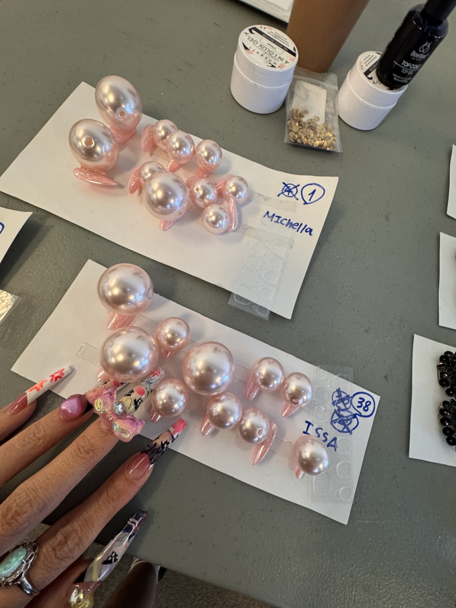 “This was my first season working with ALL-IN and I was so excited when they shared the show concept, ‘Uptown Girl,’” says nail artist Mei Kawajiri, “I love the 80s mood and feel.” Collaborating with design duo Benjamin Barron and Bror August Vestbø and stylist Lotta Volkova, the looks constantly evolved in the two weeks leading up to the show. “We probably created 300 nail tips for this show,” Kawajiri explains on how she pushed the glamour to the nth degree. “Larger, brighter sequins. Pearls as big as could possibly fit on the nail tip.” The cherry on top of an opulent reimagining of a New York City girl trying to find her way in the world. “To me, nails have always been an accessory that is just as important as shoes or jewellery,” Kawajiri adds. “The nails were such an important part of the character this season and I’m so happy to have collaborated with like-minded creatives on bringing their vision to life.”