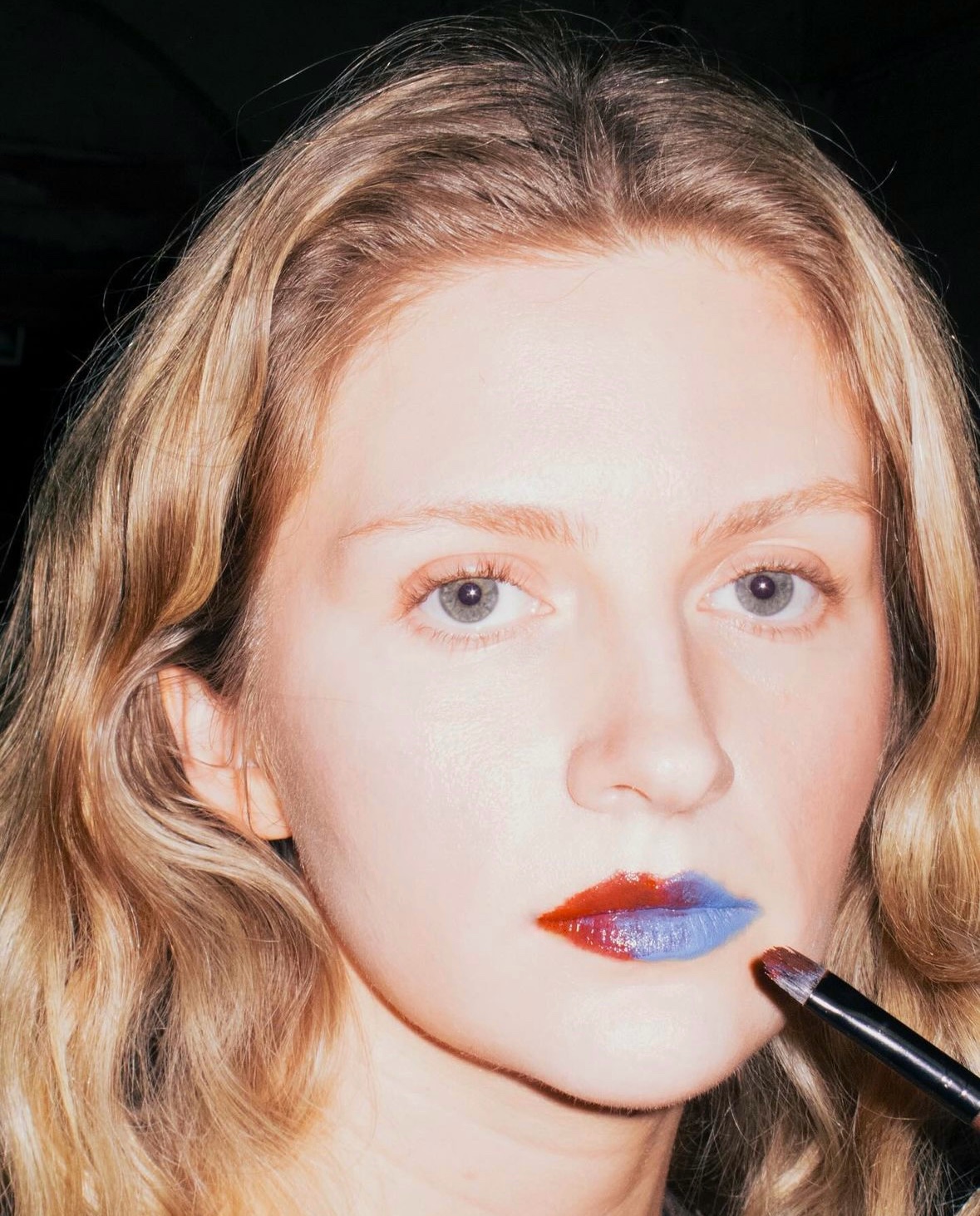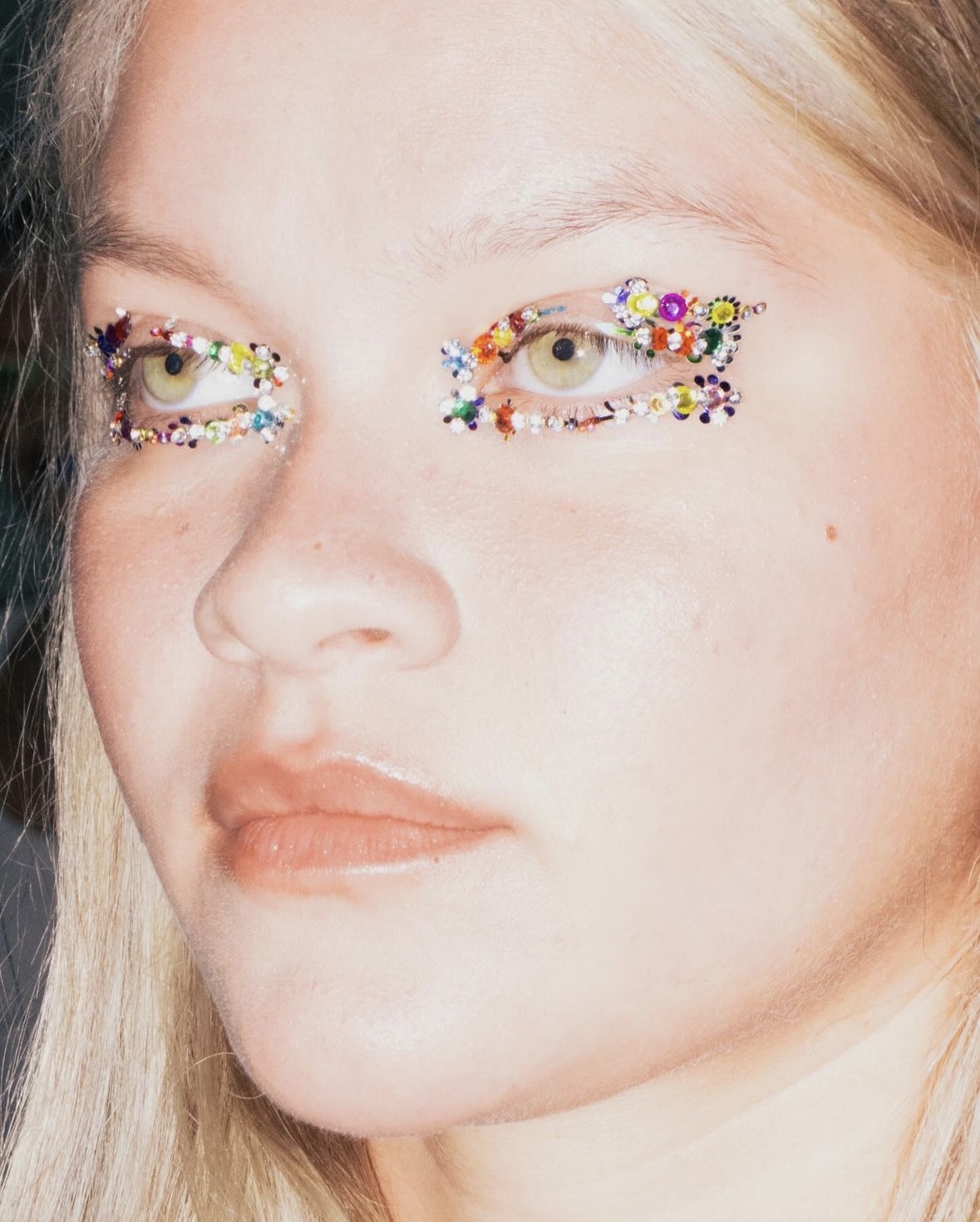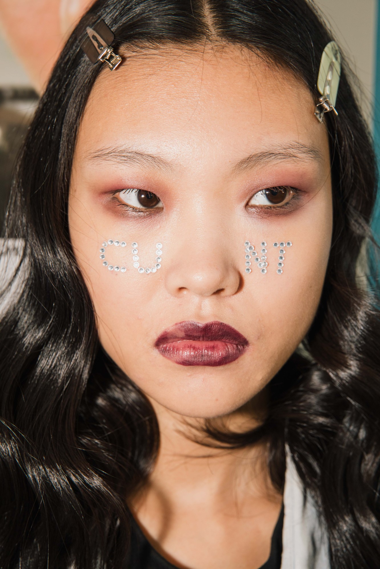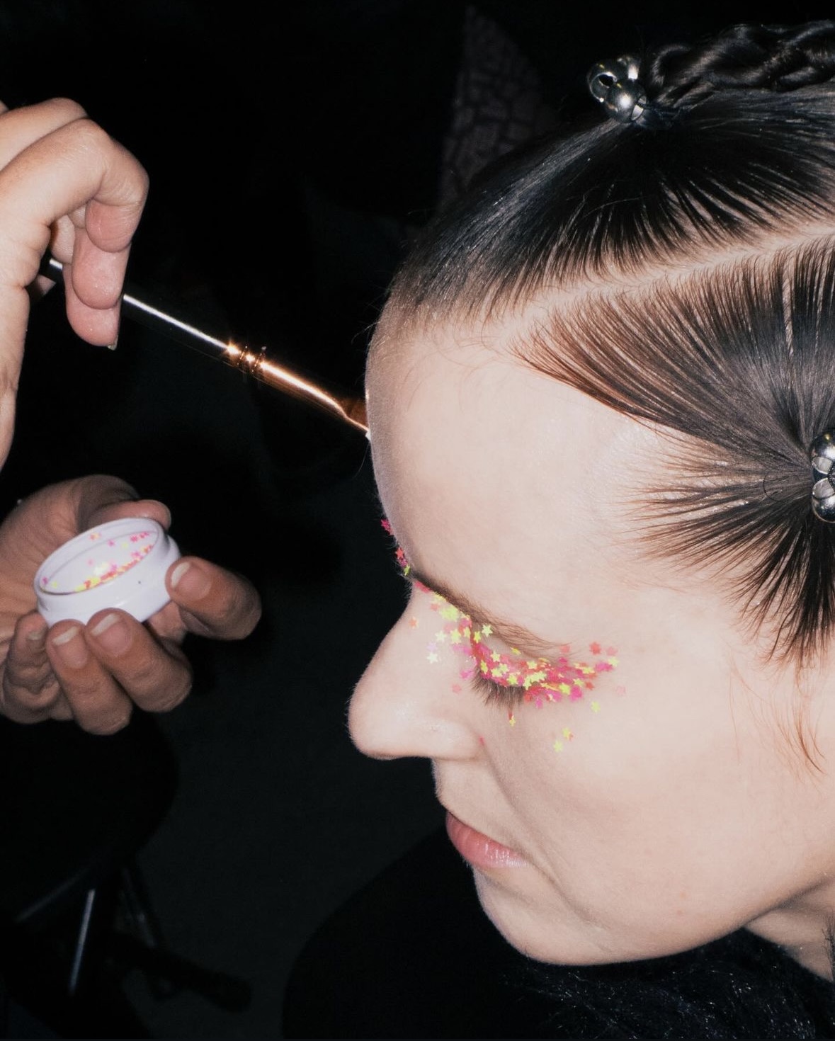 Opting for a single show a year, Chopova Lowena designers Emma Chopova and Laura Lowena-Irons leave no holds barred for their solo outing. “It really was chucking everything we liked in the pot and seeing what happened,” says make-up artist Lauren Reynolds on the approach this season. “We had a huge creative document on the go with hundreds of references, sectioned into different characters relating to the world they were building. We sent ideas back and forth, then tested for two days in their studio trying everything out and whittling it down.” What was left was a buffet of striped neon liner, clusters of kaleidoscopic crystals circling the eyes, constellations of star-shaped stickers and gothic black lips. A mix of can-can dancers, saloon girls and cowboys, the ‘feral gymnast’ characters were a cornerstone of the collection. A mass of bouncing ringlets was created by hairstylist Kiyoko Odo. She “combined classic hair styles with punk to create the Chopova Lowena style”, Reynolds adds, “they’re tearaways, so they’re messy and unruly and their make-up isn’t regulation but more individually expressive. It’s bold and rough, but that gives it a lot of energy – a certain innocence and playfulness that ties in well with the show.”