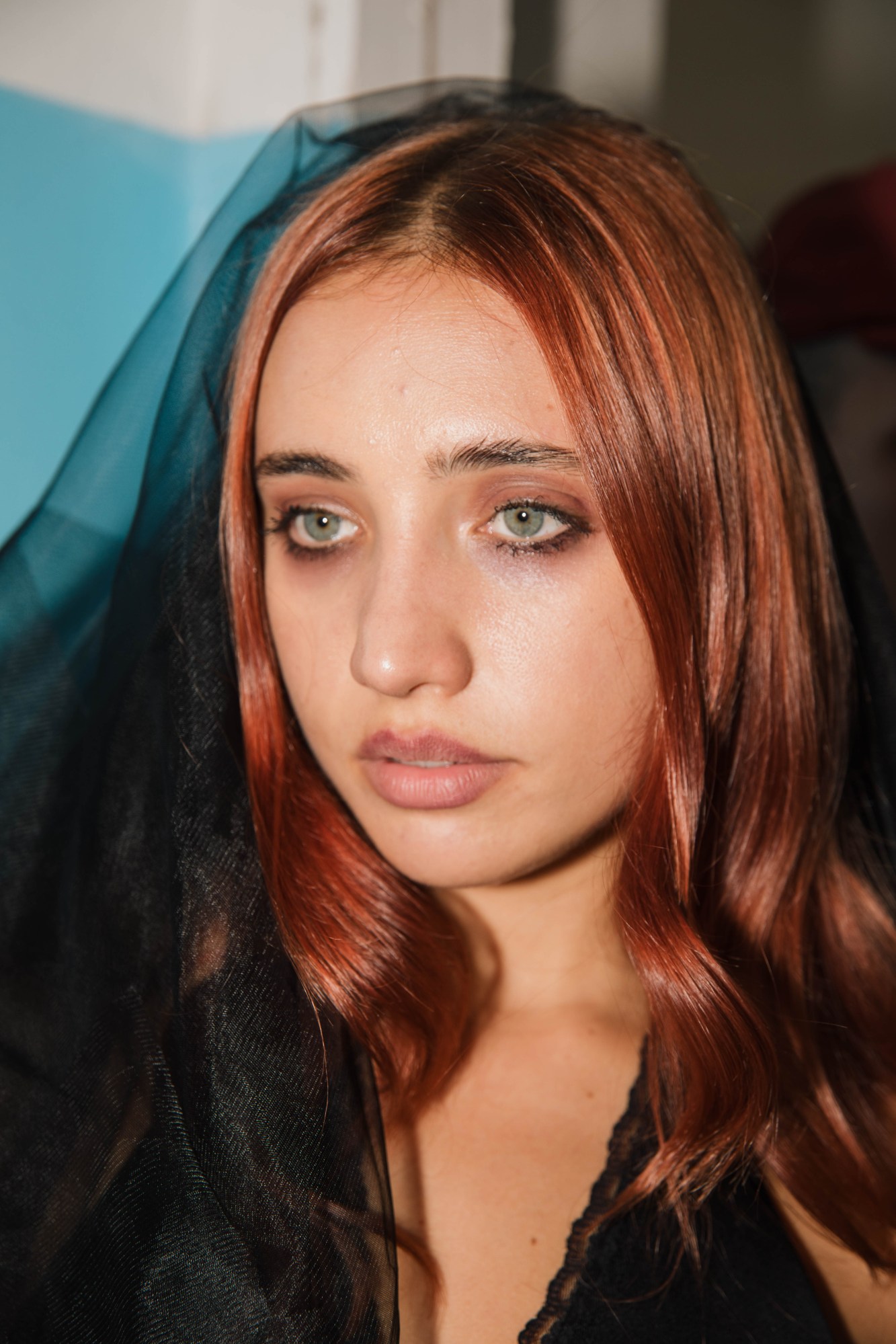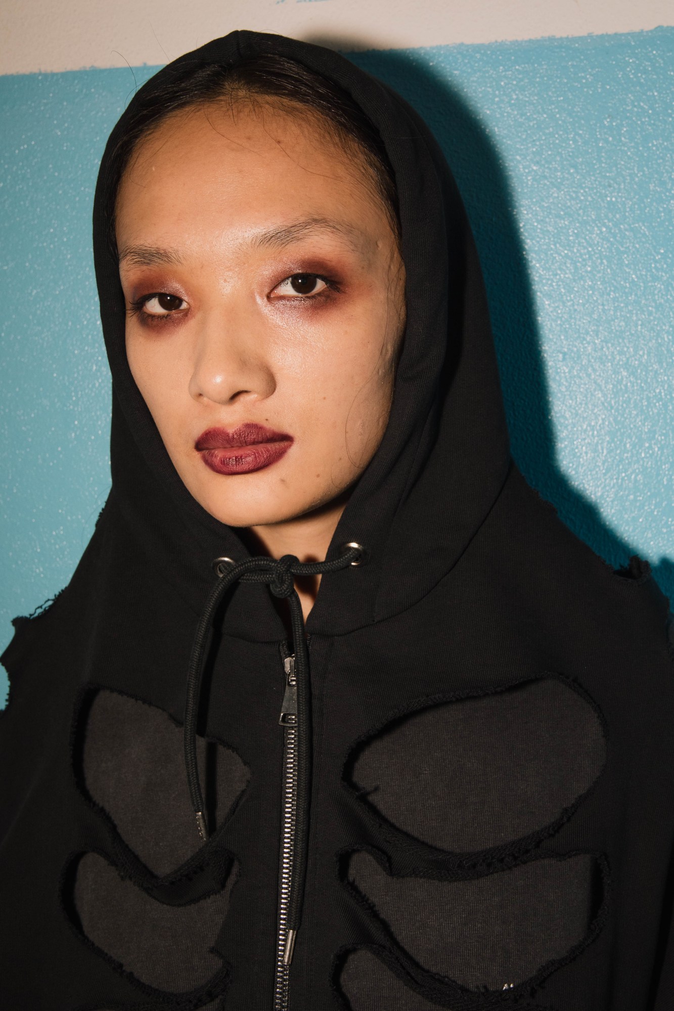 SS25 marked the runway debut for Alexandra Vincent and Zarina Bekerova’s London-based brand Mainline:RUS/Fr.CA/DE. Tapping make-up artist Lynski, the collection’s deconstructed jersey looks and relaxed tailoring were paired with glossy smokey eyes in brown and black that varied from subtle to panda-like. “I told the brand ‘smokey eye, but burn my eyes out’, in reference to being very exhausted to look at the world at the moment,” she says. “I love earthy tones, I can look at them forever and working with them feels very meditative and peaceful. It’s so close to skin tone, you’re not really applying it, it’s just you and the colour working in synergy.” Grounded in a feeling of being “easy, tactile and very real”, you too can achieve the Mainline look. Simply grab your black kohl pencil, brown eyeshadow and vaseline, blend it all with your fingers and you’re set.