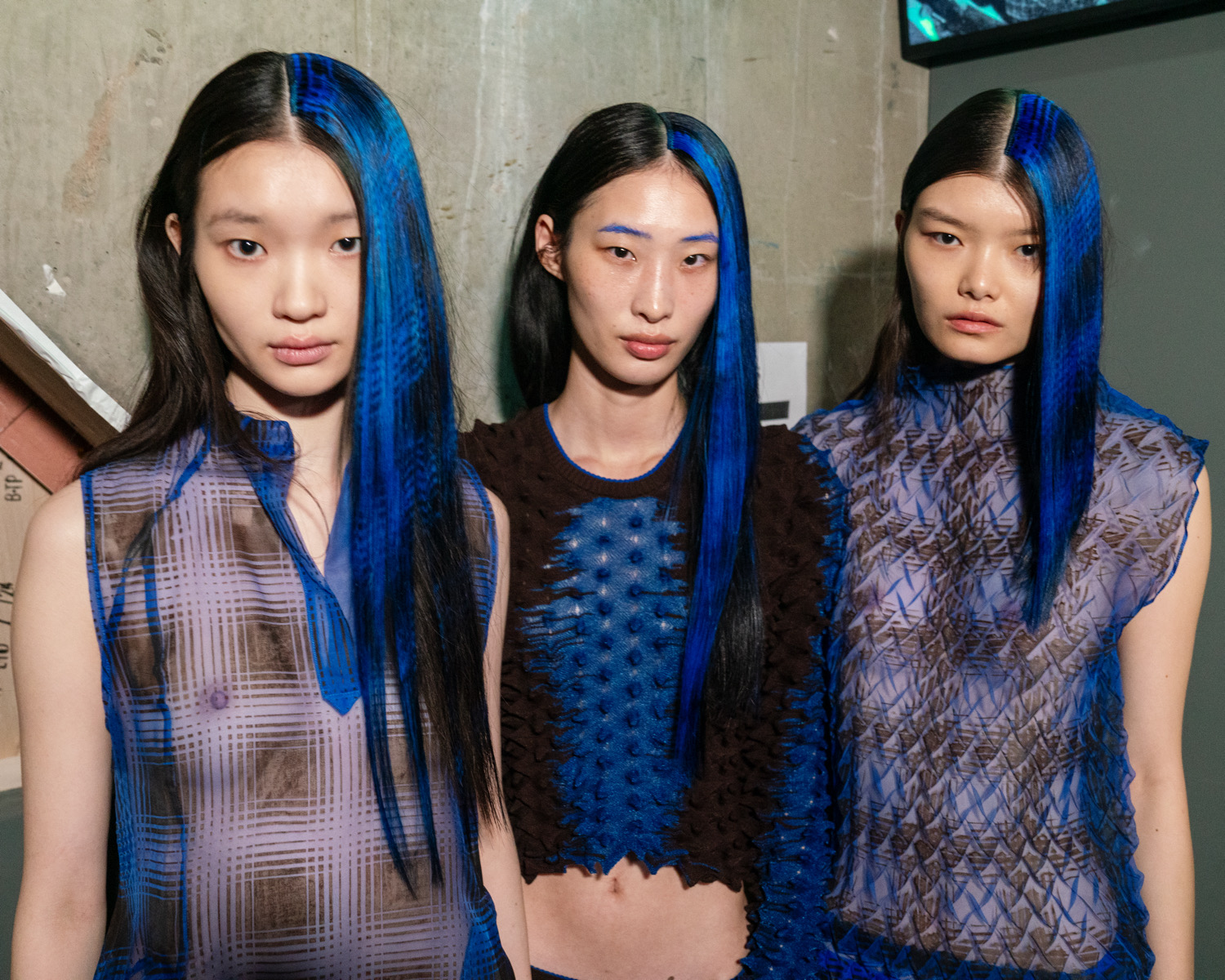 “It’s always a dream collaborating with Chet,” says hairstylist Anna Cofone, “he loves hair and is passionate about creating something new and different for every show.” For the London-based designer’s SS25 collection – a touching ode to his mother, charting her journey from computer science to artist – hair became an accessory, complimenting the sophisticated knitwear and signature spikes on display. “We wanted the patterns and colour of certain pieces in the collection to be carried through into the hair to almost create one full look from head to toe,” Cofone explains of the flashes of electric blue and charcoal grey tones in the models’ hair – the collection’s prints transposed straight on to the scalp. “The veils were dyed using the key colour of the look and then the patterns were hand-painted ahead of the show using stencils we made. It was a long, but fun process!”