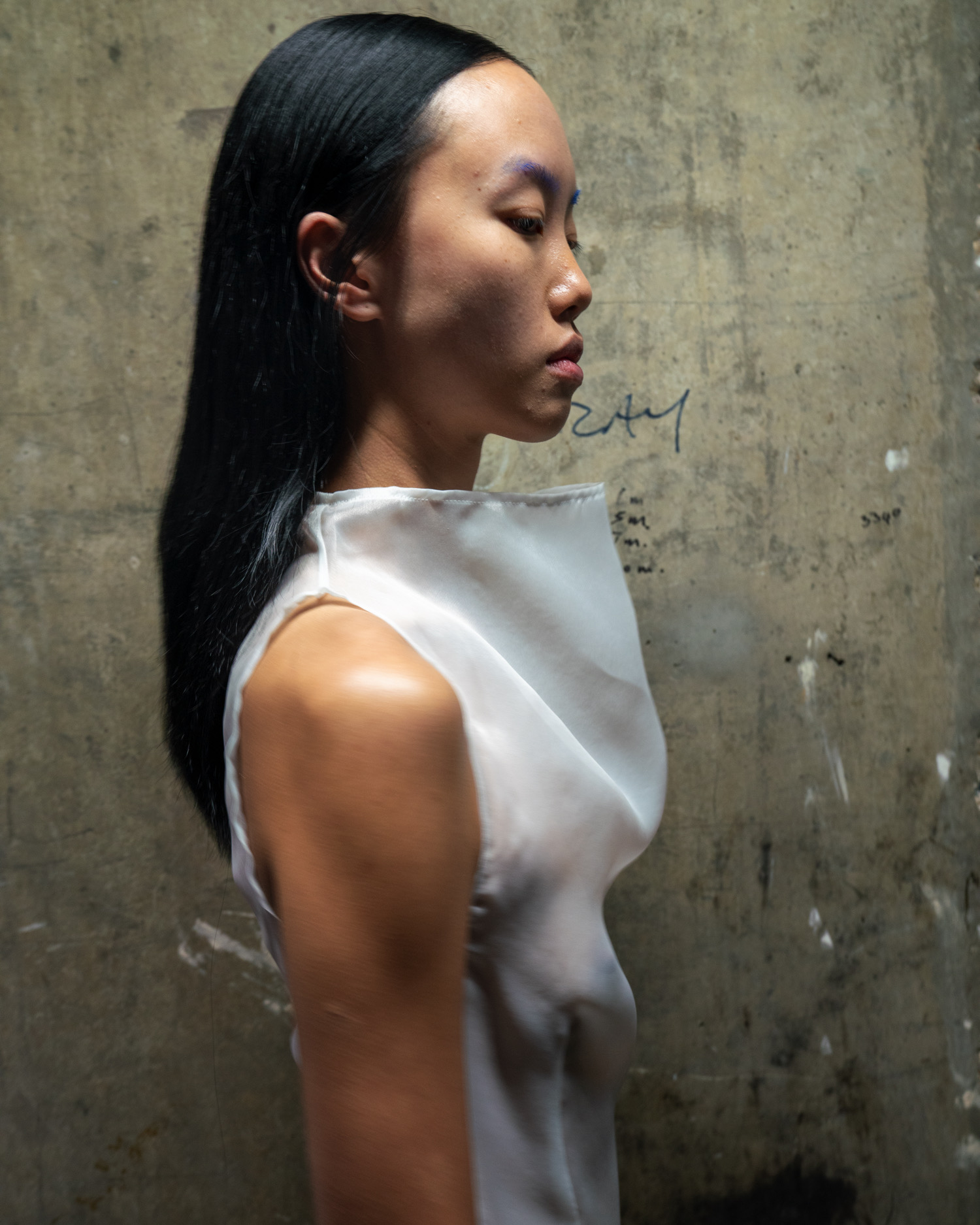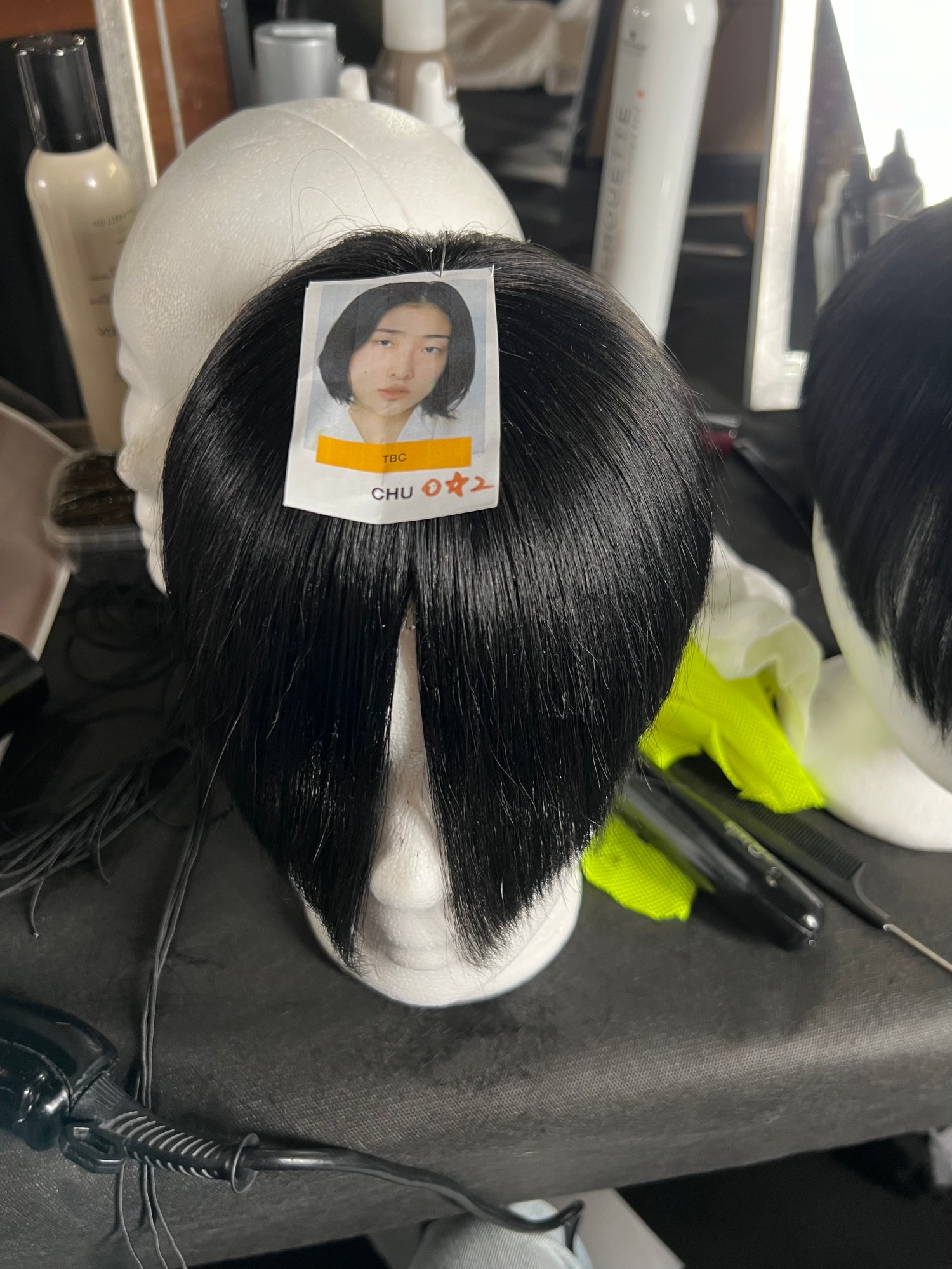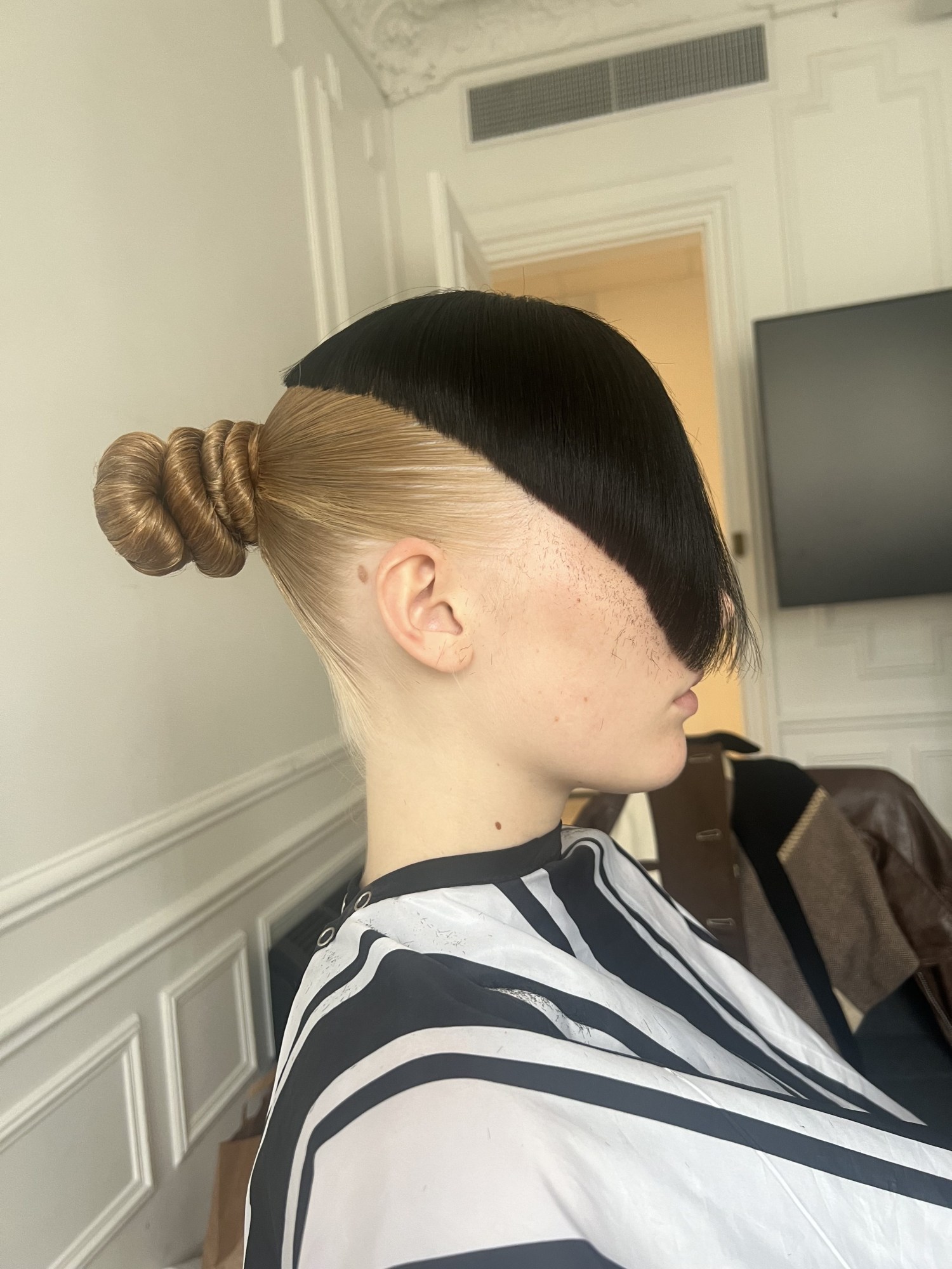 Wig wizard Zhou Xue Ming unexpectedly found himself at Paris Fashion Week for the first time this season after Mugler’s creative director Casey Cadwallader came across his work. “A photo assistant cut some discarded background paper during a shoot and the shape gave me some inspiration,” he explains. “I made it into hair and my idea spread through the internet before Casey discovered it. Most of my creative inspirations come from points in my life that touch me and start endless associations that transform into my creation of wigs.” Echoing Cadwallader’s return to sharp tailoring favoured by founder Thierry Mugler, Ming’s severe face-obscuring bangs too were cut with razor-sharp precision. “Sharp cuts, structured lines with a small slit to reveal the texture of the skin,” he says.