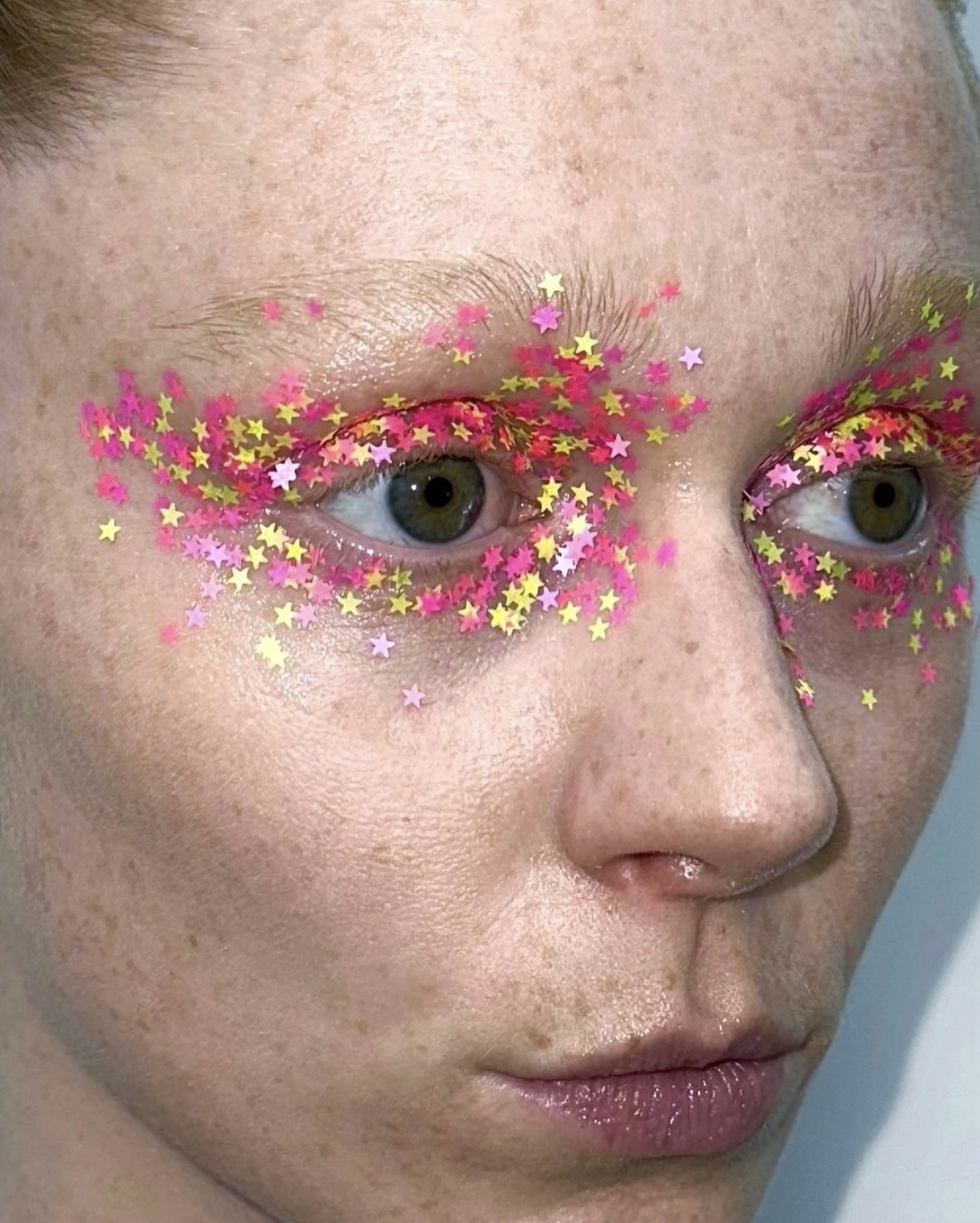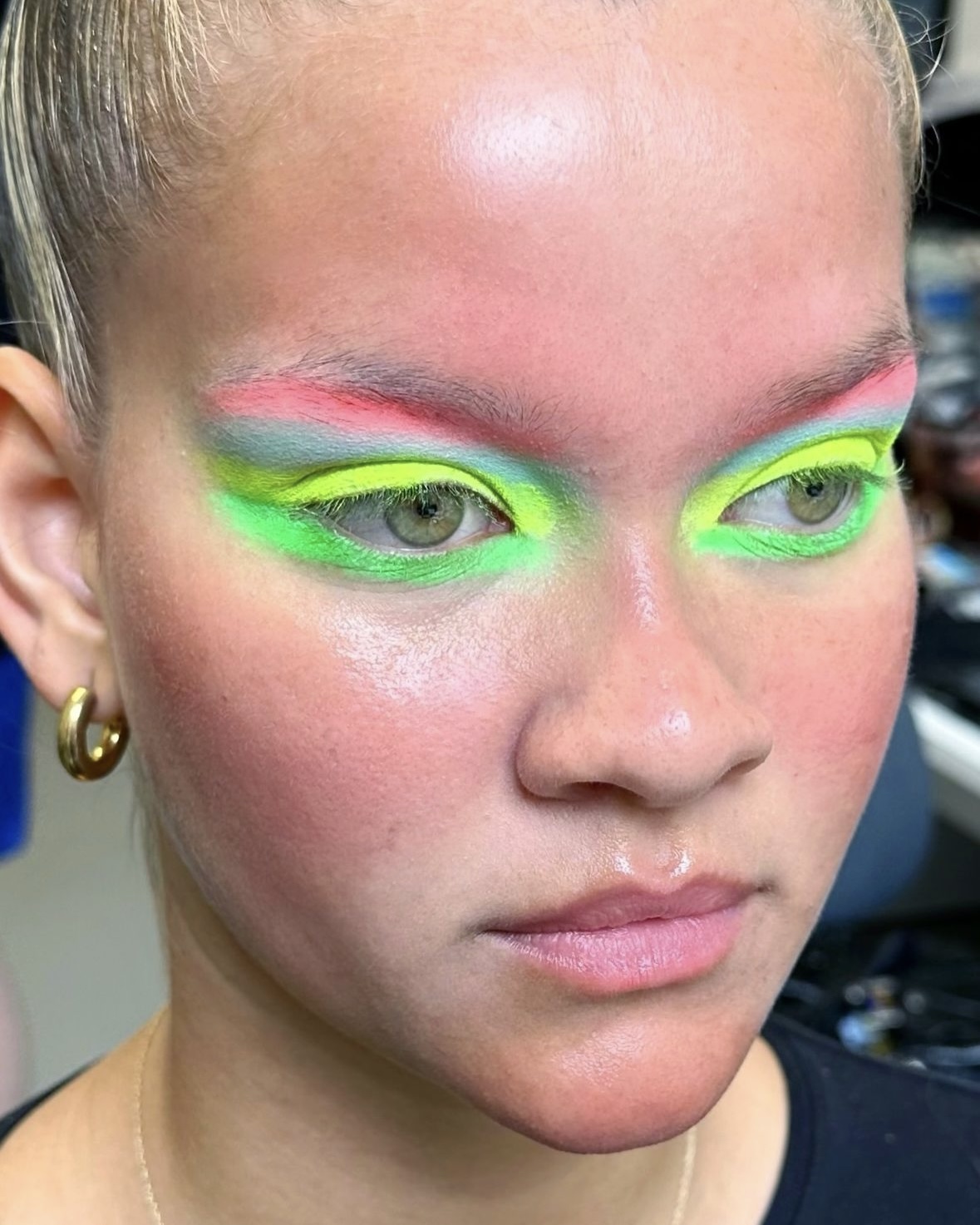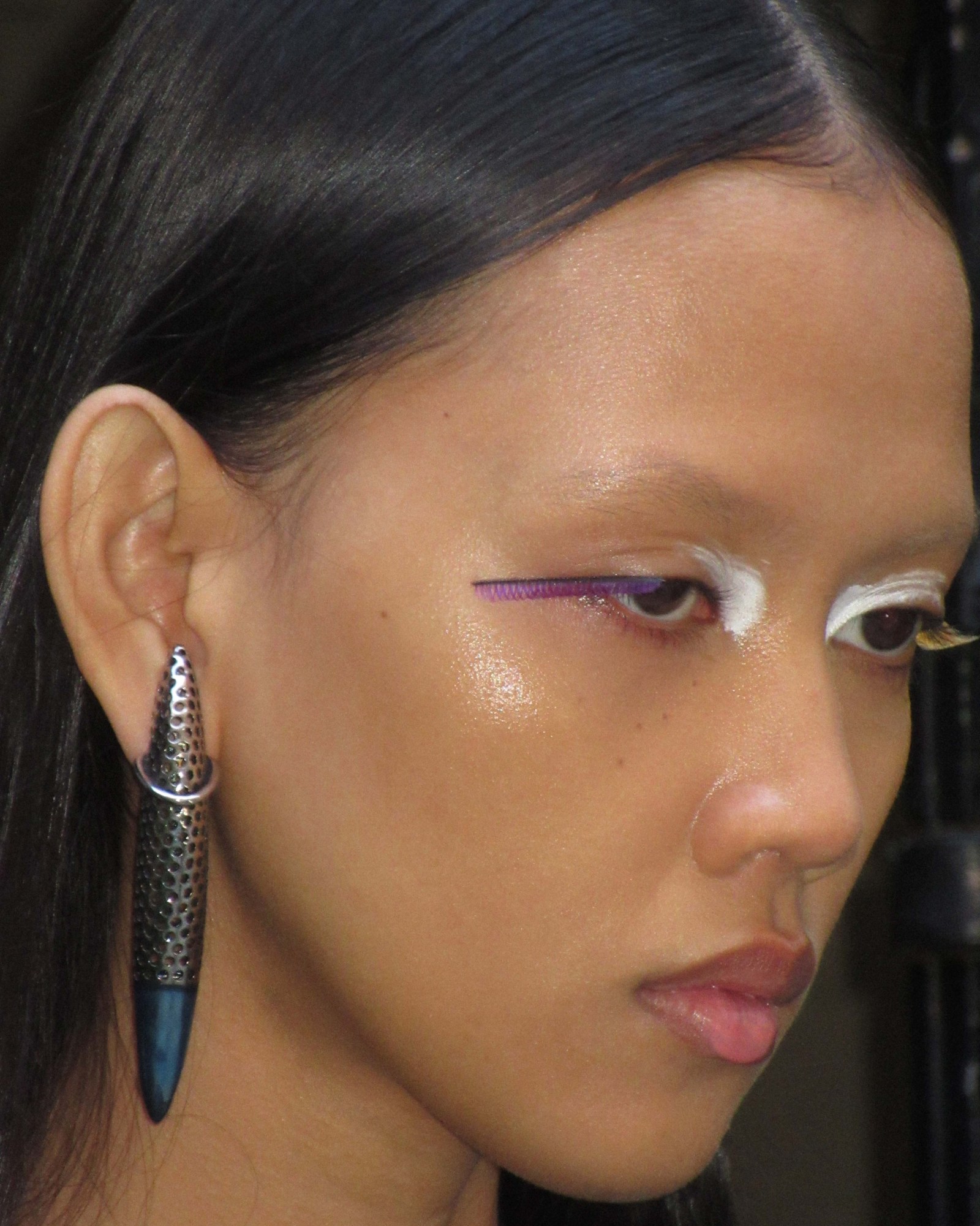 “Our first chat together was really about 60s science fiction movies and futuristic flight attendants,” says make-up artist Siddhartha Simone on conceiving the accompanying beauty looks for Laura and Deanna Fanning’s SS25 collection for Kiko Kostadinov. “When I saw the colours of the collection, I knew I wanted to create something feminine nodding to that era, but with a modern approach.” Describing the look as “quite minimalistic and bold at the same time,” Simone repurposed an assortment of colourful lashes and used them in place of liner – complimenting the retrofuturistic up-dos courtesy of hairstylist Olivier Schawalder. “I wanted to place them differently, so they felt ‘off’ and it made them look like they’ve just got off a red-eye and accidentally glued two different colours on themselves,” she says. Adding a touch of shimmer on the inner corner and bottom lip for added dazzle, these ladies were ready for liftoff.