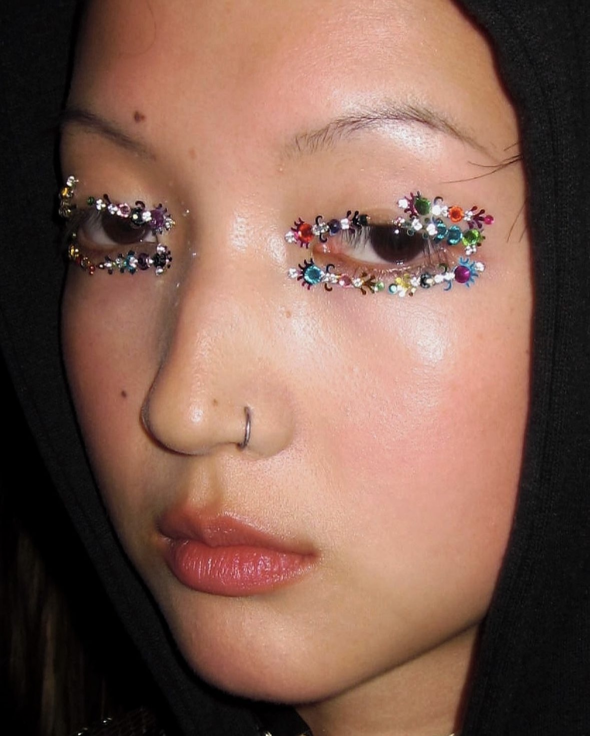 Similar to the spectacle of Pat McGrath’s haunting porcelain doll skin at Margiela’s Artisanal 2024 show in January, bold beauty with a distinct point of view is back. Some artists blurred the lines between clothing and cosmetics, like Marcelo Gutierrez’s feather work at Palomo Spain or Anna Cofone’s hair prints for Chet Lo. Others – from crystal-encrusted eyes created by Lauren Reynolds at Chopova Lowena to Mei Kawajiri’s bulbous pearl-adorned nails at All-In – simply wanted to have fun.