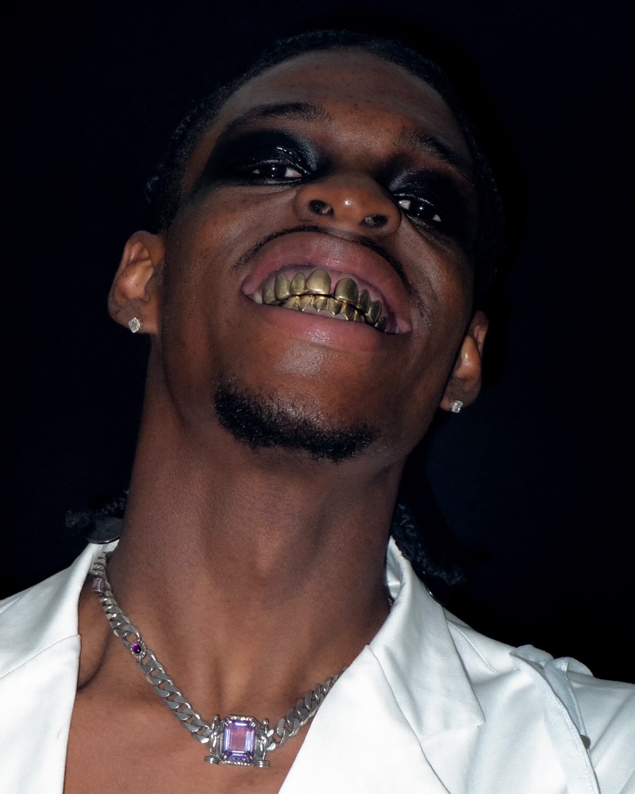 Beate Karlsson is Milan Fashion Week’s resident prankster. Her models at Avavav have survived their clothes falling apart at the seams and trash being thrown at them. This season, they were marched off to the Forza e Coraggio arena to participate in a mandatory sports day. “The collection challenges traditional fashion norms by blending irony, technical precision and dramatic flair,” explains make-up artist Michele Magnani. Sweating while running laps in frog-toed heels, models wore smudged smokey eyes, smeared lipstick and impractical nails that fused sets on both hands together. Nodding to the collection’s adidas Originals collaboration, topless models were painted in bootleg knock-off jackets. “The collaboration celebrates Avavav’s playful and experimental spirit and adidas’ sporty, functional edge,” explains Magnani. “The two body-paint designs blend the body with the deconstructed garments, blurring the line between fashion and art. Integrating the human form with the designs creates a cohesive high-fashion visual narrative that elevates the artistic value of the collection.”