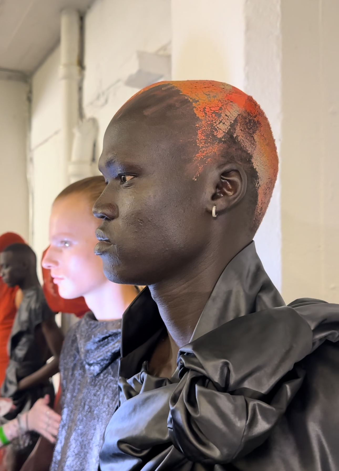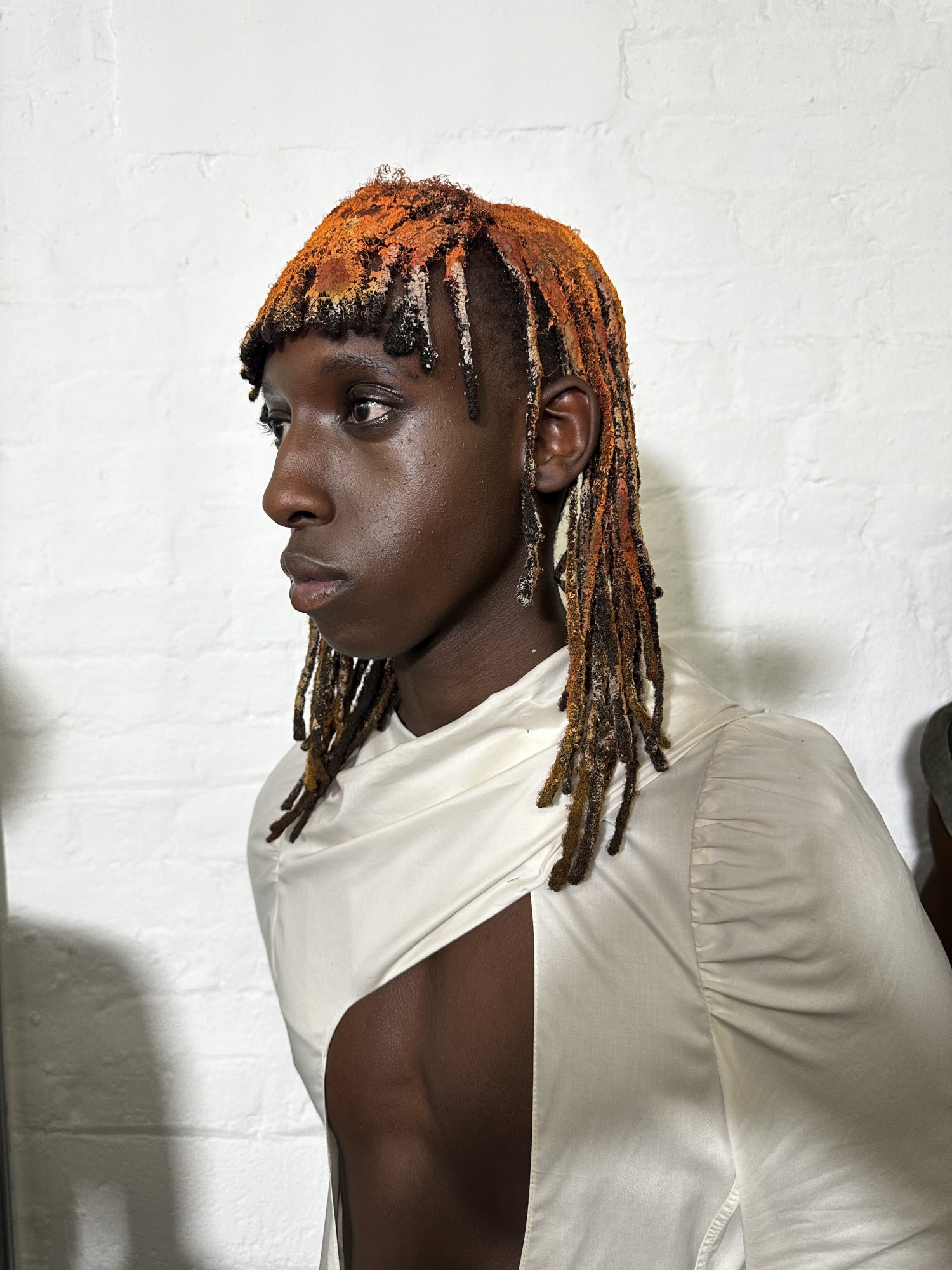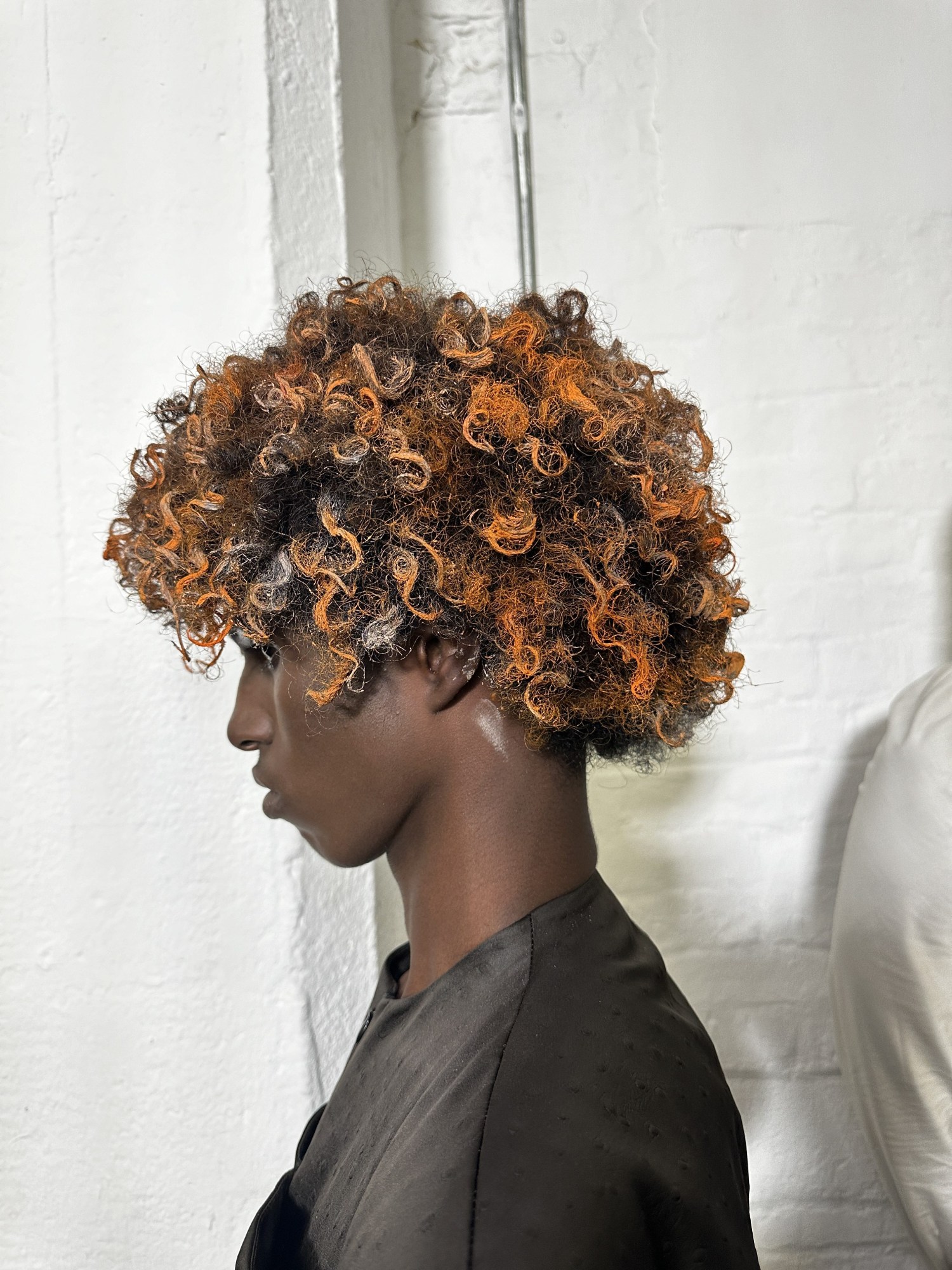 Making their Fashion East debut this season, designers Cameron Williams and Jebi Labembika built on their foundation laid at Central Saint Martins. Louche hooded jersey tops slashed open at the chest and sculpted taffeta trousers and coats, were a product of the duo’s heritage – bouncing from Jamaica to Cameroon via south London. “As soon as I saw the moodboard, I was immediately excited,” says hairstylist Clare Hurford on collaborating with the pair on their debut. Matching the rust-coloured garments in the collection, the models’ hair looked like it had been slicked with a radioactive earthen ore. “Jebi and Cam were very specific about the texture they wanted the hair to be coated with, so I experimented by layering different products and colours to create an oxidised, cracked mud effect which could work across all hair textures and be easily removed,” Hurford explains. “We prepped a lot of different options of burnt orange hair, coated braids and various structured pieces.”