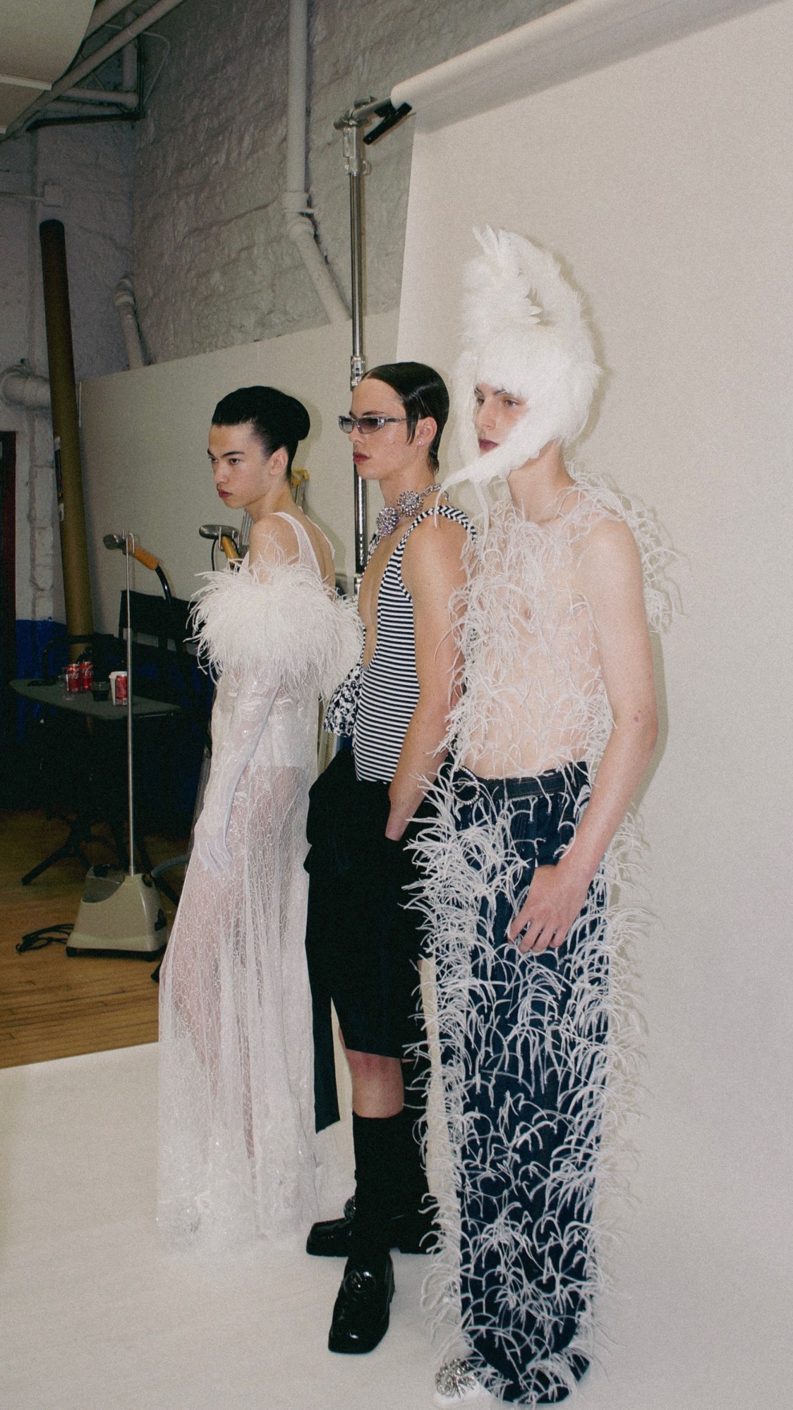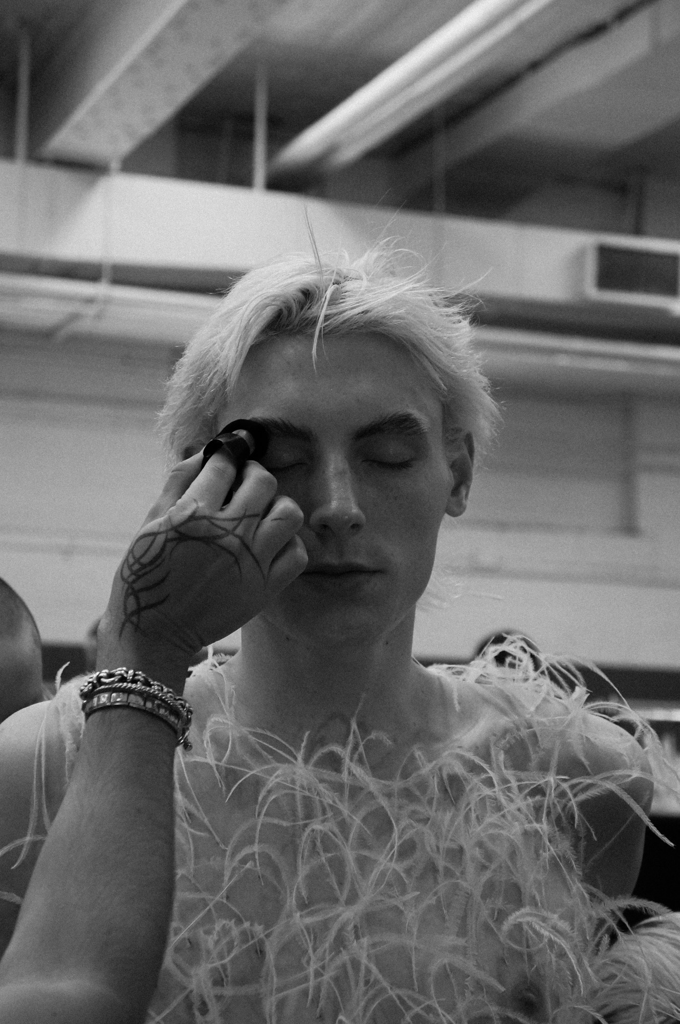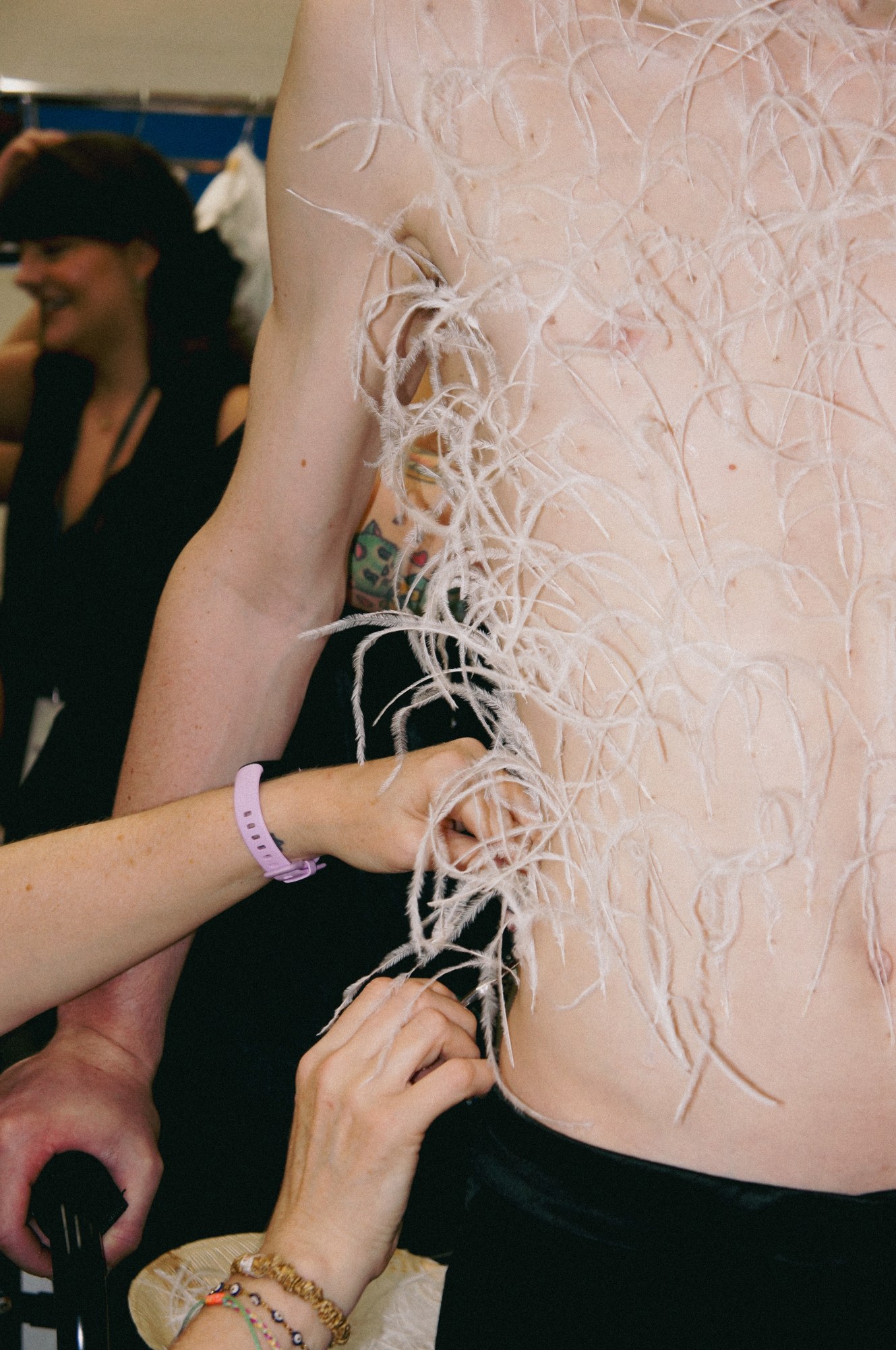 After a brief hiatus, Alejandro Gómez Palomo’s sexy menswear label Palomo Spain returned to New York Fashion Week this season. An indulgent feast of silk, studs, fringe and print, amid bright feather wigs and slicked styles courtesy of Laurent Philippon, was a look that seamlessly blended fashion and beauty. Conceptualised by make-up artist Marcelo Gutierrez, tufts of white ostrich feathers appeared to sprout from one model’s skin – perfectly matching his plumed trousers. “Fashion shows are the perfect time to play with craft, theatrics, spectacle and sensorial techniques,” Gutierrez says. Created over the course of four hours by a team of four artists, the plumes comprising the invisible shirt were meticulously applied by hand to match the collection’s trousers. “It really took the look to a whole new level and added a dimension of fantasy to the show.”
