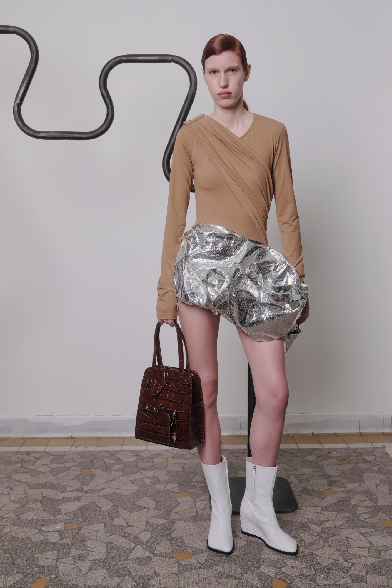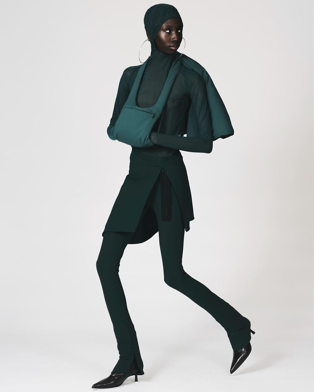 SS25 marks Johanna Parv’s solo debut after her final collection under Fashion East in February. While form and function are at the crux of the Estonian designer’s looks, it’s not Gorpcore, but something entirely in its own lane: think practical elegance for the professional woman biking to work, or running cross-country at the weekend. A uniform of skorts, hooded tees and coats with cutouts in muted tones, Parv has nighttime covered too in the form of stretch maxi dresses with matching opera gloves and pointed heels poking out from slim-fit nylon trousers.