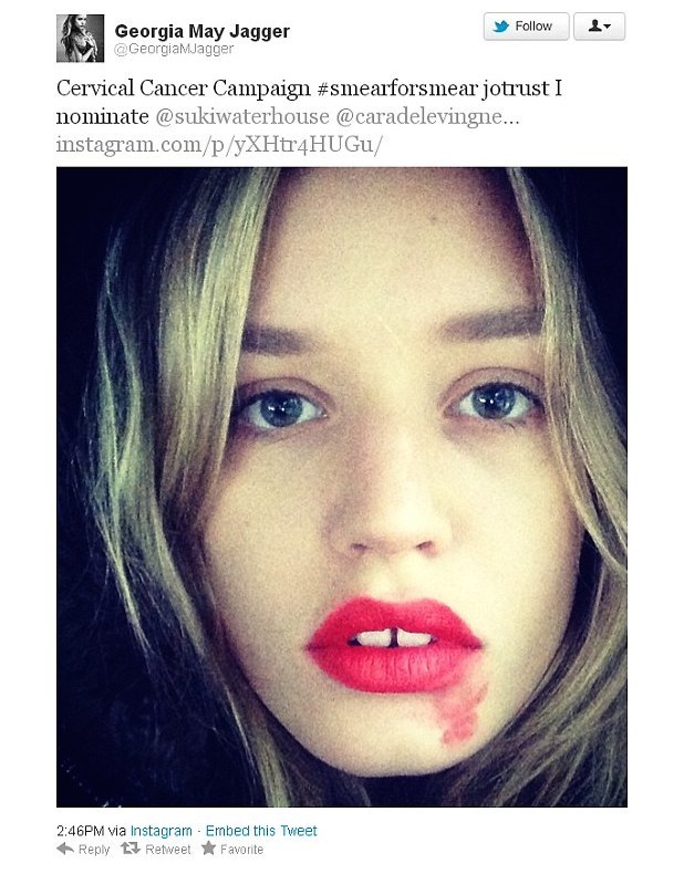 Fighting for a cause and not applause, Georgia May Jagger leads the pack in #SmearForSmear, a campaign set up by Jo’s Cervical Cancer Trust to bring awareness to the deadly disease which has claimed the lives of millions of women aged between 25-29 over the last 10 years. By posting an image of yourself online, with lipstick smeared all over your face, and using the hashtag #SmearForSmear, the campaign urges women to attend their smear tests regularly and help catch cervical cancer early on. With Georgia’s nominees – bffs Cara Delevingne and Suki Waterhouse – next to follow suit, the campaign looks set to go viral. Join in now, we nominate you.