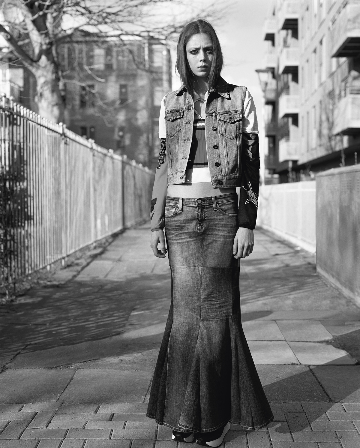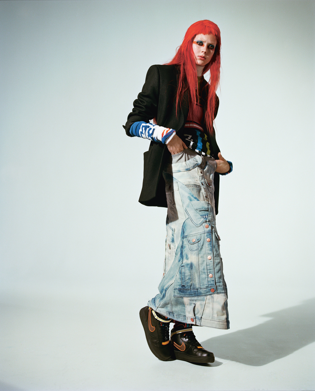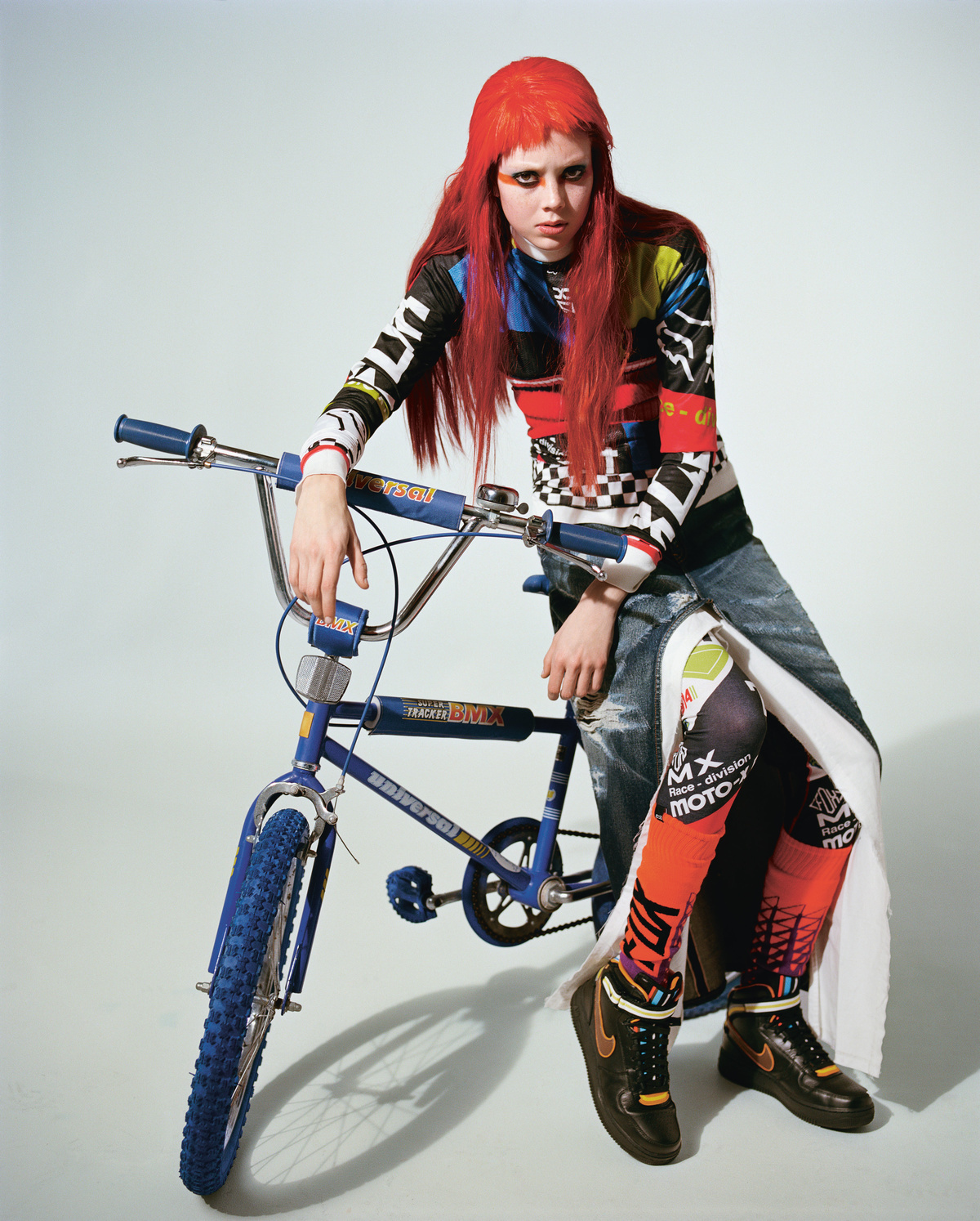 Jacket Christophe le Maire. Top One Industries. Roll neck Uniqlo. Jeans 7 For All Mankind customised by fashion director using Troy Lee Designs. Trousers CI Sports. Bra and leg warmers (used on arms) Prada. Socks O'Neal.