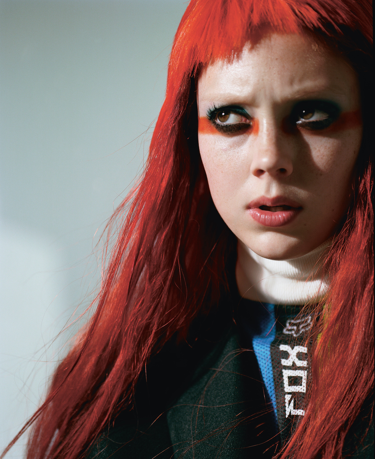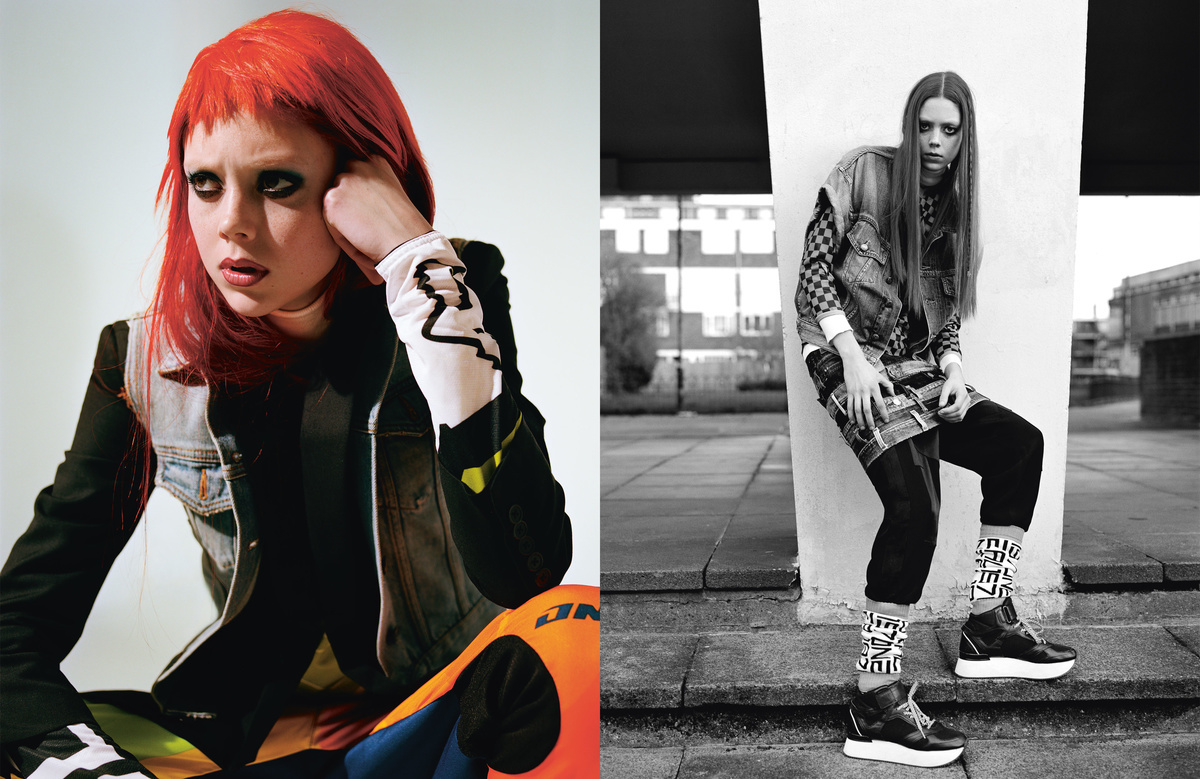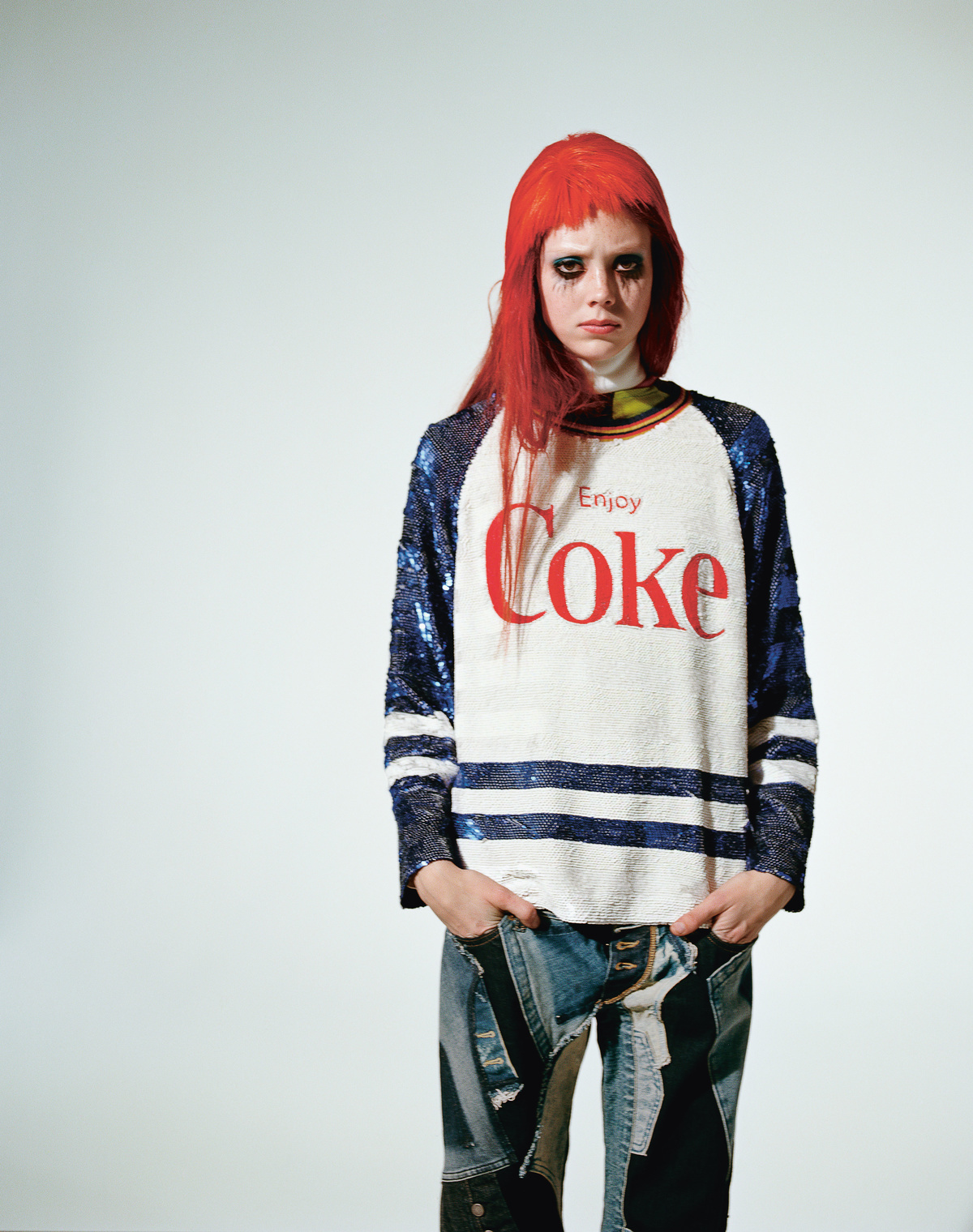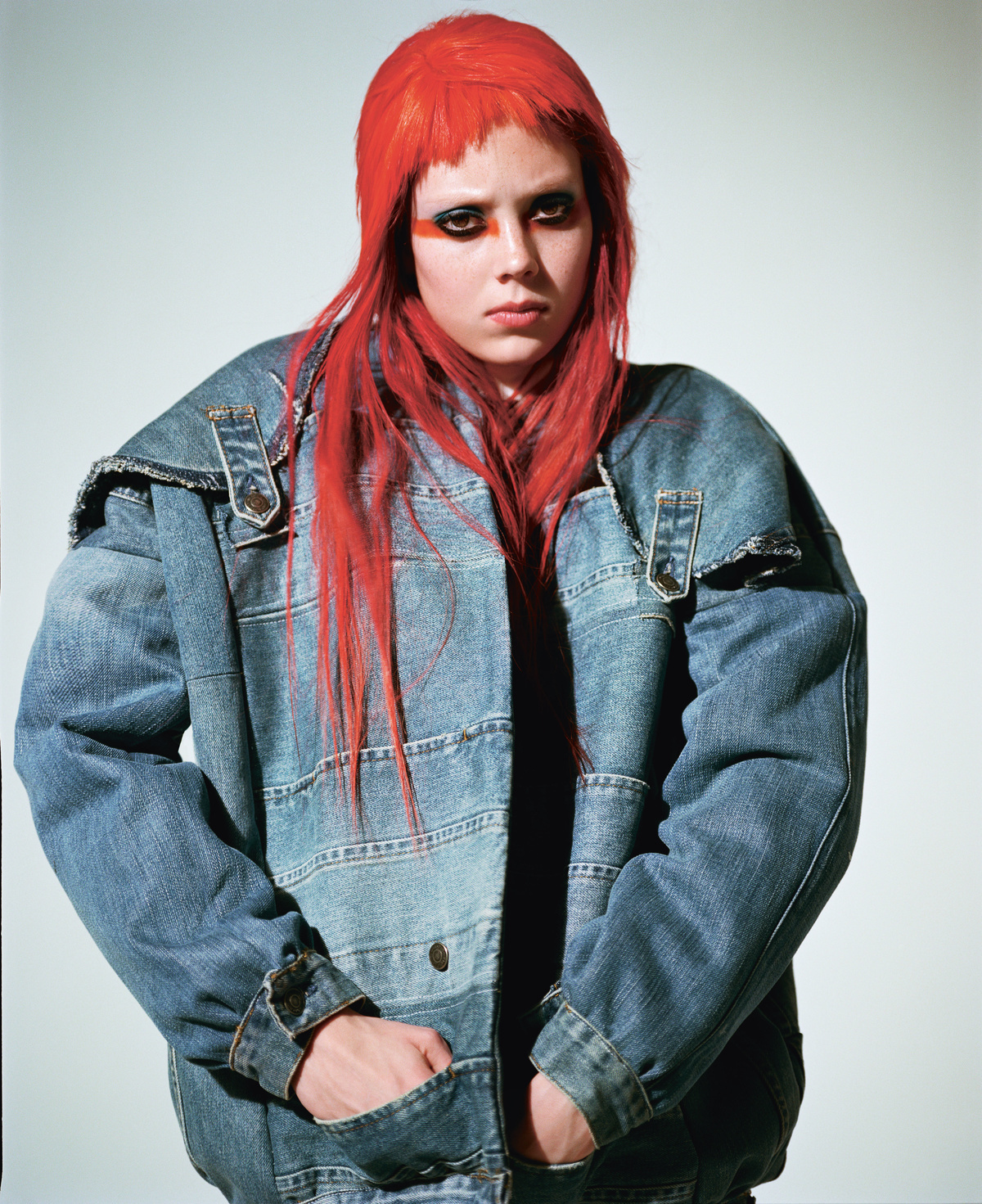 Jacket Christophe le Maire. Top One Industries. Roll neck Uniqlo. Jeans 7 For All Mankind customised by fashion director using Troy Lee Designs. Trousers CI Sports. Bra and leg warmers (used on arms) Prada. Socks O'Neal.