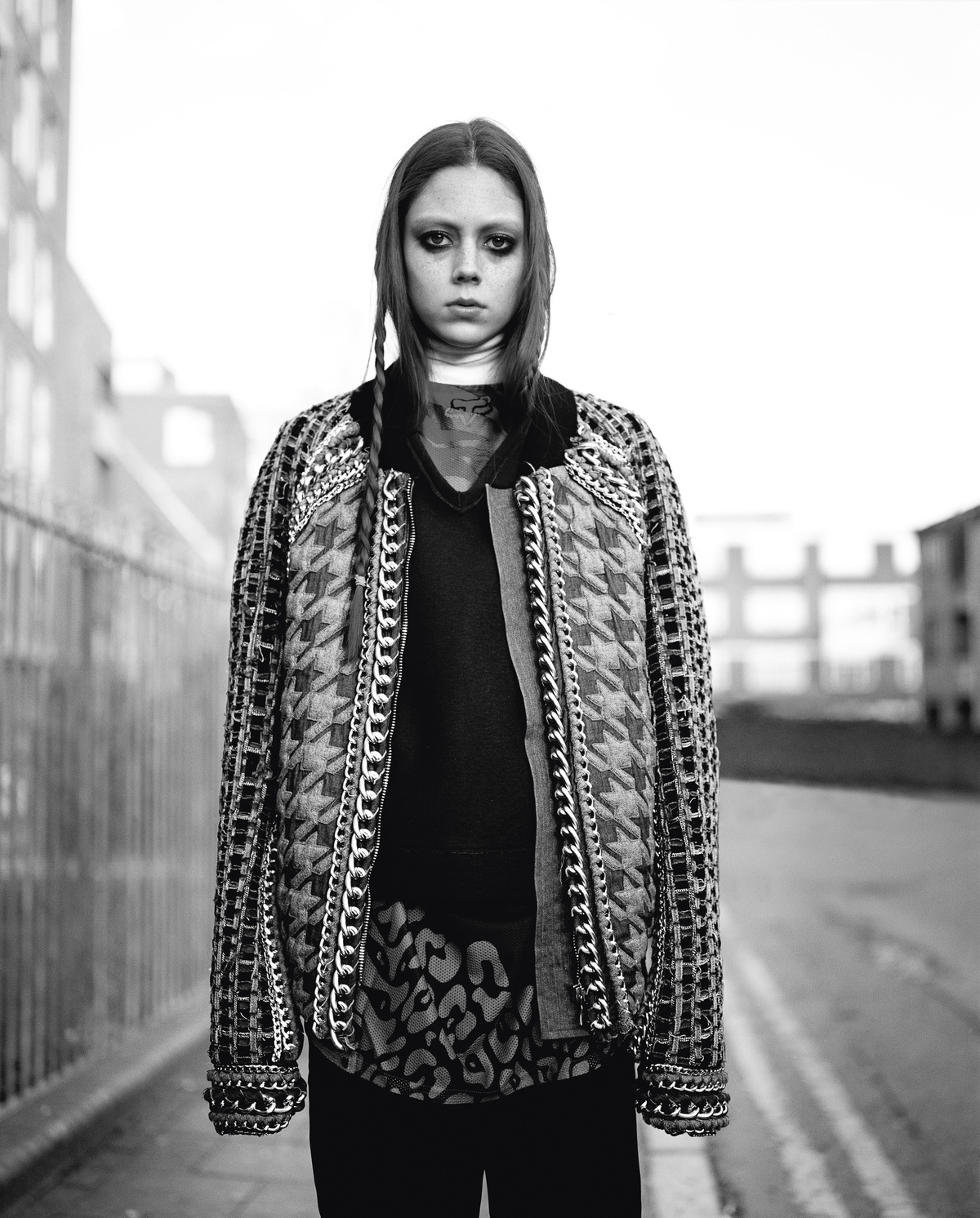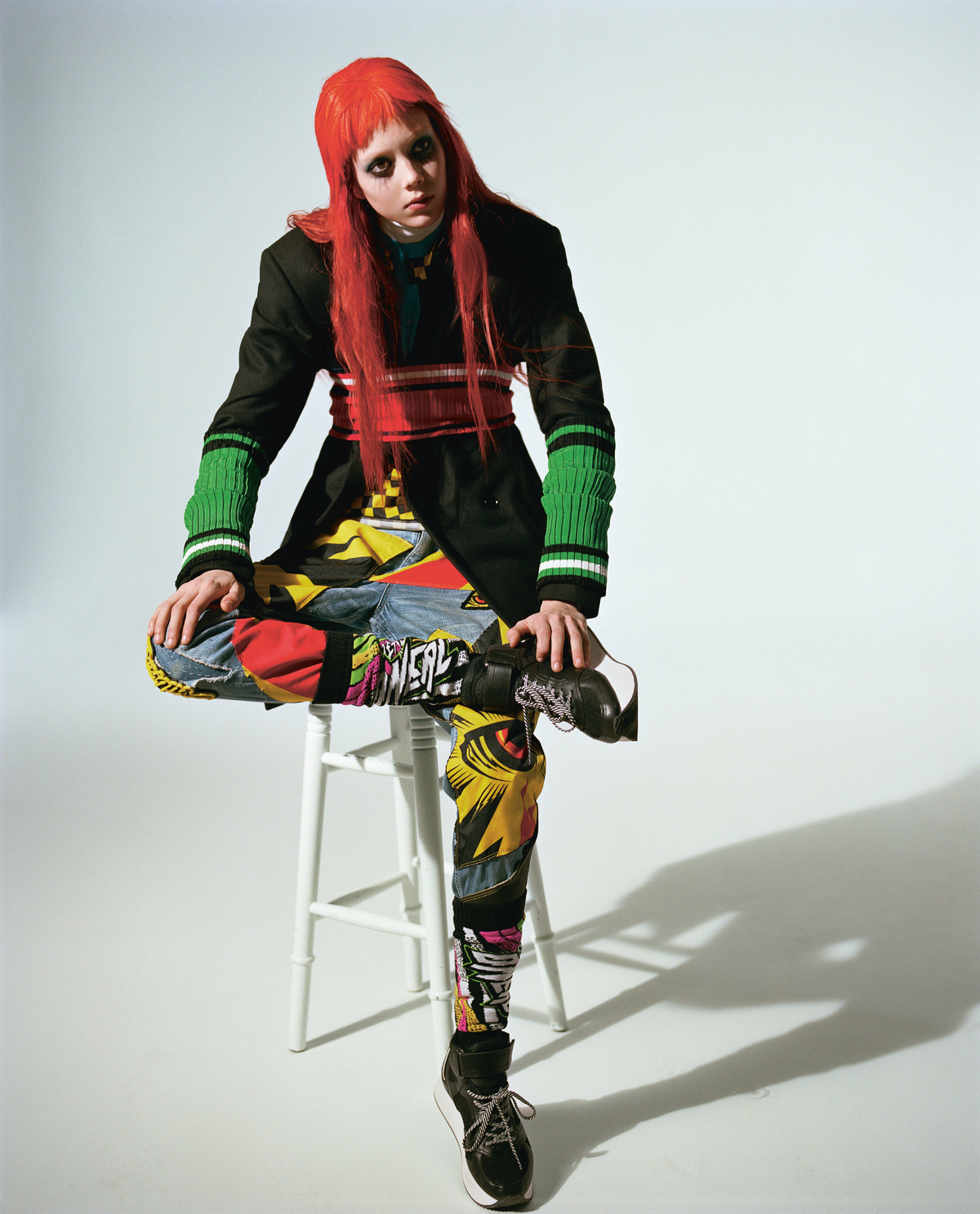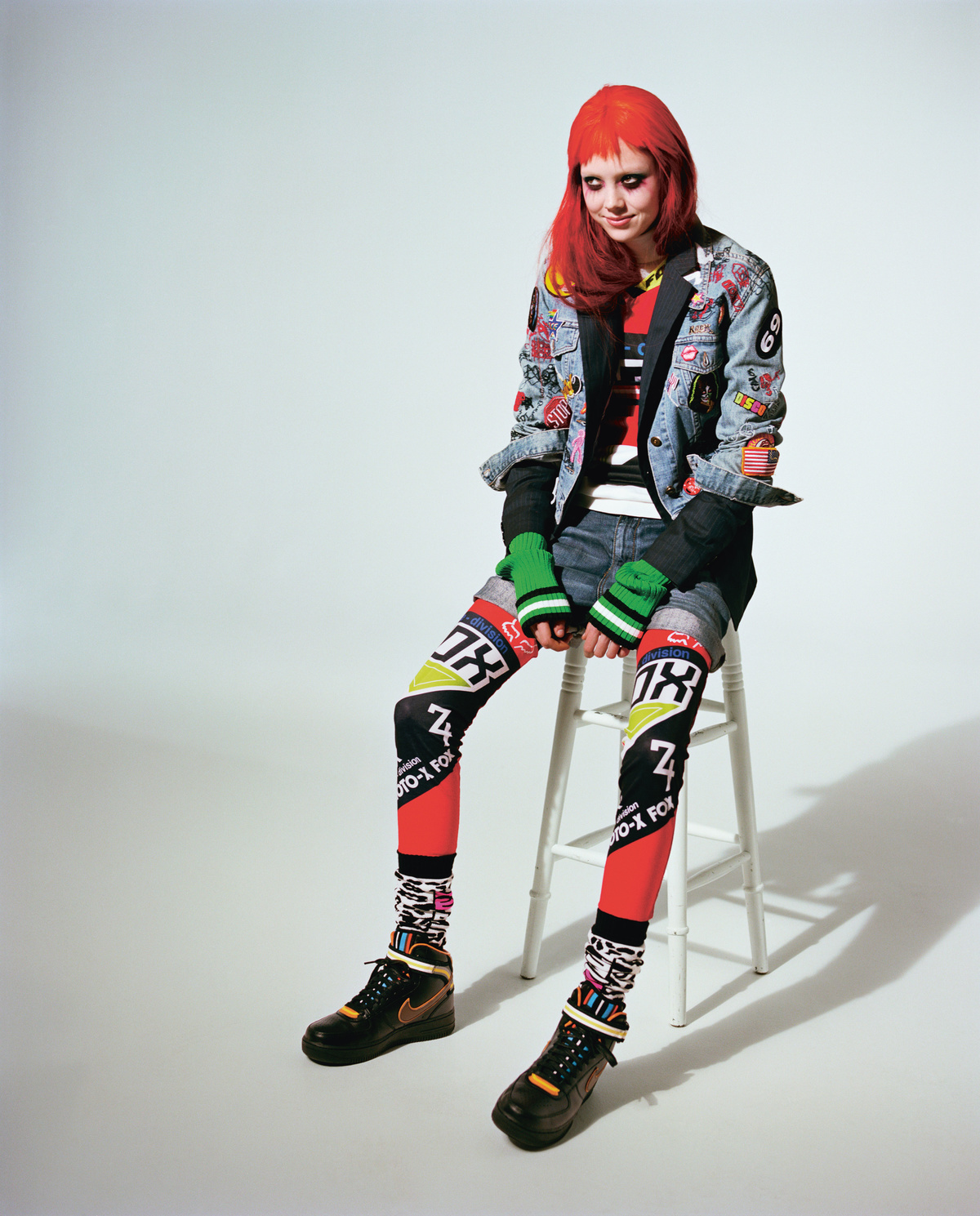 Jacket vintage at Rellik customised by Eunkyeng Seo using patches from Mint Vintage and Jennie Maizels. Jacket (worn underneath) DKNY. Top Fox by Freestyle Extreme. Roll Neck Uniqlo. Bra and leg warmers (used on arms) Prada. Shorts R13. Leggings Fox.