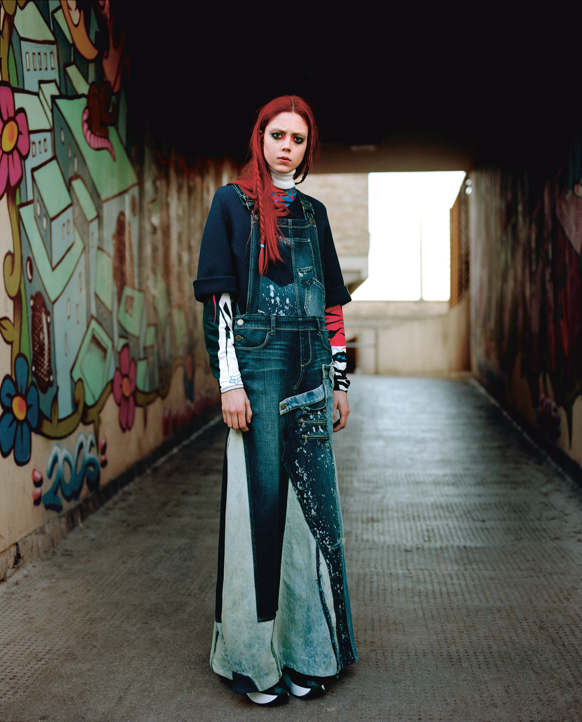 Paige dungarees customised into dress by Miki Fukai. Top Fox at Freestyle Extreme. Jumper J Brand. Roll neck Uniqlo. Shoes DKNY.