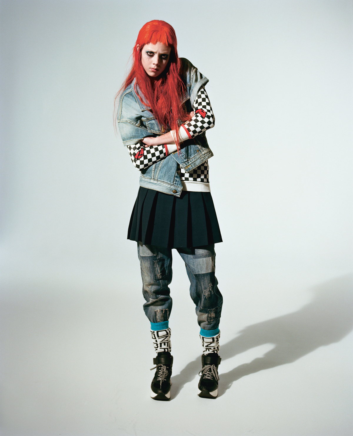 Jacket R13. Top One Industries. Skirt Prada. Jeans Jean Paul Gaultier. Socks O'Neal. Shoes DKNY.