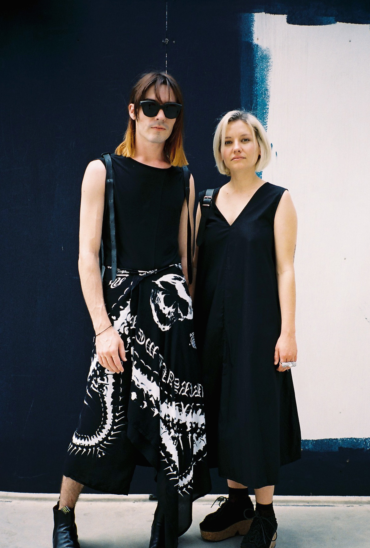 Jarrod: Sunglasses by Kuboraum Berlin, a tank that cost too much for me to have reasonably forgotten the designer (the tag has fallen off), a shawl by Skingraft that I wear as a sarong, RM Williams boots, leather backpack by Kate of Arcadia.