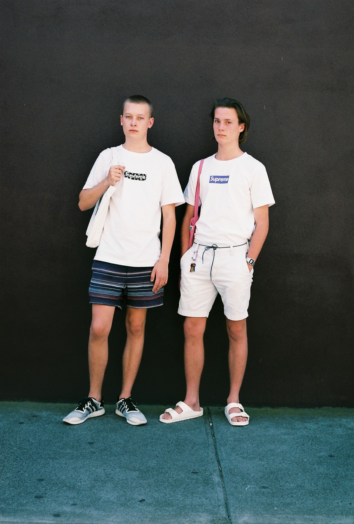 Tristan: Supreme tee, shorts, Birkenstocks.