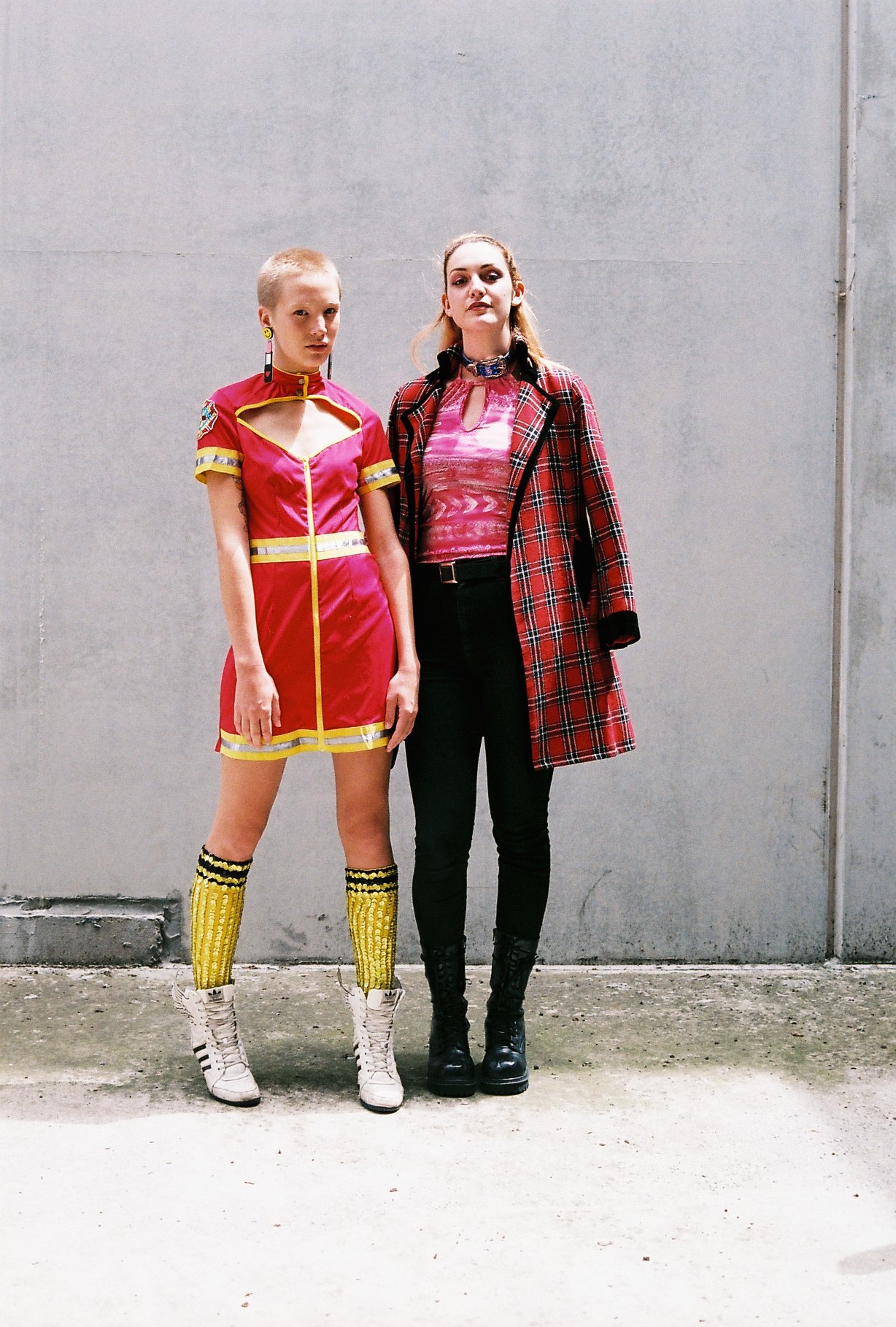 Hayley: Earrings, doodad and fandango dress, some weird op-shop fire-fighter dress-up socks, Discount Universe Shoes, Jeremy Scott x Adidas.