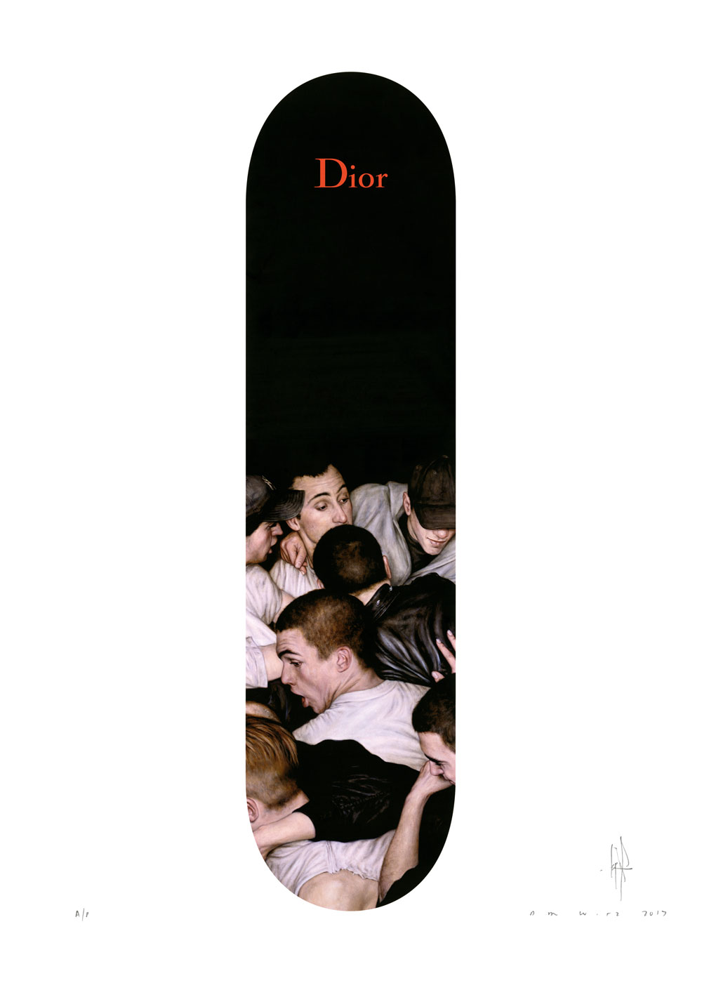 Not that he really understands why people find the paintings so captivating. “The artist’s curse is self-blindness — a near complete lack of objectivity about their own work. But I suspect that the popularity has got to involve a lot more than a shared past in mosh pits…” The collection is now in stores, and has resulted too in a limited edition skate deck, and a new limited edition print. It’s been quite a journey, then, from illegally painting his art on the streets to collaborating with Dior. “It’s just kind of happened,” he suggests. “I mean, there’s no master plan.”
