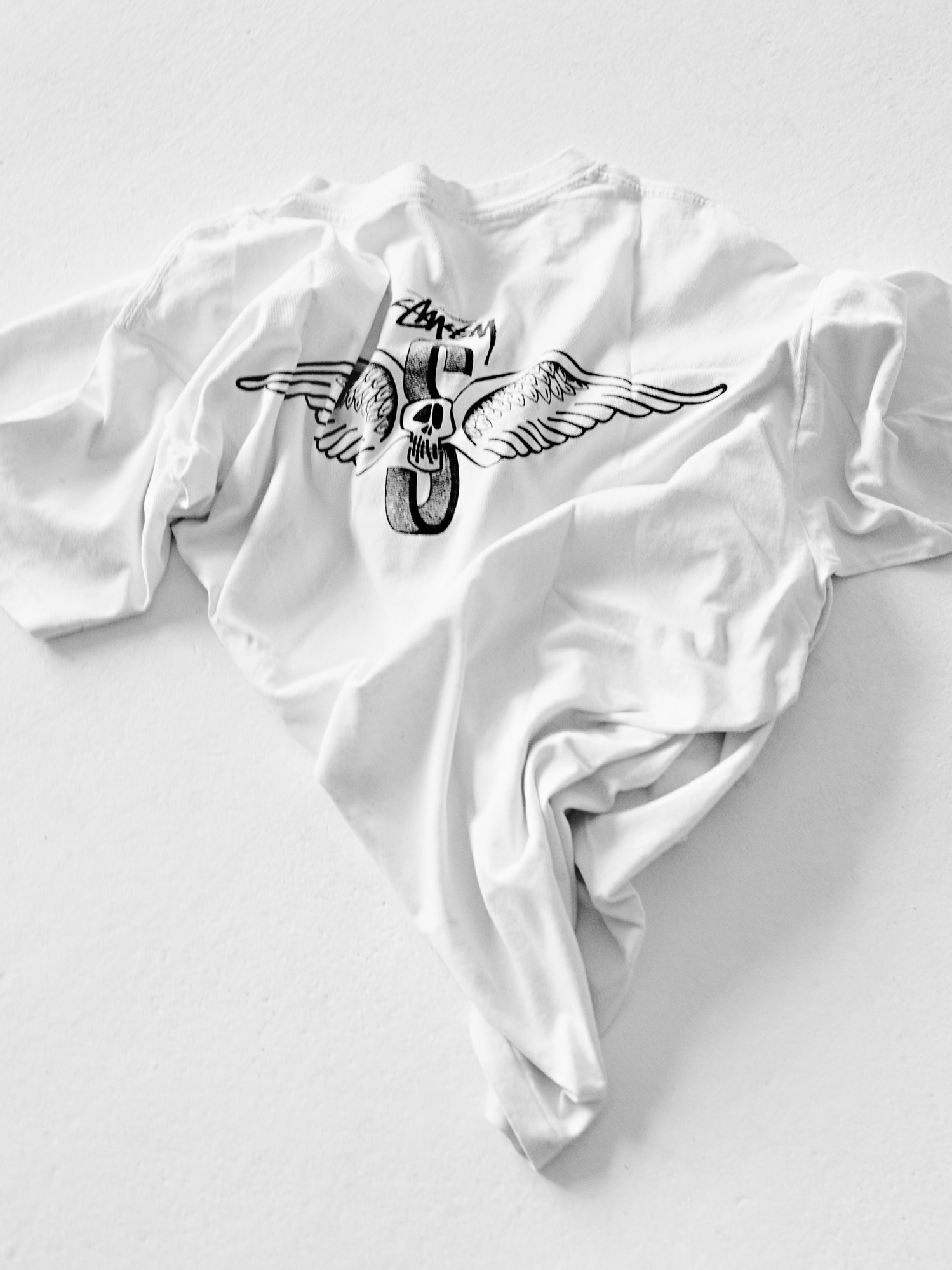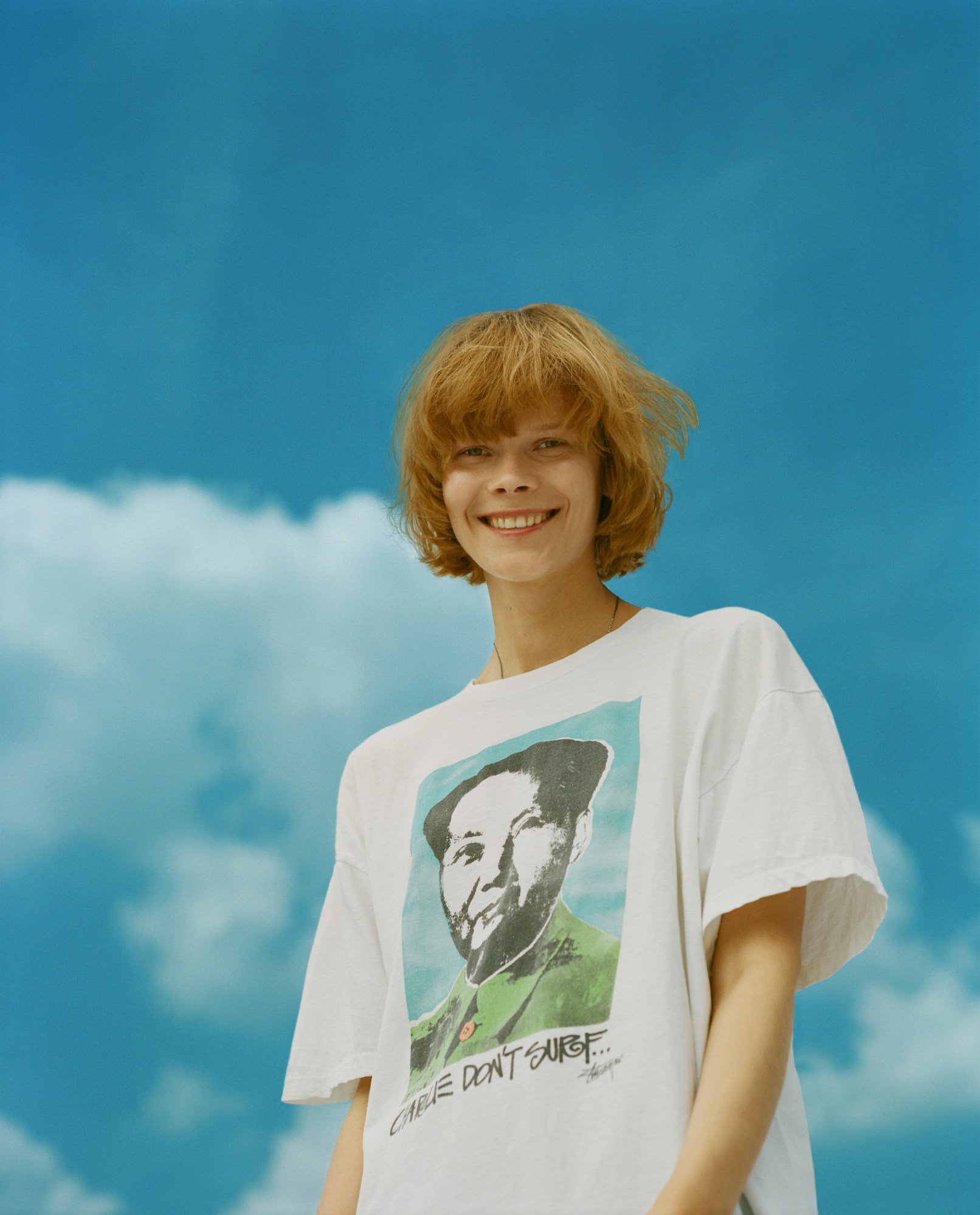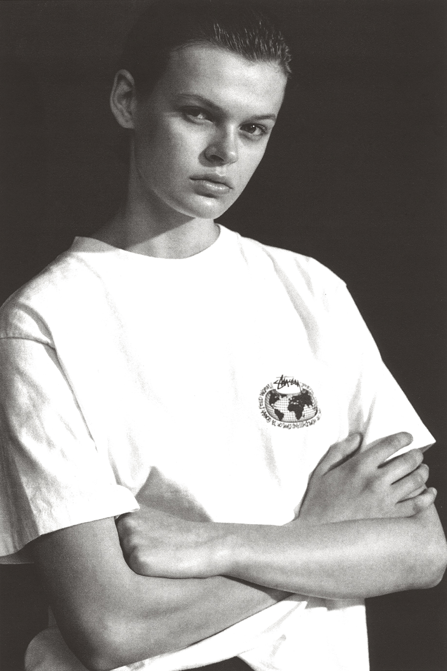 AM: I was in Northern Ireland surfing whenever I didn’t have to be at school. I remember, in the 90s, I had this sweatshirt with a character on the front — a guy with a little broken crown. It said “Knowledge is King.” I wore that sweatshirt to death. I don’t even know how I got it. Someone must have bought it for me because it was before I had spending money. And the silhouette we’ve done for the new special edition tee is based in-part on that sweatshirt, on that crown character. It’s also partly based on the picture of Natalie Westling, Willy [Vanderperre] and I did for i-D. Natalie is wearing a Stüssy shirt over her arms. So we took that silhouette and played with it. Now, the graphic feels very much felt like a nod to the old-school 80s Stüssy.