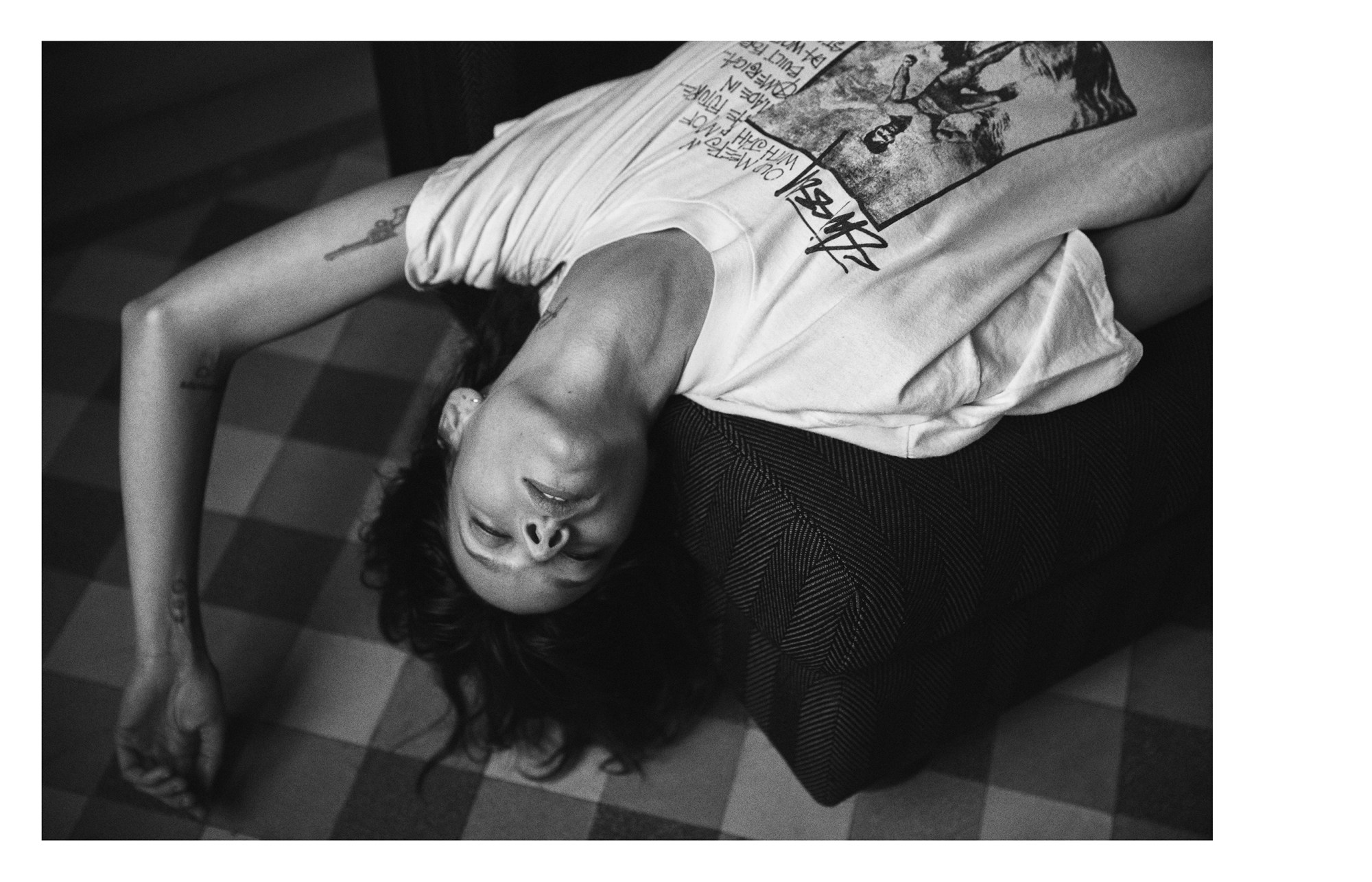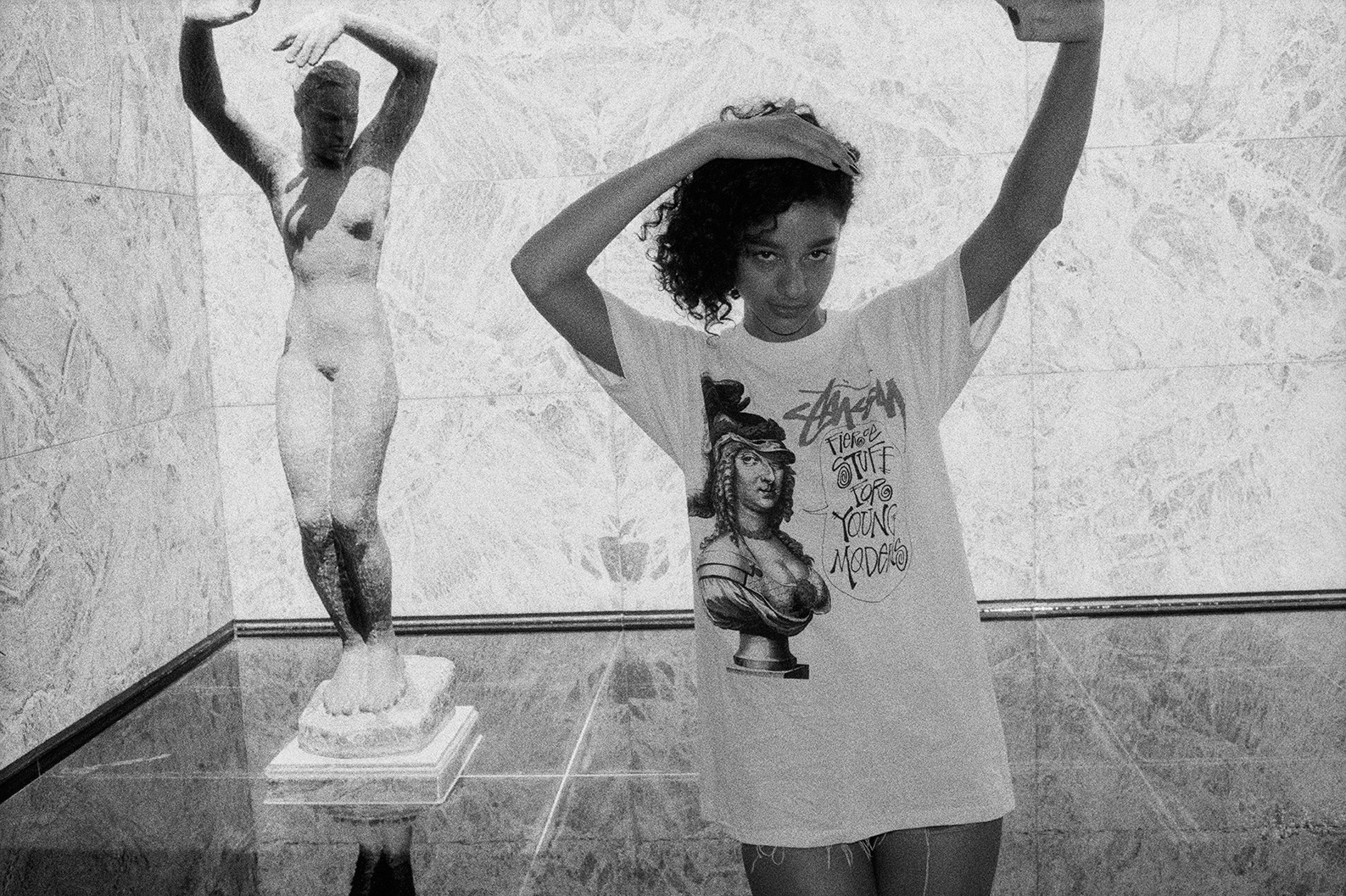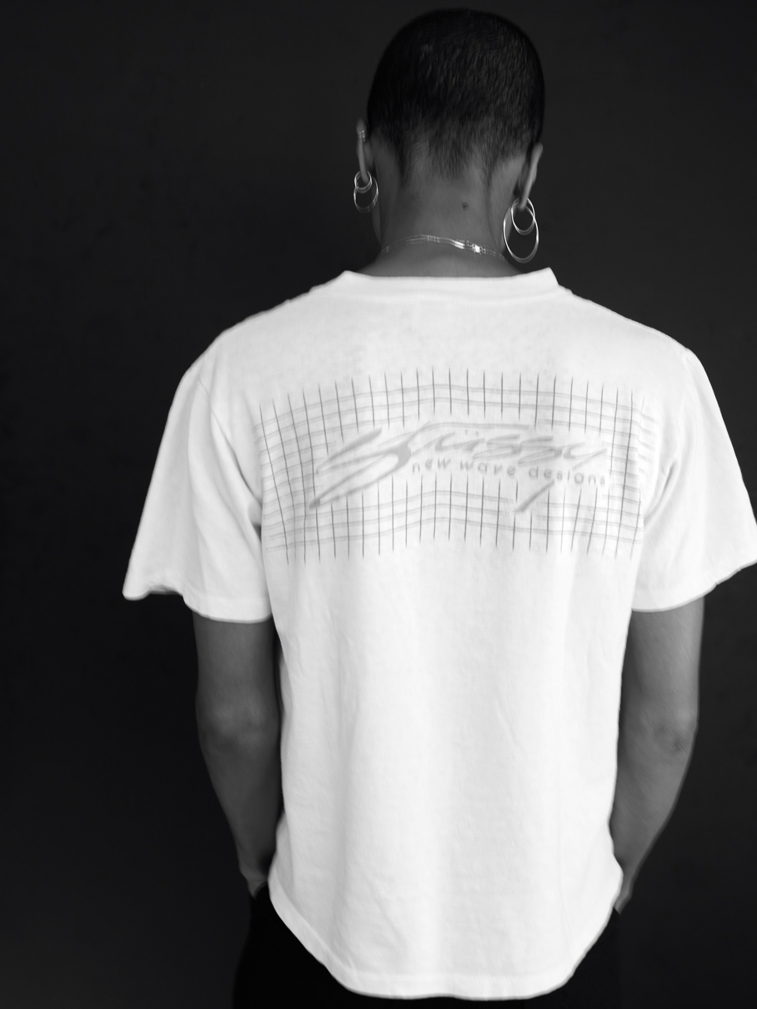 AM: I was in Northern Ireland surfing whenever I didn’t have to be at school. I remember, in the 90s, I had this sweatshirt with a character on the front — a guy with a little broken crown. It said “Knowledge is King.” I wore that sweatshirt to death. I don’t even know how I got it. Someone must have bought it for me because it was before I had spending money. And the silhouette we’ve done for the new special edition tee is based in-part on that sweatshirt, on that crown character. It’s also partly based on the picture of Natalie Westling, Willy [Vanderperre] and I did for i-D. Natalie is wearing a Stüssy shirt over her arms. So we took that silhouette and played with it. Now, the graphic feels very much felt like a nod to the old-school 80s Stüssy.